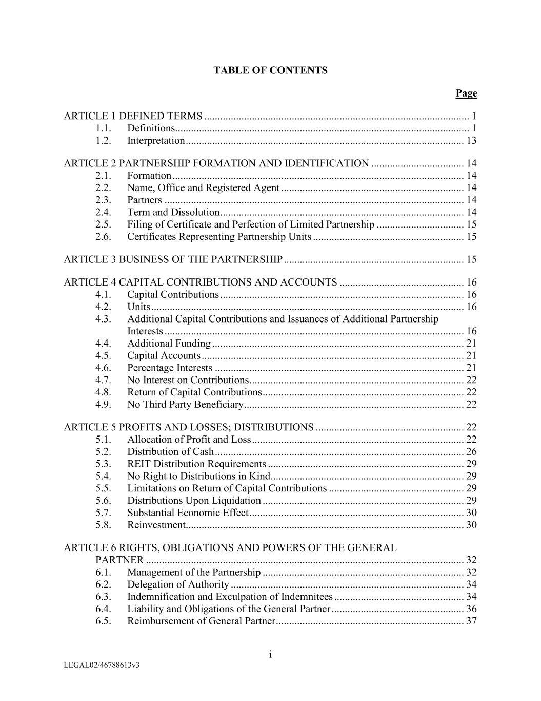i LEGAL02/46788613v3 TABLE OF CONTENTS Page ARTICLE 1 DEFINED TERMS .................................................................................................... 1 1.1. Definitions............................................................................................................... 1 1.2. Interpretation ......................................................................................................... 13 ARTICLE 2 PARTNERSHIP FORMATION AND IDENTIFICATION ................................... 14 2.1. Formation .............................................................................................................. 14 2.2. Name, Office and Registered Agent ..................................................................... 14 2.3. Partners ................................................................................................................. 14 2.4. Term and Dissolution ............................................................................................ 14 2.5. Filing of Certificate and Perfection of Limited Partnership ................................. 15 2.6. Certificates Representing Partnership Units ......................................................... 15 ARTICLE 3 BUSINESS OF THE PARTNERSHIP .................................................................... 15 ARTICLE 4 CAPITAL CONTRIBUTIONS AND ACCOUNTS ............................................... 16 4.1. Capital Contributions ............................................................................................ 16 4.2. Units ...................................................................................................................... 16 4.3. Additional Capital Contributions and Issuances of Additional Partnership Interests ................................................................................................................. 16 4.4. Additional Funding ............................................................................................... 21 4.5. Capital Accounts ................................................................................................... 21 4.6. Percentage Interests .............................................................................................. 21 4.7. No Interest on Contributions ................................................................................. 22 4.8. Return of Capital Contributions ............................................................................ 22 4.9. No Third Party Beneficiary ................................................................................... 22 ARTICLE 5 PROFITS AND LOSSES; DISTRIBUTIONS ........................................................ 22 5.1. Allocation of Profit and Loss ................................................................................ 22 5.2. Distribution of Cash .............................................................................................. 26 5.3. REIT Distribution Requirements .......................................................................... 29 5.4. No Right to Distributions in Kind ......................................................................... 29 5.5. Limitations on Return of Capital Contributions ................................................... 29 5.6. Distributions Upon Liquidation ............................................................................ 29 5.7. Substantial Economic Effect ................................................................................. 30 5.8. Reinvestment......................................................................................................... 30 ARTICLE 6 RIGHTS, OBLIGATIONS AND POWERS OF THE GENERAL PARTNER ........................................................................................................................ 32 6.1. Management of the Partnership ............................................................................ 32 6.2. Delegation of Authority ........................................................................................ 34 6.3. Indemnification and Exculpation of Indemnitees ................................................. 34 6.4. Liability and Obligations of the General Partner .................................................. 36 6.5. Reimbursement of General Partner ....................................................................... 37