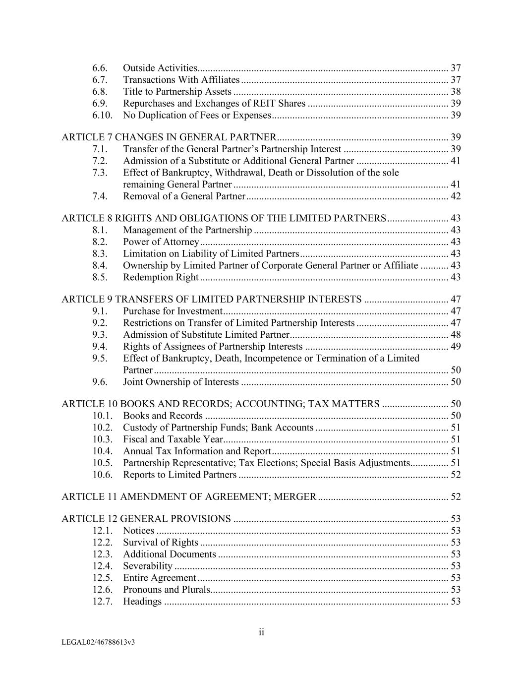 ii LEGAL02/46788613v3 6.6. Outside Activities.................................................................................................. 37 6.7. Transactions With Affiliates ................................................................................. 37 6.8. Title to Partnership Assets .................................................................................... 38 6.9. Repurchases and Exchanges of REIT Shares ....................................................... 39 6.10. No Duplication of Fees or Expenses ..................................................................... 39 ARTICLE 7 CHANGES IN GENERAL PARTNER ................................................................... 39 7.1. Transfer of the General Partner’s Partnership Interest ......................................... 39 7.2. Admission of a Substitute or Additional General Partner .................................... 41 7.3. Effect of Bankruptcy, Withdrawal, Death or Dissolution of the sole remaining General Partner .................................................................................... 41 7.4. Removal of a General Partner ............................................................................... 42 ARTICLE 8 RIGHTS AND OBLIGATIONS OF THE LIMITED PARTNERS ........................ 43 8.1. Management of the Partnership ............................................................................ 43 8.2. Power of Attorney ................................................................................................. 43 8.3. Limitation on Liability of Limited Partners .......................................................... 43 8.4. Ownership by Limited Partner of Corporate General Partner or Affiliate ........... 43 8.5. Redemption Right ................................................................................................. 43 ARTICLE 9 TRANSFERS OF LIMITED PARTNERSHIP INTERESTS ................................. 47 9.1. Purchase for Investment ........................................................................................ 47 9.2. Restrictions on Transfer of Limited Partnership Interests .................................... 47 9.3. Admission of Substitute Limited Partner .............................................................. 48 9.4. Rights of Assignees of Partnership Interests ........................................................ 49 9.5. Effect of Bankruptcy, Death, Incompetence or Termination of a Limited Partner ................................................................................................................... 50 9.6. Joint Ownership of Interests ................................................................................. 50 ARTICLE 10 BOOKS AND RECORDS; ACCOUNTING; TAX MATTERS .......................... 50 10.1. Books and Records ............................................................................................... 50 10.2. Custody of Partnership Funds; Bank Accounts .................................................... 51 10.3. Fiscal and Taxable Year........................................................................................ 51 10.4. Annual Tax Information and Report ..................................................................... 51 10.5. Partnership Representative; Tax Elections; Special Basis Adjustments ............... 51 10.6. Reports to Limited Partners .................................................................................. 52 ARTICLE 11 AMENDMENT OF AGREEMENT; MERGER ................................................... 52 ARTICLE 12 GENERAL PROVISIONS .................................................................................... 53 12.1. Notices .................................................................................................................. 53 12.2. Survival of Rights ................................................................................................. 53 12.3. Additional Documents .......................................................................................... 53 12.4. Severability ........................................................................................................... 53 12.5. Entire Agreement .................................................................................................. 53 12.6. Pronouns and Plurals............................................................................................. 53 12.7. Headings ............................................................................................................... 53