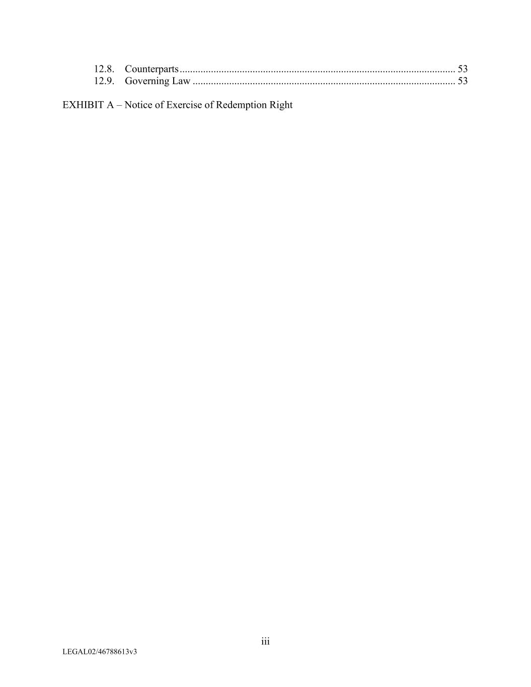 iii LEGAL02/46788613v3 12.8. Counterparts .......................................................................................................... 53 12.9. Governing Law ..................................................................................................... 53 EXHIBIT A – Notice of Exercise of Redemption Right