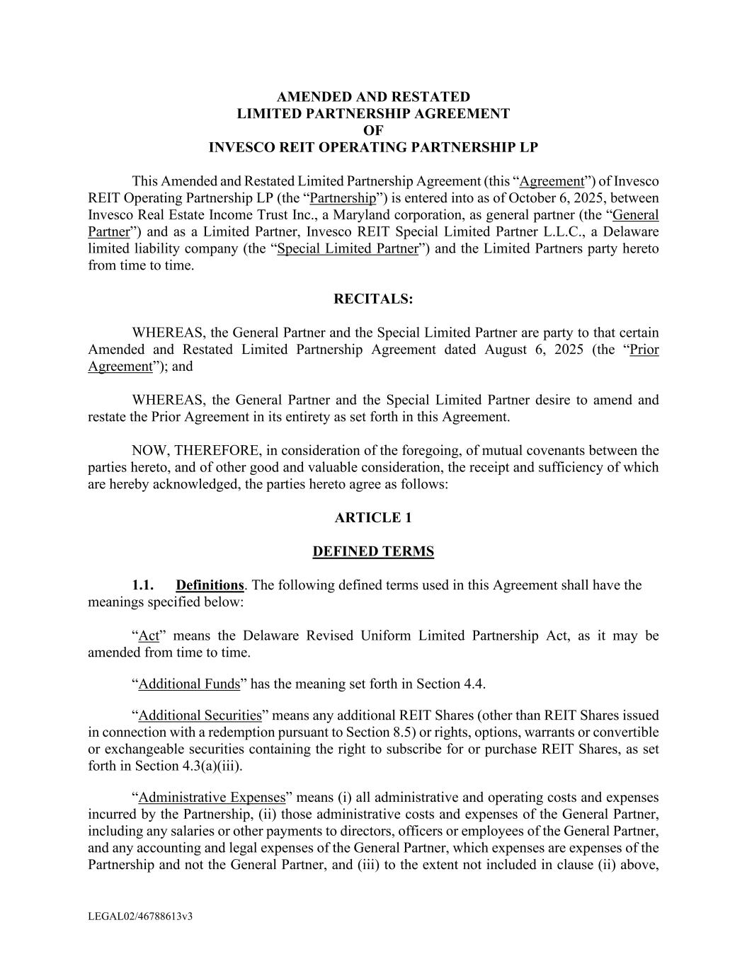 LEGAL02/46788613v3 AMENDED AND RESTATED LIMITED PARTNERSHIP AGREEMENT OF INVESCO REIT OPERATING PARTNERSHIP LP This Amended and Restated Limited Partnership Agreement (this “Agreement”) of Invesco REIT Operating Partnership LP (the “Partnership”) is entered into as of October 6, 2025, between Invesco Real Estate Income Trust Inc., a Maryland corporation, as general partner (the “General Partner”) and as a Limited Partner, Invesco REIT Special Limited Partner L.L.C., a Delaware limited liability company (the “Special Limited Partner”) and the Limited Partners party hereto from time to time. RECITALS: WHEREAS, the General Partner and the Special Limited Partner are party to that certain ▇▇▇▇▇▇▇ and Restated Limited Partnership Agreement dated August 6, 2025 (the “Prior Agreement”); and WHEREAS, the General Partner and the Special Limited Partner desire to amend and restate the Prior Agreement in its entirety as set forth in this Agreement. NOW, THEREFORE, in consideration of the foregoing, of mutual covenants between the parties hereto, and of other good and valuable consideration, the receipt and sufficiency of which are hereby acknowledged, the parties hereto agree as follows: ARTICLE 1 DEFINED TERMS 1.1. Definitions. The following defined terms used in this Agreement shall have the meanings specified below: “Act” means the Delaware Revised Uniform Limited Partnership Act, as it may be amended from time to time. “Additional Funds” has the meaning set forth in Section 4.4. “Additional Securities” means any additional REIT Shares (other than REIT Shares issued in connection with a redemption pursuant to Section 8.5) or rights, options, warrants or convertible or exchangeable securities containing the right to subscribe for or purchase REIT Shares, as set forth in Section 4.3(a)(iii). “Administrative Expenses” means (i) all administrative and operating costs and expenses incurred by the Partnership, (ii) those administrative costs and expenses of the General Partner, including any salaries or other payments to directors, officers or employees of the General Partner, and any accounting and legal expenses of the General Partner, which expenses are expenses of the Partnership and not the General Partner, and (iii) to the extent not included in clause (ii) above,