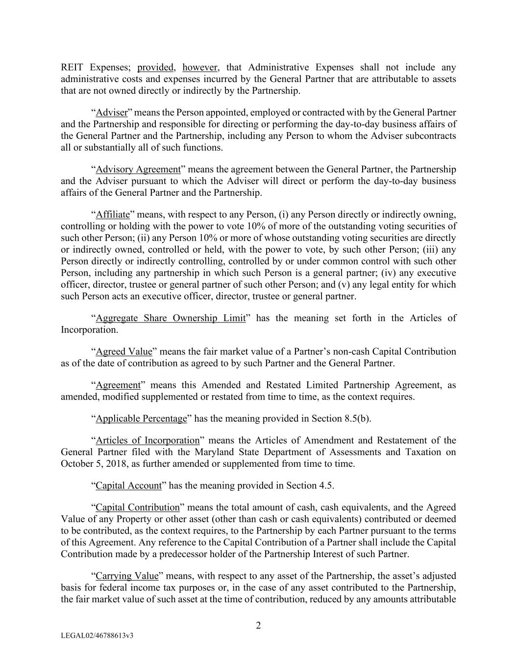 2 LEGAL02/46788613v3 REIT Expenses; provided, however, that Administrative Expenses shall not include any administrative costs and expenses incurred by the General Partner that are attributable to assets that are not owned directly or indirectly by the Partnership. “Adviser” means the Person appointed, employed or contracted with by the General Partner and the Partnership and responsible for directing or performing the day-to-day business affairs of the General Partner and the Partnership, including any Person to whom the Adviser subcontracts all or substantially all of such functions. “Advisory Agreement” means the agreement between the General Partner, the Partnership and the Adviser pursuant to which the Adviser will direct or perform the day-to-day business affairs of the General Partner and the Partnership. “Affiliate” means, with respect to any Person, (i) any Person directly or indirectly owning, controlling or holding with the power to vote 10% of more of the outstanding voting securities of such other Person; (ii) any Person 10% or more of whose outstanding voting securities are directly or indirectly owned, controlled or held, with the power to vote, by such other Person; (iii) any Person directly or indirectly controlling, controlled by or under common control with such other Person, including any partnership in which such Person is a general partner; (iv) any executive officer, director, trustee or general partner of such other Person; and (v) any legal entity for which such Person acts an executive officer, director, trustee or general partner. “Aggregate Share Ownership Limit” has the meaning set forth in the Articles of Incorporation. “Agreed Value” means the fair market value of a Partner’s non-cash Capital Contribution as of the date of contribution as agreed to by such Partner and the General Partner. “Agreement” means this Amended and Restated Limited Partnership Agreement, as amended, modified supplemented or restated from time to time, as the context requires. “Applicable Percentage” has the meaning provided in Section 8.5(b). “Articles of Incorporation” means the Articles of Amendment and Restatement of the General Partner filed with the Maryland State Department of Assessments and Taxation on October 5, 2018, as further amended or supplemented from time to time. “Capital Account” has the meaning provided in Section 4.5. “Capital Contribution” means the total amount of cash, cash equivalents, and the Agreed Value of any Property or other asset (other than cash or cash equivalents) contributed or deemed to be contributed, as the context requires, to the Partnership by each Partner pursuant to the terms of this Agreement. Any reference to the Capital Contribution of a Partner shall include the Capital Contribution made by a predecessor holder of the Partnership Interest of such Partner. “Carrying Value” means, with respect to any asset of the Partnership, the asset’s adjusted basis for federal income tax purposes or, in the case of any asset contributed to the Partnership, the fair market value of such asset at the time of contribution, reduced by any amounts attributable