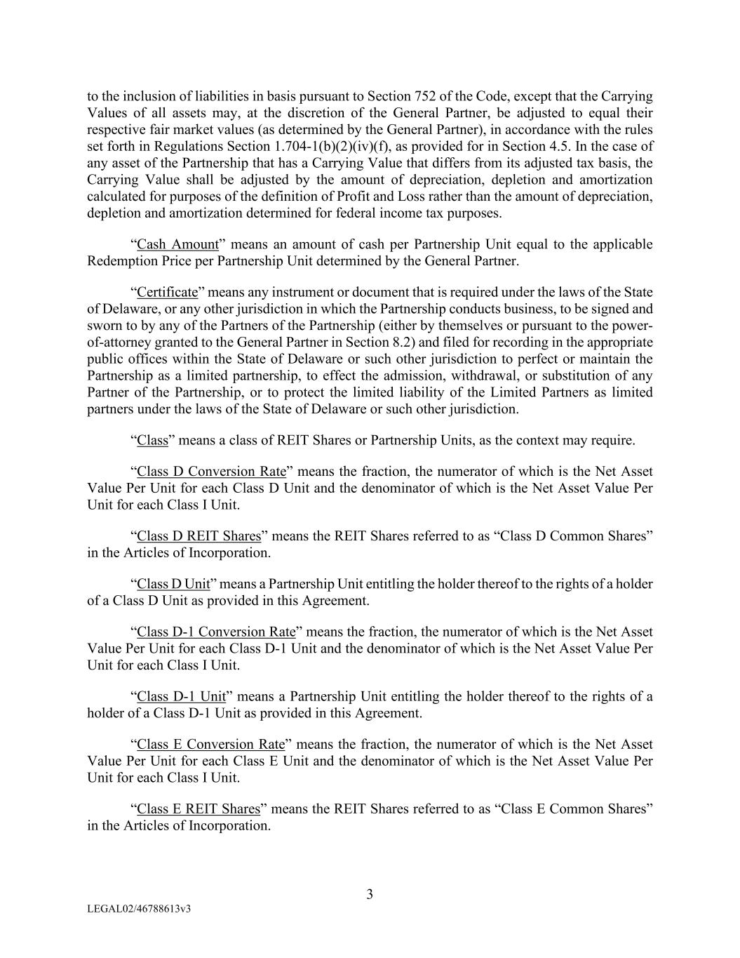 3 LEGAL02/46788613v3 to the inclusion of liabilities in basis pursuant to Section 752 of the Code, except that the Carrying Values of all assets may, at the discretion of the General Partner, be adjusted to equal their respective fair market values (as determined by the General Partner), in accordance with the rules set forth in Regulations Section 1.704-1(b)(2)(iv)(f), as provided for in Section 4.5. In the case of any asset of the Partnership that has a Carrying Value that differs from its adjusted tax basis, the Carrying Value shall be adjusted by the amount of depreciation, depletion and amortization calculated for purposes of the definition of Profit and Loss rather than the amount of depreciation, depletion and amortization determined for federal income tax purposes. “Cash Amount” means an amount of cash per Partnership Unit equal to the applicable Redemption Price per Partnership Unit determined by the General Partner. “Certificate” means any instrument or document that is required under the laws of the State of Delaware, or any other jurisdiction in which the Partnership conducts business, to be signed and sworn to by any of the Partners of the Partnership (either by themselves or pursuant to the power- of-attorney granted to the General Partner in Section 8.2) and filed for recording in the appropriate public offices within the State of Delaware or such other jurisdiction to perfect or maintain the Partnership as a limited partnership, to effect the admission, withdrawal, or substitution of any Partner of the Partnership, or to protect the limited liability of the Limited Partners as limited partners under the laws of the State of Delaware or such other jurisdiction. “Class” means a class of REIT Shares or Partnership Units, as the context may require. “Class D Conversion Rate” means the fraction, the numerator of which is the Net Asset Value Per Unit for each Class D Unit and the denominator of which is the Net Asset Value Per Unit for each Class I Unit. “Class D REIT Shares” means the REIT Shares referred to as “Class D Common Shares” in the Articles of Incorporation. “Class D Unit” means a Partnership Unit entitling the holder thereof to the rights of a holder of a Class D Unit as provided in this Agreement. “Class D-1 Conversion Rate” means the fraction, the numerator of which is the Net Asset Value Per Unit for each Class D-1 Unit and the denominator of which is the Net Asset Value Per Unit for each Class I Unit. “Class D-1 Unit” means a Partnership Unit entitling the holder thereof to the rights of a holder of a Class D-1 Unit as provided in this Agreement. “Class E Conversion Rate” means the fraction, the numerator of which is the Net Asset Value Per Unit for each Class E Unit and the denominator of which is the Net Asset Value Per Unit for each Class I Unit. “Class E REIT Shares” means the REIT Shares referred to as “Class E Common Shares” in the Articles of Incorporation.