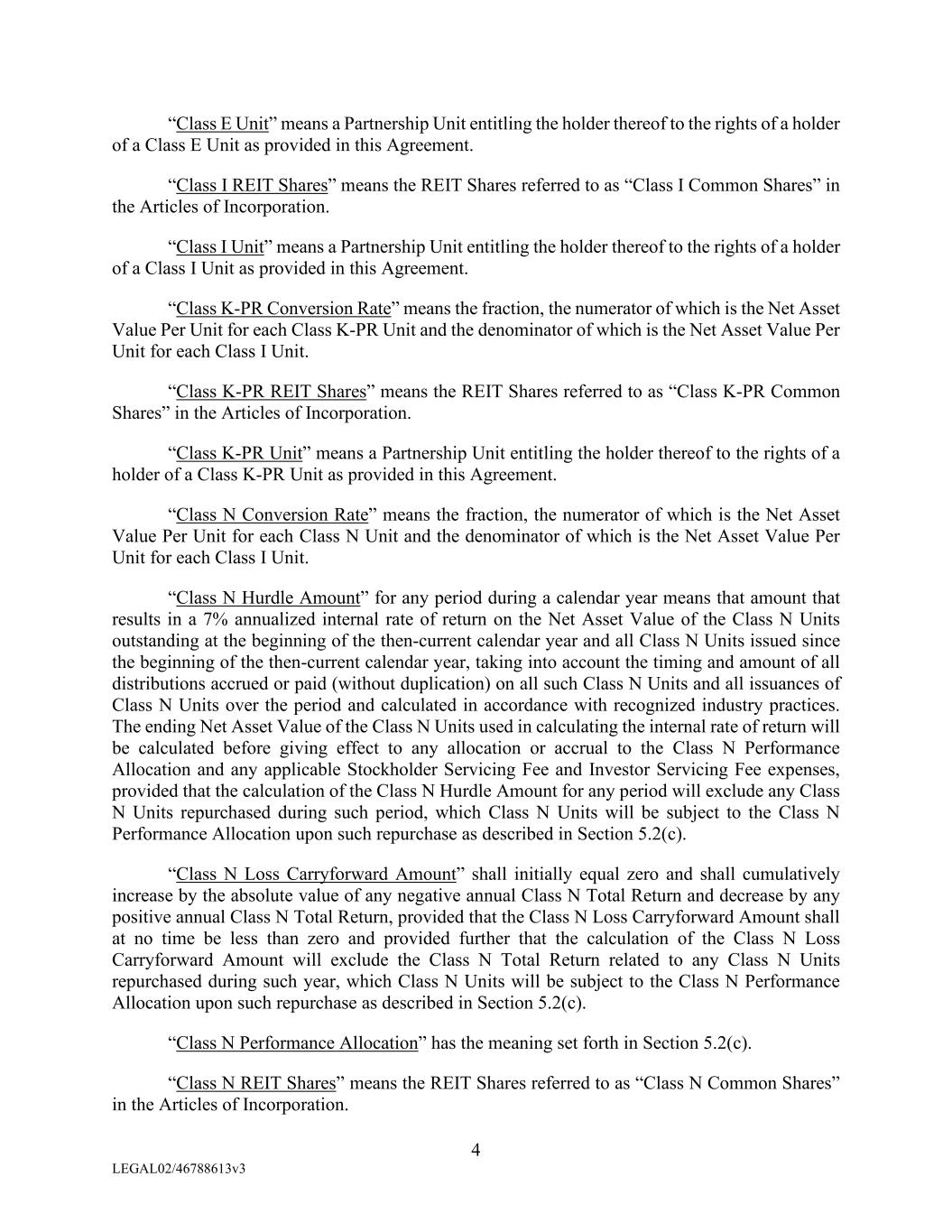 4 LEGAL02/46788613v3 “Class E Unit” means a Partnership Unit entitling the holder thereof to the rights of a holder of a Class E Unit as provided in this Agreement. “Class I REIT Shares” means the REIT Shares referred to as “Class I Common Shares” in the Articles of Incorporation. “Class I Unit” means a Partnership Unit entitling the holder thereof to the rights of a holder of a Class I Unit as provided in this Agreement. “Class K-PR Conversion Rate” means the fraction, the numerator of which is the Net Asset Value Per Unit for each Class K-PR Unit and the denominator of which is the Net Asset Value Per Unit for each Class I Unit. “Class K-PR REIT Shares” means the REIT Shares referred to as “Class K-PR Common Shares” in the Articles of Incorporation. “Class K-PR Unit” means a Partnership Unit entitling the holder thereof to the rights of a holder of a Class K-PR Unit as provided in this Agreement. “Class N Conversion Rate” means the fraction, the numerator of which is the Net Asset Value Per Unit for each Class N Unit and the denominator of which is the Net Asset Value Per Unit for each Class I Unit. “Class N Hurdle Amount” for any period during a calendar year means that amount that results in a 7% annualized internal rate of return on the Net Asset Value of the Class N Units outstanding at the beginning of the then-current calendar year and all Class N Units issued since the beginning of the then-current calendar year, taking into account the timing and amount of all distributions accrued or paid (without duplication) on all such Class N Units and all issuances of Class N Units over the period and calculated in accordance with recognized industry practices. The ending Net Asset Value of the Class N Units used in calculating the internal rate of return will be calculated before giving effect to any allocation or accrual to the Class N Performance Allocation and any applicable Stockholder Servicing Fee and Investor Servicing Fee expenses, provided that the calculation of the Class N Hurdle Amount for any period will exclude any Class N Units repurchased during such period, which Class N Units will be subject to the Class N Performance Allocation upon such repurchase as described in Section 5.2(c). “Class N Loss Carryforward Amount” shall initially equal zero and shall cumulatively increase by the absolute value of any negative annual Class N Total Return and decrease by any positive annual Class N Total Return, provided that the Class N Loss Carryforward Amount shall at no time be less than zero and provided further that the calculation of the Class N Loss Carryforward Amount will exclude the Class N Total Return related to any Class N Units repurchased during such year, which Class N Units will be subject to the Class N Performance Allocation upon such repurchase as described in Section 5.2(c). “Class N Performance Allocation” has the meaning set forth in Section 5.2(c). “Class N REIT Shares” means the REIT Shares referred to as “Class N Common Shares” in the Articles of Incorporation.