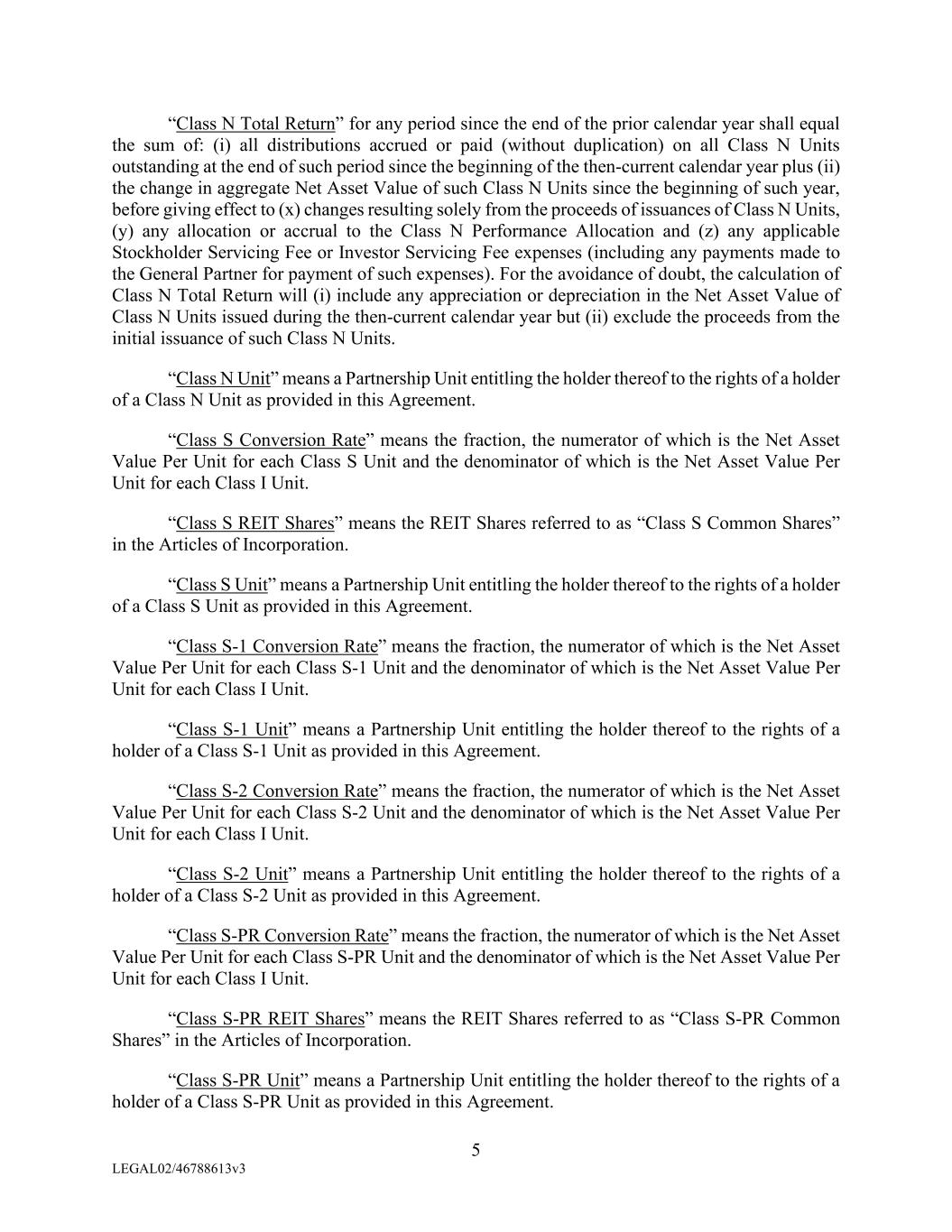 5 LEGAL02/46788613v3 “Class N Total Return” for any period since the end of the prior calendar year shall equal the sum of: (i) all distributions accrued or paid (without duplication) on all Class N Units outstanding at the end of such period since the beginning of the then-current calendar year plus (ii) the change in aggregate Net Asset Value of such Class N Units since the beginning of such year, before giving effect to (x) changes resulting solely from the proceeds of issuances of Class N Units, (y) any allocation or accrual to the Class N Performance Allocation and (z) any applicable Stockholder Servicing Fee or Investor Servicing Fee expenses (including any payments made to the General Partner for payment of such expenses). For the avoidance of doubt, the calculation of Class N Total Return will (i) include any appreciation or depreciation in the Net Asset Value of Class N Units issued during the then-current calendar year but (ii) exclude the proceeds from the initial issuance of such Class N Units. “Class N Unit” means a Partnership Unit entitling the holder thereof to the rights of a holder of a Class N Unit as provided in this Agreement. “Class S Conversion Rate” means the fraction, the numerator of which is the Net Asset Value Per Unit for each Class S Unit and the denominator of which is the Net Asset Value Per Unit for each Class I Unit. “Class S REIT Shares” means the REIT Shares referred to as “Class S Common Shares” in the Articles of Incorporation. “Class S Unit” means a Partnership Unit entitling the holder thereof to the rights of a holder of a Class S Unit as provided in this Agreement. “Class S-1 Conversion Rate” means the fraction, the numerator of which is the Net Asset Value Per Unit for each Class S-1 Unit and the denominator of which is the Net Asset Value Per Unit for each Class I Unit. “Class S-1 Unit” means a Partnership Unit entitling the holder thereof to the rights of a holder of a Class S-1 Unit as provided in this Agreement. “Class S-2 Conversion Rate” means the fraction, the numerator of which is the Net Asset Value Per Unit for each Class S-2 Unit and the denominator of which is the Net Asset Value Per Unit for each Class I Unit. “Class S-2 Unit” means a Partnership Unit entitling the holder thereof to the rights of a holder of a Class S-2 Unit as provided in this Agreement. “Class S-PR Conversion Rate” means the fraction, the numerator of which is the Net Asset Value Per Unit for each Class S-PR Unit and the denominator of which is the Net Asset Value Per Unit for each Class I Unit. “Class S-PR REIT Shares” means the REIT Shares referred to as “Class S-PR Common Shares” in the Articles of Incorporation. “Class S-PR Unit” means a Partnership Unit entitling the holder thereof to the rights of a holder of a Class S-PR Unit as provided in this Agreement.
