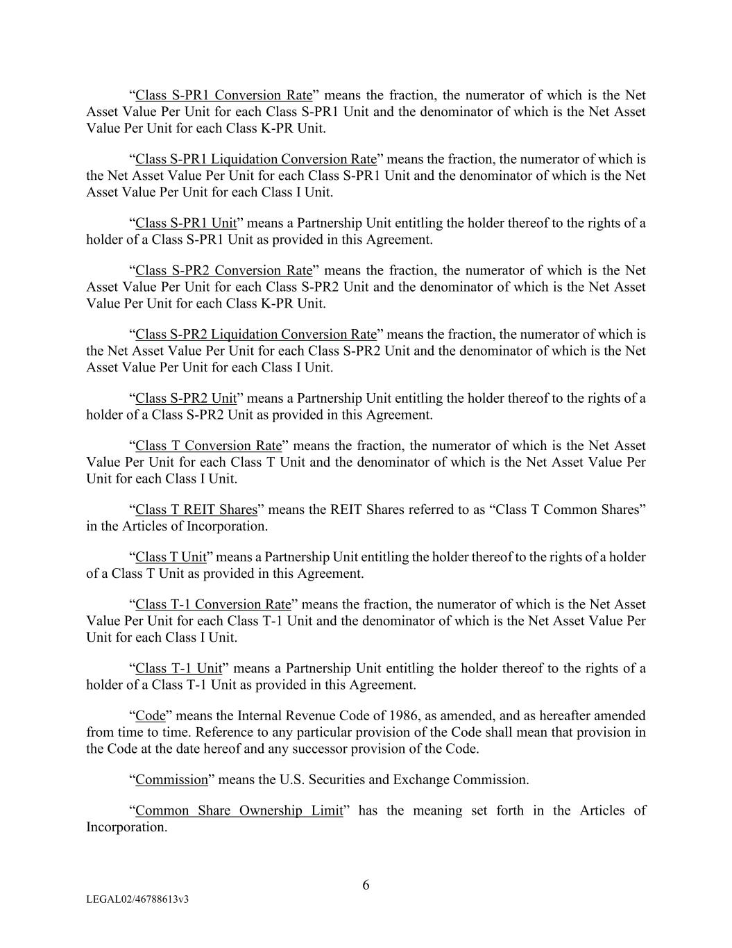 6 LEGAL02/46788613v3 “Class S-PR1 Conversion Rate” means the fraction, the numerator of which is the Net Asset Value Per Unit for each Class S-PR1 Unit and the denominator of which is the Net Asset Value Per Unit for each Class K-PR Unit. “Class S-PR1 Liquidation Conversion Rate” means the fraction, the numerator of which is the Net Asset Value Per Unit for each Class S-PR1 Unit and the denominator of which is the Net Asset Value Per Unit for each Class I Unit. “Class S-PR1 Unit” means a Partnership Unit entitling the holder thereof to the rights of a holder of a Class S-PR1 Unit as provided in this Agreement. “Class S-PR2 Conversion Rate” means the fraction, the numerator of which is the Net Asset Value Per Unit for each Class S-PR2 Unit and the denominator of which is the Net Asset Value Per Unit for each Class K-PR Unit. “Class S-PR2 Liquidation Conversion Rate” means the fraction, the numerator of which is the Net Asset Value Per Unit for each Class S-PR2 Unit and the denominator of which is the Net Asset Value Per Unit for each Class I Unit. “Class S-PR2 Unit” means a Partnership Unit entitling the holder thereof to the rights of a holder of a Class S-PR2 Unit as provided in this Agreement. “Class T Conversion Rate” means the fraction, the numerator of which is the Net Asset Value Per Unit for each Class T Unit and the denominator of which is the Net Asset Value Per Unit for each Class I Unit. “Class T REIT Shares” means the REIT Shares referred to as “Class T Common Shares” in the Articles of Incorporation. “Class T Unit” means a Partnership Unit entitling the holder thereof to the rights of a holder of a Class T Unit as provided in this Agreement. “Class T-1 Conversion Rate” means the fraction, the numerator of which is the Net Asset Value Per Unit for each Class T-1 Unit and the denominator of which is the Net Asset Value Per Unit for each Class I Unit. “Class T-1 Unit” means a Partnership Unit entitling the holder thereof to the rights of a holder of a Class T-1 Unit as provided in this Agreement. “Code” means the Internal Revenue Code of 1986, as amended, and as hereafter amended from time to time. Reference to any particular provision of the Code shall mean that provision in the Code at the date hereof and any successor provision of the Code. “Commission” means the U.S. Securities and Exchange Commission. “Common Share Ownership Limit” has the meaning set forth in the Articles of Incorporation.