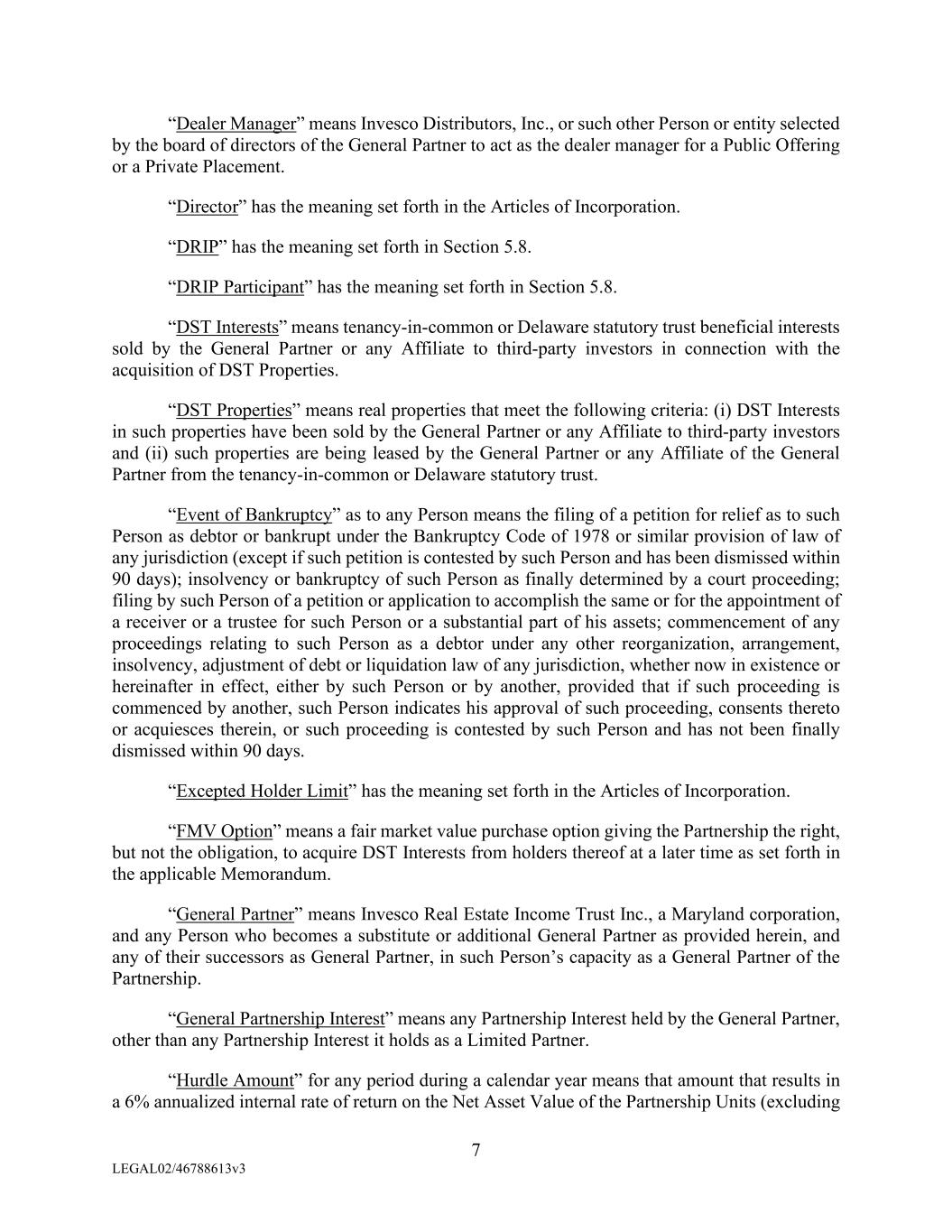7 LEGAL02/46788613v3 “Dealer Manager” means Invesco Distributors, Inc., or such other Person or entity selected by the board of directors of the General Partner to act as the dealer manager for a Public Offering or a Private Placement. “Director” has the meaning set forth in the Articles of Incorporation. “DRIP” has the meaning set forth in Section 5.8. “DRIP Participant” has the meaning set forth in Section 5.8. “DST Interests” means tenancy-in-common or Delaware statutory trust beneficial interests sold by the General Partner or any Affiliate to third-party investors in connection with the acquisition of DST Properties. “DST Properties” means real properties that meet the following criteria: (i) DST Interests in such properties have been sold by the General Partner or any Affiliate to third-party investors and (ii) such properties are being leased by the General Partner or any Affiliate of the General Partner from the tenancy-in-common or Delaware statutory trust. “Event of Bankruptcy” as to any Person means the filing of a petition for relief as to such Person as debtor or bankrupt under the Bankruptcy Code of 1978 or similar provision of law of any jurisdiction (except if such petition is contested by such Person and has been dismissed within 90 days); insolvency or bankruptcy of such Person as finally determined by a court proceeding; filing by such Person of a petition or application to accomplish the same or for the appointment of a receiver or a trustee for such Person or a substantial part of his assets; commencement of any proceedings relating to such Person as a debtor under any other reorganization, arrangement, insolvency, adjustment of debt or liquidation law of any jurisdiction, whether now in existence or hereinafter in effect, either by such Person or by another, provided that if such proceeding is commenced by another, such Person indicates his approval of such proceeding, consents thereto or acquiesces therein, or such proceeding is contested by such Person and has not been finally dismissed within 90 days. “Excepted Holder Limit” has the meaning set forth in the Articles of Incorporation. “FMV Option” means a fair market value purchase option giving the Partnership the right, but not the obligation, to acquire DST Interests from holders thereof at a later time as set forth in the applicable Memorandum. “General Partner” means Invesco Real Estate Income Trust Inc., a Maryland corporation, and any Person who becomes a substitute or additional General Partner as provided herein, and any of their successors as General Partner, in such Person’s capacity as a General Partner of the Partnership. “General Partnership Interest” means any Partnership Interest held by the General Partner, other than any Partnership Interest it holds as a Limited Partner. “Hurdle Amount” for any period during a calendar year means that amount that results in a 6% annualized internal rate of return on the Net Asset Value of the Partnership Units (excluding