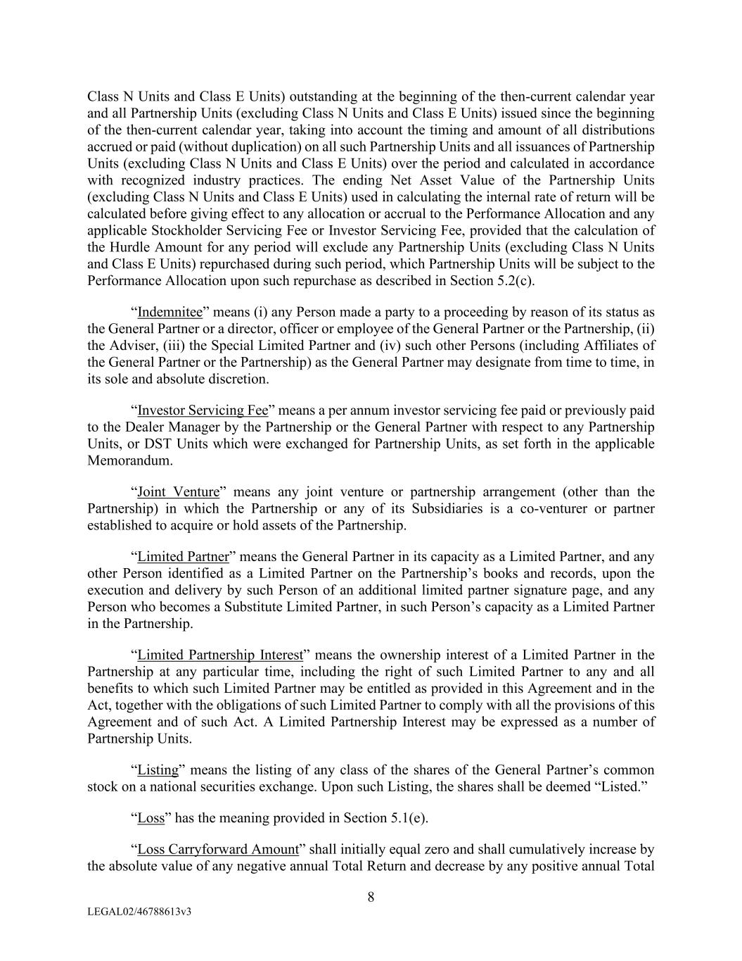 8 LEGAL02/46788613v3 Class N Units and Class E Units) outstanding at the beginning of the then-current calendar year and all Partnership Units (excluding Class N Units and Class E Units) issued since the beginning of the then-current calendar year, taking into account the timing and amount of all distributions accrued or paid (without duplication) on all such Partnership Units and all issuances of Partnership Units (excluding Class N Units and Class E Units) over the period and calculated in accordance with recognized industry practices. The ending Net Asset Value of the Partnership Units (excluding Class N Units and Class E Units) used in calculating the internal rate of return will be calculated before giving effect to any allocation or accrual to the Performance Allocation and any applicable Stockholder Servicing Fee or Investor Servicing Fee, provided that the calculation of the Hurdle Amount for any period will exclude any Partnership Units (excluding Class N Units and Class E Units) repurchased during such period, which Partnership Units will be subject to the Performance Allocation upon such repurchase as described in Section 5.2(c). “Indemnitee” means (i) any Person made a party to a proceeding by reason of its status as the General Partner or a director, officer or employee of the General Partner or the Partnership, (ii) the Adviser, (iii) the Special Limited Partner and (iv) such other Persons (including Affiliates of the General Partner or the Partnership) as the General Partner may designate from time to time, in its sole and absolute discretion. “Investor Servicing Fee” means a per annum investor servicing fee paid or previously paid to the Dealer Manager by the Partnership or the General Partner with respect to any Partnership Units, or DST Units which were exchanged for Partnership Units, as set forth in the applicable Memorandum. “Joint Venture” means any joint venture or partnership arrangement (other than the Partnership) in which the Partnership or any of its Subsidiaries is a co-venturer or partner established to acquire or hold assets of the Partnership. “Limited Partner” means the General Partner in its capacity as a Limited Partner, and any other Person identified as a Limited Partner on the Partnership’s books and records, upon the execution and delivery by such Person of an additional limited partner signature page, and any Person who becomes a Substitute Limited Partner, in such Person’s capacity as a Limited Partner in the Partnership. “Limited Partnership Interest” means the ownership interest of a Limited Partner in the Partnership at any particular time, including the right of such Limited Partner to any and all benefits to which such Limited Partner may be entitled as provided in this Agreement and in the Act, together with the obligations of such Limited Partner to comply with all the provisions of this Agreement and of such Act. A Limited Partnership Interest may be expressed as a number of Partnership Units. “Listing” means the listing of any class of the shares of the General Partner’s common stock on a national securities exchange. Upon such Listing, the shares shall be deemed “Listed.” “Loss” has the meaning provided in Section 5.1(e). “Loss Carryforward Amount” shall initially equal zero and shall cumulatively increase by the absolute value of any negative annual Total Return and decrease by any positive annual Total