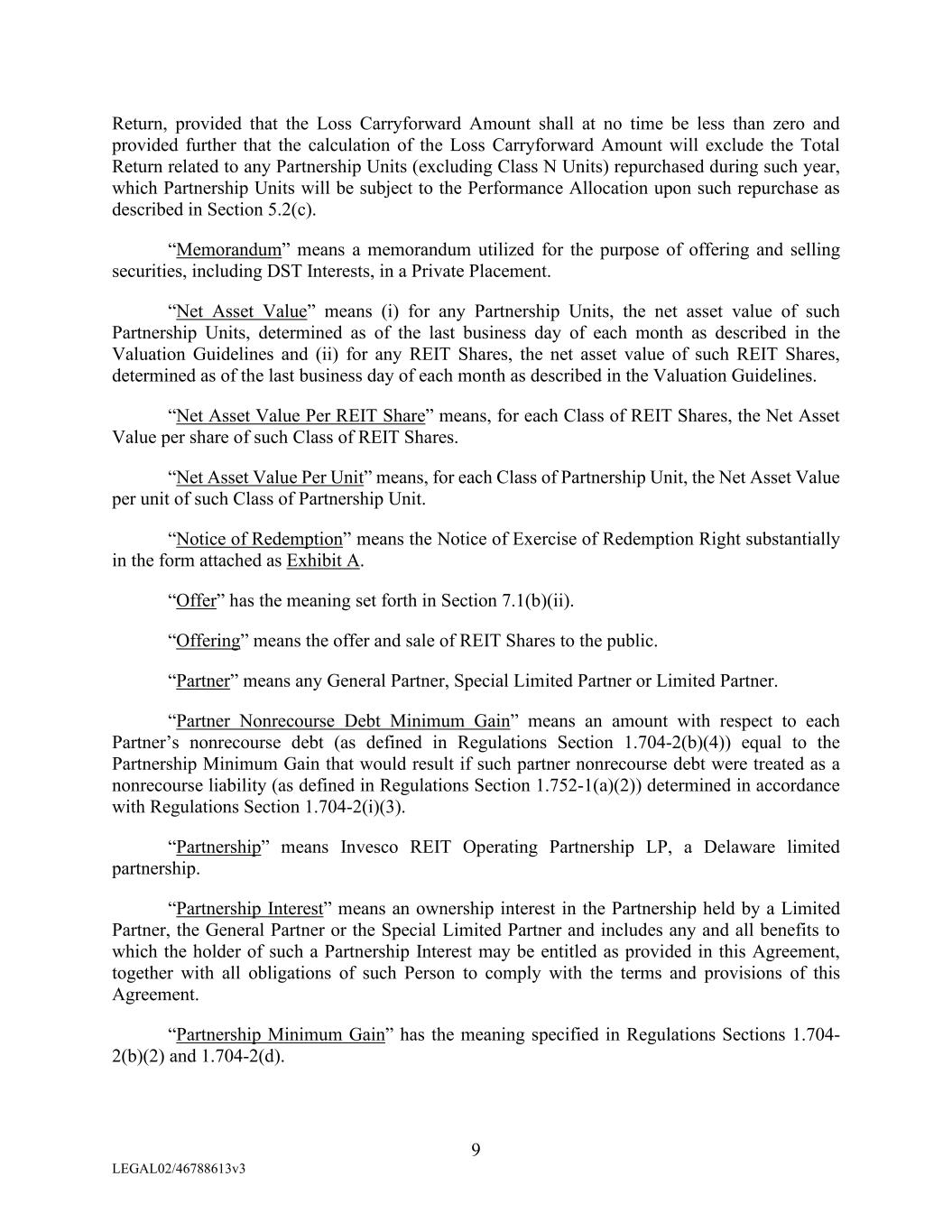 9 LEGAL02/46788613v3 Return, provided that the Loss Carryforward Amount shall at no time be less than zero and provided further that the calculation of the Loss Carryforward Amount will exclude the Total Return related to any Partnership Units (excluding Class N Units) repurchased during such year, which Partnership Units will be subject to the Performance Allocation upon such repurchase as described in Section 5.2(c). “Memorandum” means a memorandum utilized for the purpose of offering and selling securities, including DST Interests, in a Private Placement. “Net Asset Value” means (i) for any Partnership Units, the net asset value of such Partnership Units, determined as of the last business day of each month as described in the Valuation Guidelines and (ii) for any REIT Shares, the net asset value of such REIT Shares, determined as of the last business day of each month as described in the Valuation Guidelines. “Net Asset Value Per REIT Share” means, for each Class of REIT Shares, the Net Asset Value per share of such Class of REIT Shares. “Net Asset Value Per Unit” means, for each Class of Partnership Unit, the Net Asset Value per unit of such Class of Partnership Unit. “Notice of Redemption” means the Notice of Exercise of Redemption Right substantially in the form attached as Exhibit A. “Offer” has the meaning set forth in Section 7.1(b)(ii). “Offering” means the offer and sale of REIT Shares to the public. “Partner” means any General Partner, Special Limited Partner or Limited Partner. “Partner Nonrecourse Debt Minimum Gain” means an amount with respect to each Partner’s nonrecourse debt (as defined in Regulations Section 1.704-2(b)(4)) equal to the Partnership Minimum Gain that would result if such partner nonrecourse debt were treated as a nonrecourse liability (as defined in Regulations Section 1.752-1(a)(2)) determined in accordance with Regulations Section 1.704-2(i)(3). “Partnership” means Invesco REIT Operating Partnership LP, a Delaware limited partnership. “Partnership Interest” means an ownership interest in the Partnership held by a Limited Partner, the General Partner or the Special Limited Partner and includes any and all benefits to which the holder of such a Partnership Interest may be entitled as provided in this Agreement, together with all obligations of such Person to comply with the terms and provisions of this Agreement. “Partnership Minimum Gain” has the meaning specified in Regulations Sections 1.704- 2(b)(2) and 1.704-2(d).