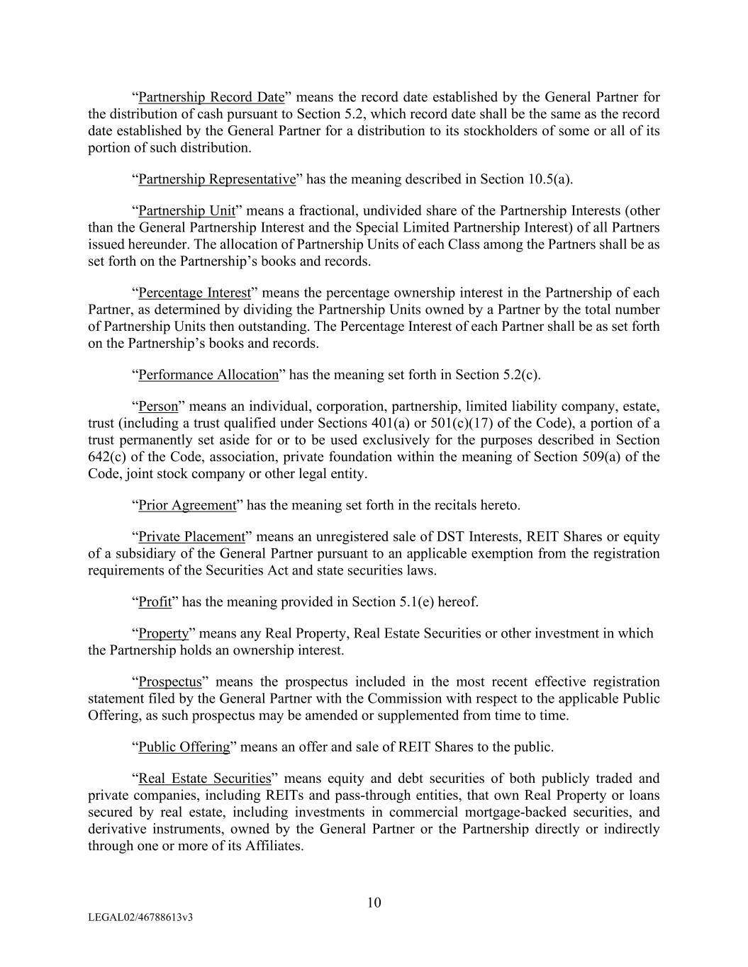10 LEGAL02/46788613v3 “Partnership Record Date” means the record date established by the General Partner for the distribution of cash pursuant to Section 5.2, which record date shall be the same as the record date established by the General Partner for a distribution to its stockholders of some or all of its portion of such distribution. “Partnership Representative” has the meaning described in Section 10.5(a). “Partnership Unit” means a fractional, undivided share of the Partnership Interests (other than the General Partnership Interest and the Special Limited Partnership Interest) of all Partners issued hereunder. The allocation of Partnership Units of each Class among the Partners shall be as set forth on the Partnership’s books and records. “Percentage Interest” means the percentage ownership interest in the Partnership of each Partner, as determined by dividing the Partnership Units owned by a Partner by the total number of Partnership Units then outstanding. The Percentage Interest of each Partner shall be as set forth on the Partnership’s books and records. “Performance Allocation” has the meaning set forth in Section 5.2(c). “Person” means an individual, corporation, partnership, limited liability company, estate, trust (including a trust qualified under Sections 401(a) or 501(c)(17) of the Code), a portion of a trust permanently set aside for or to be used exclusively for the purposes described in Section 642(c) of the Code, association, private foundation within the meaning of Section 509(a) of the Code, joint stock company or other legal entity. “Prior Agreement” has the meaning set forth in the recitals hereto. “Private Placement” means an unregistered sale of DST Interests, REIT Shares or equity of a subsidiary of the General Partner pursuant to an applicable exemption from the registration requirements of the Securities Act and state securities laws. “Profit” has the meaning provided in Section 5.1(e) hereof. “Property” means any Real Property, Real Estate Securities or other investment in which the Partnership holds an ownership interest. “Prospectus” means the prospectus included in the most recent effective registration statement filed by the General Partner with the Commission with respect to the applicable Public Offering, as such prospectus may be amended or supplemented from time to time. “Public Offering” means an offer and sale of REIT Shares to the public. “Real Estate Securities” means equity and debt securities of both publicly traded and private companies, including REITs and pass-through entities, that own Real Property or loans secured by real estate, including investments in commercial mortgage-backed securities, and derivative instruments, owned by the General Partner or the Partnership directly or indirectly through one or more of its Affiliates.