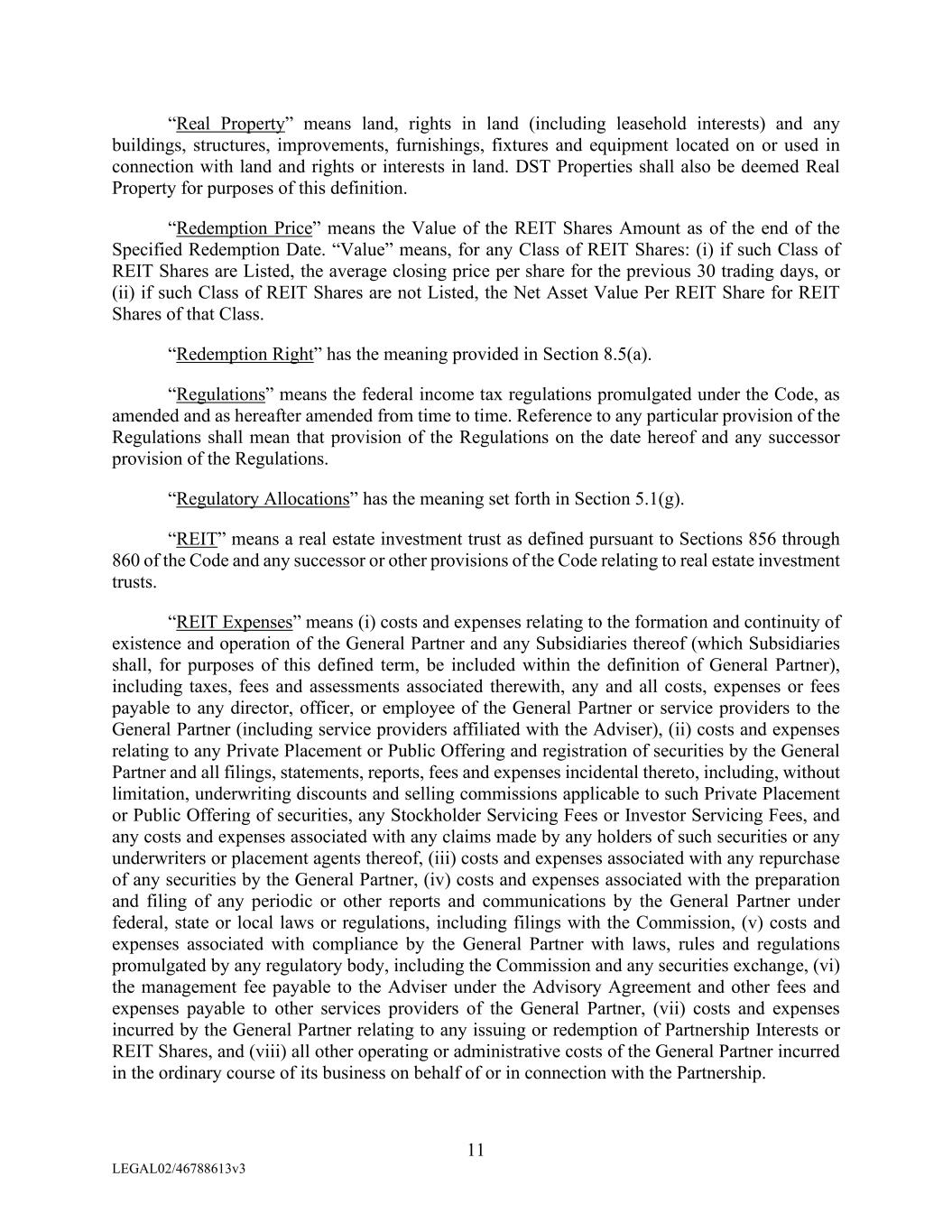 11 LEGAL02/46788613v3 “Real Property” means land, rights in land (including leasehold interests) and any buildings, structures, improvements, furnishings, fixtures and equipment located on or used in connection with land and rights or interests in land. DST Properties shall also be deemed Real Property for purposes of this definition. “Redemption Price” means the Value of the REIT Shares Amount as of the end of the Specified Redemption Date. “Value” means, for any Class of REIT Shares: (i) if such Class of REIT Shares are Listed, the average closing price per share for the previous 30 trading days, or (ii) if such Class of REIT Shares are not Listed, the Net Asset Value Per REIT Share for REIT Shares of that Class. “Redemption Right” has the meaning provided in Section 8.5(a). “Regulations” means the federal income tax regulations promulgated under the Code, as amended and as hereafter amended from time to time. Reference to any particular provision of the Regulations shall mean that provision of the Regulations on the date hereof and any successor provision of the Regulations. “Regulatory Allocations” has the meaning set forth in Section 5.1(g). “REIT” means a real estate investment trust as defined pursuant to Sections 856 through 860 of the Code and any successor or other provisions of the Code relating to real estate investment trusts. “REIT Expenses” means (i) costs and expenses relating to the formation and continuity of existence and operation of the General Partner and any Subsidiaries thereof (which Subsidiaries shall, for purposes of this defined term, be included within the definition of General Partner), including taxes, fees and assessments associated therewith, any and all costs, expenses or fees payable to any director, officer, or employee of the General Partner or service providers to the General Partner (including service providers affiliated with the Adviser), (ii) costs and expenses relating to any Private Placement or Public Offering and registration of securities by the General Partner and all filings, statements, reports, fees and expenses incidental thereto, including, without limitation, underwriting discounts and selling commissions applicable to such Private Placement or Public Offering of securities, any Stockholder Servicing Fees or Investor Servicing Fees, and any costs and expenses associated with any claims made by any holders of such securities or any underwriters or placement agents thereof, (iii) costs and expenses associated with any repurchase of any securities by the General Partner, (iv) costs and expenses associated with the preparation and filing of any periodic or other reports and communications by the General Partner under federal, state or local laws or regulations, including filings with the Commission, (v) costs and expenses associated with compliance by the General Partner with laws, rules and regulations promulgated by any regulatory body, including the Commission and any securities exchange, (vi) the management fee payable to the Adviser under the Advisory Agreement and other fees and expenses payable to other services providers of the General Partner, (vii) costs and expenses incurred by the General Partner relating to any issuing or redemption of Partnership Interests or REIT Shares, and (viii) all other operating or administrative costs of the General Partner incurred in the ordinary course of its business on behalf of or in connection with the Partnership.