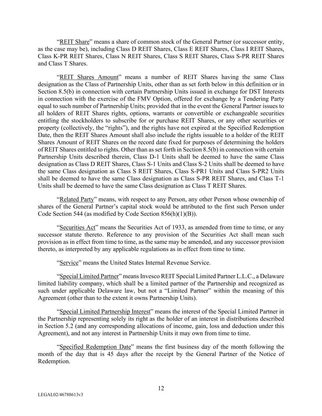 12 LEGAL02/46788613v3 “REIT Share” means a share of common stock of the General Partner (or successor entity, as the case may be), including Class D REIT Shares, Class E REIT Shares, Class I REIT Shares, Class K-PR REIT Shares, Class N REIT Shares, Class S REIT Shares, Class S-PR REIT Shares and Class T Shares. “REIT Shares Amount” means a number of REIT Shares having the same Class designation as the Class of Partnership Units, other than as set forth below in this definition or in Section 8.5(b) in connection with certain Partnership Units issued in exchange for DST Interests in connection with the exercise of the FMV Option, offered for exchange by a Tendering Party equal to such number of Partnership Units; provided that in the event the General Partner issues to all holders of REIT Shares rights, options, warrants or convertible or exchangeable securities entitling the stockholders to subscribe for or purchase REIT Shares, or any other securities or property (collectively, the “rights”), and the rights have not expired at the Specified Redemption Date, then the REIT Shares Amount shall also include the rights issuable to a holder of the REIT Shares Amount of REIT Shares on the record date fixed for purposes of determining the holders of REIT Shares entitled to rights. Other than as set forth in Section 8.5(b) in connection with certain Partnership Units described therein, Class D-1 Units shall be deemed to have the same Class designation as Class D REIT Shares, Class S-1 Units and Class S-2 Units shall be deemed to have the same Class designation as Class S REIT Shares, Class S-PR1 Units and Class S-PR2 Units shall be deemed to have the same Class designation as Class S-PR REIT Shares, and Class T-1 Units shall be deemed to have the same Class designation as Class T REIT Shares. “Related Party” means, with respect to any Person, any other Person whose ownership of shares of the General Partner’s capital stock would be attributed to the first such Person under Code Section 544 (as modified by Code Section 856(h)(1)(B)). “Securities Act” means the Securities Act of 1933, as amended from time to time, or any successor statute thereto. Reference to any provision of the Securities Act shall mean such provision as in effect from time to time, as the same may be amended, and any successor provision thereto, as interpreted by any applicable regulations as in effect from time to time. “Service” means the United States Internal Revenue Service. “Special Limited Partner” means Invesco REIT Special Limited Partner L.L.C., a Delaware limited liability company, which shall be a limited partner of the Partnership and recognized as such under applicable Delaware law, but not a “Limited Partner” within the meaning of this Agreement (other than to the extent it owns Partnership Units). “Special Limited Partnership Interest” means the interest of the Special Limited Partner in the Partnership representing solely its right as the holder of an interest in distributions described in Section 5.2 (and any corresponding allocations of income, gain, loss and deduction under this Agreement), and not any interest in Partnership Units it may own from time to time. “Specified Redemption Date” means the first business day of the month following the month of the day that is 45 days after the receipt by the General Partner of the Notice of Redemption.
