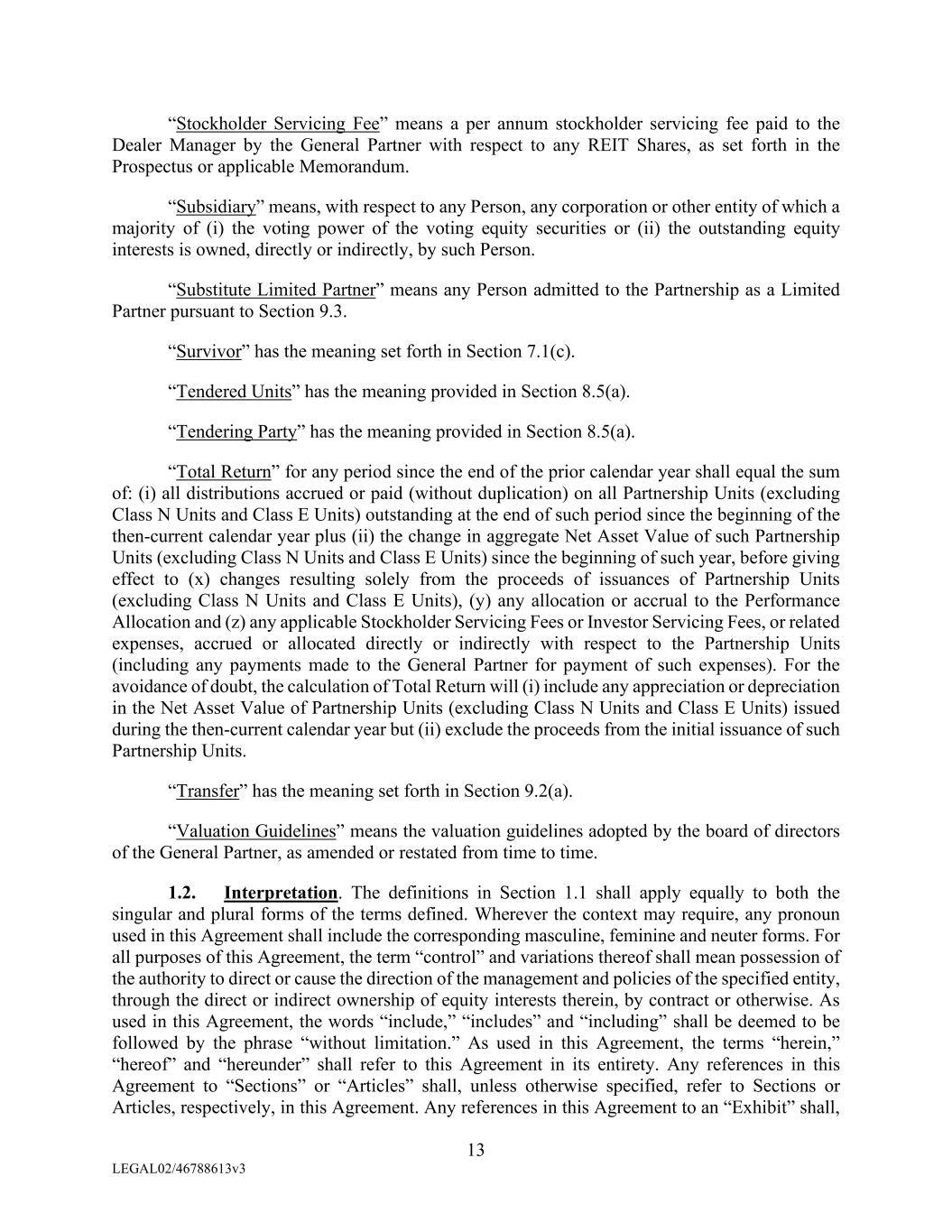 13 LEGAL02/46788613v3 “Stockholder Servicing Fee” means a per annum stockholder servicing fee paid to the Dealer Manager by the General Partner with respect to any REIT Shares, as set forth in the Prospectus or applicable Memorandum. “Subsidiary” means, with respect to any Person, any corporation or other entity of which a majority of (i) the voting power of the voting equity securities or (ii) the outstanding equity interests is owned, directly or indirectly, by such Person. “Substitute Limited Partner” means any Person admitted to the Partnership as a Limited Partner pursuant to Section 9.3. “Survivor” has the meaning set forth in Section 7.1(c). “Tendered Units” has the meaning provided in Section 8.5(a). “Tendering Party” has the meaning provided in Section 8.5(a). “Total Return” for any period since the end of the prior calendar year shall equal the sum of: (i) all distributions accrued or paid (without duplication) on all Partnership Units (excluding Class N Units and Class E Units) outstanding at the end of such period since the beginning of the then-current calendar year plus (ii) the change in aggregate Net Asset Value of such Partnership Units (excluding Class N Units and Class E Units) since the beginning of such year, before giving effect to (x) changes resulting solely from the proceeds of issuances of Partnership Units (excluding Class N Units and Class E Units), (y) any allocation or accrual to the Performance Allocation and (z) any applicable Stockholder Servicing Fees or Investor Servicing Fees, or related expenses, accrued or allocated directly or indirectly with respect to the Partnership Units (including any payments made to the General Partner for payment of such expenses). For the avoidance of doubt, the calculation of Total Return will (i) include any appreciation or depreciation in the Net Asset Value of Partnership Units (excluding Class N Units and Class E Units) issued during the then-current calendar year but (ii) exclude the proceeds from the initial issuance of such Partnership Units. “Transfer” has the meaning set forth in Section 9.2(a). “Valuation Guidelines” means the valuation guidelines adopted by the board of directors of the General Partner, as amended or restated from time to time. 1.2. Interpretation. The definitions in Section 1.1 shall apply equally to both the singular and plural forms of the terms defined. Wherever the context may require, any pronoun used in this Agreement shall include the corresponding masculine, feminine and neuter forms. For all purposes of this Agreement, the term “control” and variations thereof shall mean possession of the authority to direct or cause the direction of the management and policies of the specified entity, through the direct or indirect ownership of equity interests therein, by contract or otherwise. As used in this Agreement, the words “include,” “includes” and “including” shall be deemed to be followed by the phrase “without limitation.” As used in this Agreement, the terms “herein,” “hereof” and “hereunder” shall refer to this Agreement in its entirety. Any references in this Agreement to “Sections” or “Articles” shall, unless otherwise specified, refer to Sections or Articles, respectively, in this Agreement. Any references in this Agreement to an “Exhibit” shall,