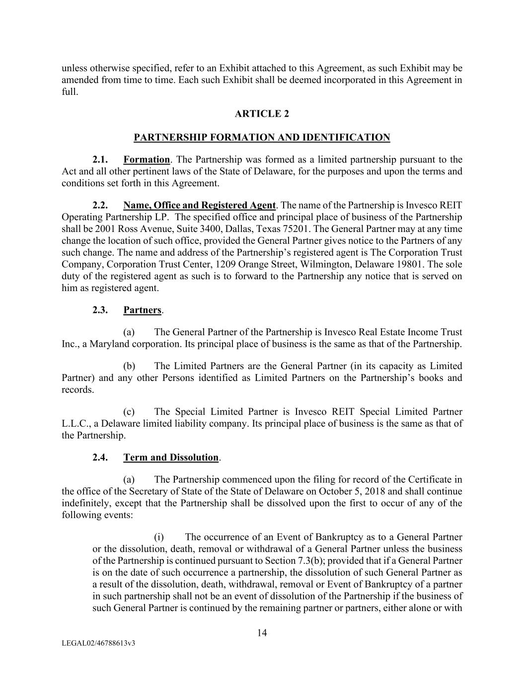 14 LEGAL02/46788613v3 unless otherwise specified, refer to an Exhibit attached to this Agreement, as such Exhibit may be amended from time to time. Each such Exhibit shall be deemed incorporated in this Agreement in full. ARTICLE 2 PARTNERSHIP FORMATION AND IDENTIFICATION 2.1. Formation. The Partnership was formed as a limited partnership pursuant to the Act and all other pertinent laws of the State of Delaware, for the purposes and upon the terms and conditions set forth in this Agreement. 2.2. Name, Office and Registered Agent. The name of the Partnership is Invesco REIT Operating Partnership LP. The specified office and principal place of business of the Partnership shall be ▇▇▇▇ ▇▇▇▇ ▇▇▇▇▇▇, ▇▇▇▇▇ ▇▇▇▇, ▇▇▇▇▇▇, ▇▇▇▇▇ ▇▇▇▇▇. The General Partner may at any time change the location of such office, provided the General Partner gives notice to the Partners of any such change. The name and address of the Partnership’s registered agent is The Corporation Trust Company, Corporation Trust Center, ▇▇▇▇ ▇▇▇▇▇▇ ▇▇▇▇▇▇, ▇▇▇▇▇▇▇▇▇▇, ▇▇▇▇▇▇▇▇ ▇▇▇▇▇. The sole duty of the registered agent as such is to forward to the Partnership any notice that is served on him as registered agent. 2.3. Partners. (a) The General Partner of the Partnership is Invesco Real Estate Income Trust Inc., a Maryland corporation. Its principal place of business is the same as that of the Partnership. (b) The Limited Partners are the General Partner (in its capacity as Limited Partner) and any other Persons identified as Limited Partners on the Partnership’s books and records. (c) The Special Limited Partner is Invesco REIT Special Limited Partner L.L.C., a Delaware limited liability company. Its principal place of business is the same as that of the Partnership. 2.4. Term and Dissolution. (a) The Partnership commenced upon the filing for record of the Certificate in the office of the Secretary of State of the State of Delaware on October 5, 2018 and shall continue indefinitely, except that the Partnership shall be dissolved upon the first to occur of any of the following events: (i) The occurrence of an Event of Bankruptcy as to a General Partner or the dissolution, death, removal or withdrawal of a General Partner unless the business of the Partnership is continued pursuant to Section 7.3(b); provided that if a General Partner is on the date of such occurrence a partnership, the dissolution of such General Partner as a result of the dissolution, death, withdrawal, removal or Event of Bankruptcy of a partner in such partnership shall not be an event of dissolution of the Partnership if the business of such General Partner is continued by the remaining partner or partners, either alone or with