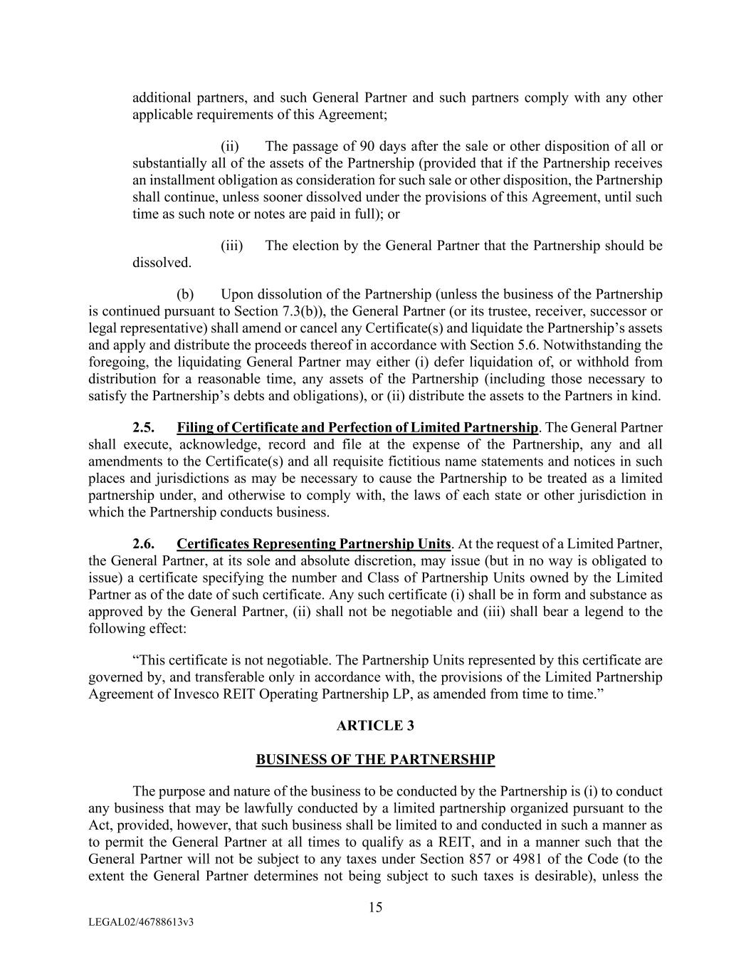 15 LEGAL02/46788613v3 additional partners, and such General Partner and such partners comply with any other applicable requirements of this Agreement; (ii) The passage of 90 days after the sale or other disposition of all or substantially all of the assets of the Partnership (provided that if the Partnership receives an installment obligation as consideration for such sale or other disposition, the Partnership shall continue, unless sooner dissolved under the provisions of this Agreement, until such time as such note or notes are paid in full); or (iii) The election by the General Partner that the Partnership should be dissolved. (b) Upon dissolution of the Partnership (unless the business of the Partnership is continued pursuant to Section 7.3(b)), the General Partner (or its trustee, receiver, successor or legal representative) shall amend or cancel any Certificate(s) and liquidate the Partnership’s assets and apply and distribute the proceeds thereof in accordance with Section 5.6. Notwithstanding the foregoing, the liquidating General Partner may either (i) defer liquidation of, or withhold from distribution for a reasonable time, any assets of the Partnership (including those necessary to satisfy the Partnership’s debts and obligations), or (ii) distribute the assets to the Partners in kind. 2.5. Filing of Certificate and Perfection of Limited Partnership. The General Partner shall execute, acknowledge, record and file at the expense of the Partnership, any and all amendments to the Certificate(s) and all requisite fictitious name statements and notices in such places and jurisdictions as may be necessary to cause the Partnership to be treated as a limited partnership under, and otherwise to comply with, the laws of each state or other jurisdiction in which the Partnership conducts business. 2.6. Certificates Representing Partnership Units. At the request of a Limited Partner, the General Partner, at its sole and absolute discretion, may issue (but in no way is obligated to issue) a certificate specifying the number and Class of Partnership Units owned by the Limited Partner as of the date of such certificate. Any such certificate (i) shall be in form and substance as approved by the General Partner, (ii) shall not be negotiable and (iii) shall bear a legend to the following effect: “This certificate is not negotiable. The Partnership Units represented by this certificate are governed by, and transferable only in accordance with, the provisions of the Limited Partnership Agreement of Invesco REIT Operating Partnership LP, as amended from time to time.” ARTICLE 3 BUSINESS OF THE PARTNERSHIP The purpose and nature of the business to be conducted by the Partnership is (i) to conduct any business that may be lawfully conducted by a limited partnership organized pursuant to the Act, provided, however, that such business shall be limited to and conducted in such a manner as to permit the General Partner at all times to qualify as a REIT, and in a manner such that the General Partner will not be subject to any taxes under Section 857 or 4981 of the Code (to the extent the General Partner determines not being subject to such taxes is desirable), unless the