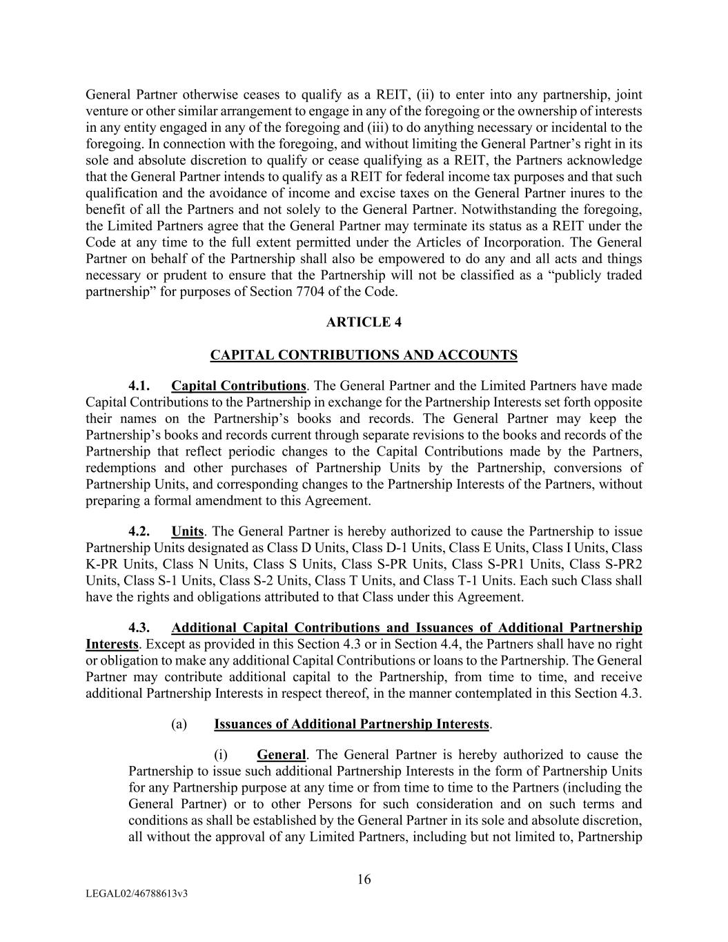 16 LEGAL02/46788613v3 General Partner otherwise ceases to qualify as a REIT, (ii) to enter into any partnership, joint venture or other similar arrangement to engage in any of the foregoing or the ownership of interests in any entity engaged in any of the foregoing and (iii) to do anything necessary or incidental to the foregoing. In connection with the foregoing, and without limiting the General Partner’s right in its sole and absolute discretion to qualify or cease qualifying as a REIT, the Partners acknowledge that the General Partner intends to qualify as a REIT for federal income tax purposes and that such qualification and the avoidance of income and excise taxes on the General Partner inures to the benefit of all the Partners and not solely to the General Partner. Notwithstanding the foregoing, the Limited Partners agree that the General Partner may terminate its status as a REIT under the Code at any time to the full extent permitted under the Articles of Incorporation. The General Partner on behalf of the Partnership shall also be empowered to do any and all acts and things necessary or prudent to ensure that the Partnership will not be classified as a “publicly traded partnership” for purposes of Section 7704 of the Code. ARTICLE 4 CAPITAL CONTRIBUTIONS AND ACCOUNTS 4.1. Capital Contributions. The General Partner and the Limited Partners have made Capital Contributions to the Partnership in exchange for the Partnership Interests set forth opposite their names on the Partnership’s books and records. The General Partner may keep the Partnership’s books and records current through separate revisions to the books and records of the Partnership that reflect periodic changes to the Capital Contributions made by the Partners, redemptions and other purchases of Partnership Units by the Partnership, conversions of Partnership Units, and corresponding changes to the Partnership Interests of the Partners, without preparing a formal amendment to this Agreement. 4.2. Units. The General Partner is hereby authorized to cause the Partnership to issue Partnership Units designated as Class D Units, Class D-1 Units, Class E Units, Class I Units, Class K-PR Units, Class N Units, Class S Units, Class S-PR Units, Class S-PR1 Units, Class S-PR2 Units, Class S-1 Units, Class S-2 Units, Class T Units, and Class T-1 Units. Each such Class shall have the rights and obligations attributed to that Class under this Agreement. 4.3. Additional Capital Contributions and Issuances of Additional Partnership Interests. Except as provided in this Section 4.3 or in Section 4.4, the Partners shall have no right or obligation to make any additional Capital Contributions or loans to the Partnership. The General Partner may contribute additional capital to the Partnership, from time to time, and receive additional Partnership Interests in respect thereof, in the manner contemplated in this Section 4.3. (a) Issuances of Additional Partnership Interests. (i) General. The General Partner is hereby authorized to cause the Partnership to issue such additional Partnership Interests in the form of Partnership Units for any Partnership purpose at any time or from time to time to the Partners (including the General Partner) or to other Persons for such consideration and on such terms and conditions as shall be established by the General Partner in its sole and absolute discretion, all without the approval of any Limited Partners, including but not limited to, Partnership