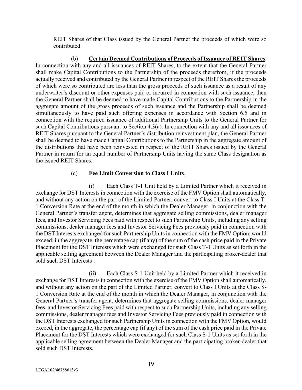 19 LEGAL02/46788613v3 REIT Shares of that Class issued by the General Partner the proceeds of which were so contributed. (b) Certain Deemed Contributions of Proceeds of Issuance of ▇▇▇▇ ▇▇▇▇▇▇. In connection with any and all issuances of REIT Shares, to the extent that the General Partner shall make Capital Contributions to the Partnership of the proceeds therefrom, if the proceeds actually received and contributed by the General Partner in respect of the REIT Shares the proceeds of which were so contributed are less than the gross proceeds of such issuance as a result of any underwriter’s discount or other expenses paid or incurred in connection with such issuance, then the General Partner shall be deemed to have made Capital Contributions to the Partnership in the aggregate amount of the gross proceeds of such issuance and the Partnership shall be deemed simultaneously to have paid such offering expenses in accordance with Section 6.5 and in connection with the required issuance of additional Partnership Units to the General Partner for such Capital Contributions pursuant to Section 4.3(a). In connection with any and all issuances of REIT Shares pursuant to the General Partner’s distribution reinvestment plan, the General Partner shall be deemed to have made Capital Contributions to the Partnership in the aggregate amount of the distributions that have been reinvested in respect of the REIT Shares issued by the General Partner in return for an equal number of Partnership Units having the same Class designation as the issued REIT Shares. (c) Fee Limit Conversion to Class I Units. (i) Each Class T-1 Unit held by a Limited Partner which it received in exchange for DST Interests in connection with the exercise of the FMV Option shall automatically, and without any action on the part of the Limited Partner, convert to Class I Units at the Class T- 1 Conversion Rate at the end of the month in which the Dealer Manager, in conjunction with the General Partner’s transfer agent, determines that aggregate selling commissions, dealer manager fees, and Investor Servicing Fees paid with respect to such Partnership Units, including any selling commissions, dealer manager fees and Investor Servicing Fees previously paid in connection with the DST Interests exchanged for such Partnership Units in connection with the FMV Option, would exceed, in the aggregate, the percentage cap (if any) of the sum of the cash price paid in the Private Placement for the DST Interests which were exchanged for such Class T-1 Units as set forth in the applicable selling agreement between the Dealer Manager and the participating broker-dealer that sold such DST Interests . (ii) Each Class S-1 Unit held by a Limited Partner which it received in exchange for DST Interests in connection with the exercise of the FMV Option shall automatically, and without any action on the part of the Limited Partner, convert to Class I Units at the Class S- 1 Conversion Rate at the end of the month in which the Dealer Manager, in conjunction with the General Partner’s transfer agent, determines that aggregate selling commissions, dealer manager fees, and Investor Servicing Fees paid with respect to such Partnership Units, including any selling commissions, dealer manager fees and Investor Servicing Fees previously paid in connection with the DST Interests exchanged for such Partnership Units in connection with the FMV Option, would exceed, in the aggregate, the percentage cap (if any) of the sum of the cash price paid in the Private Placement for the DST Interests which were exchanged for such Class S-1 Units as set forth in the applicable selling agreement between the Dealer Manager and the participating broker-dealer that sold such DST Interests.