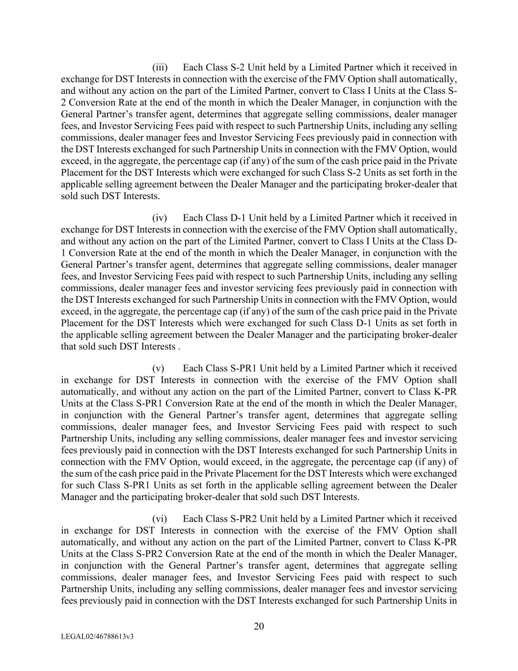 20 LEGAL02/46788613v3 (iii) Each Class S-2 Unit held by a Limited Partner which it received in exchange for DST Interests in connection with the exercise of the FMV Option shall automatically, and without any action on the part of the Limited Partner, convert to Class I Units at the Class S- 2 Conversion Rate at the end of the month in which the Dealer Manager, in conjunction with the General Partner’s transfer agent, determines that aggregate selling commissions, dealer manager fees, and Investor Servicing Fees paid with respect to such Partnership Units, including any selling commissions, dealer manager fees and Investor Servicing Fees previously paid in connection with the DST Interests exchanged for such Partnership Units in connection with the FMV Option, would exceed, in the aggregate, the percentage cap (if any) of the sum of the cash price paid in the Private Placement for the DST Interests which were exchanged for such Class S-2 Units as set forth in the applicable selling agreement between the Dealer Manager and the participating broker-dealer that sold such DST Interests. (iv) Each Class D-1 Unit held by a Limited Partner which it received in exchange for DST Interests in connection with the exercise of the FMV Option shall automatically, and without any action on the part of the Limited Partner, convert to Class I Units at the Class D- 1 Conversion Rate at the end of the month in which the Dealer Manager, in conjunction with the General Partner’s transfer agent, determines that aggregate selling commissions, dealer manager fees, and Investor Servicing Fees paid with respect to such Partnership Units, including any selling commissions, dealer manager fees and investor servicing fees previously paid in connection with the DST Interests exchanged for such Partnership Units in connection with the FMV Option, would exceed, in the aggregate, the percentage cap (if any) of the sum of the cash price paid in the Private Placement for the DST Interests which were exchanged for such Class D-1 Units as set forth in the applicable selling agreement between the Dealer Manager and the participating broker-dealer that sold such DST Interests . (v) Each Class S-PR1 Unit held by a Limited Partner which it received in exchange for DST Interests in connection with the exercise of the FMV Option shall automatically, and without any action on the part of the Limited Partner, convert to Class K-PR Units at the Class S-PR1 Conversion Rate at the end of the month in which the Dealer Manager, in conjunction with the General Partner’s transfer agent, determines that aggregate selling commissions, dealer manager fees, and Investor Servicing Fees paid with respect to such Partnership Units, including any selling commissions, dealer manager fees and investor servicing fees previously paid in connection with the DST Interests exchanged for such Partnership Units in connection with the FMV Option, would exceed, in the aggregate, the percentage cap (if any) of the sum of the cash price paid in the Private Placement for the DST Interests which were exchanged for such Class S-PR1 Units as set forth in the applicable selling agreement between the Dealer Manager and the participating broker-dealer that sold such DST Interests. (vi) Each Class S-PR2 Unit held by a Limited Partner which it received in exchange for DST Interests in connection with the exercise of the FMV Option shall automatically, and without any action on the part of the Limited Partner, convert to Class K-PR Units at the Class S-PR2 Conversion Rate at the end of the month in which the Dealer Manager, in conjunction with the General Partner’s transfer agent, determines that aggregate selling commissions, dealer manager fees, and Investor Servicing Fees paid with respect to such Partnership Units, including any selling commissions, dealer manager fees and investor servicing fees previously paid in connection with the DST Interests exchanged for such Partnership Units in