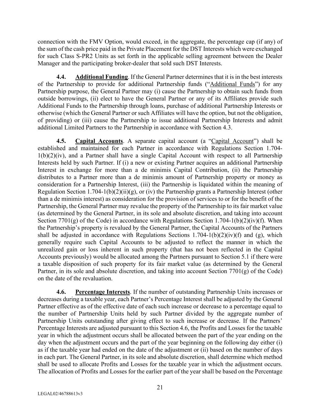 21 LEGAL02/46788613v3 connection with the FMV Option, would exceed, in the aggregate, the percentage cap (if any) of the sum of the cash price paid in the Private Placement for the DST Interests which were exchanged for such Class S-PR2 Units as set forth in the applicable selling agreement between the Dealer Manager and the participating broker-dealer that sold such DST Interests. 4.4. Additional Funding. If the General Partner determines that it is in the best interests of the Partnership to provide for additional Partnership funds (“Additional Funds”) for any Partnership purpose, the General Partner may (i) cause the Partnership to obtain such funds from outside borrowings, (ii) elect to have the General Partner or any of its Affiliates provide such Additional Funds to the Partnership through loans, purchase of additional Partnership Interests or otherwise (which the General Partner or such Affiliates will have the option, but not the obligation, of providing) or (iii) cause the Partnership to issue additional Partnership Interests and admit additional Limited Partners to the Partnership in accordance with Section 4.3. 4.5. Capital Accounts. A separate capital account (a “Capital Account”) shall be established and maintained for each Partner in accordance with Regulations Section 1.704- 1(b)(2)(iv), and a Partner shall have a single Capital Account with respect to all Partnership Interests held by such Partner. If (i) a new or existing Partner acquires an additional Partnership Interest in exchange for more than a de minimis Capital Contribution, (ii) the Partnership distributes to a Partner more than a de minimis amount of Partnership property or money as consideration for a Partnership Interest, (iii) the Partnership is liquidated within the meaning of Regulation Section 1.704-1(b)(2)(ii)(g), or (iv) the Partnership grants a Partnership Interest (other than a de minimis interest) as consideration for the provision of services to or for the benefit of the Partnership, the General Partner may revalue the property of the Partnership to its fair market value (as determined by the General Partner, in its sole and absolute discretion, and taking into account Section 7701(g) of the Code) in accordance with Regulations Section 1.704-1(b)(2)(iv)(f). When the Partnership’s property is revalued by the General Partner, the Capital Accounts of the Partners shall be adjusted in accordance with Regulations Sections 1.704-1(b)(2)(iv)(f) and (g), which generally require such Capital Accounts to be adjusted to reflect the manner in which the unrealized gain or loss inherent in such property (that has not been reflected in the Capital Accounts previously) would be allocated among the Partners pursuant to Section 5.1 if there were a taxable disposition of such property for its fair market value (as determined by the General Partner, in its sole and absolute discretion, and taking into account Section 7701(g) of the Code) on the date of the revaluation. 4.6. Percentage Interests. If the number of outstanding Partnership Units increases or decreases during a taxable year, each Partner’s Percentage Interest shall be adjusted by the General Partner effective as of the effective date of each such increase or decrease to a percentage equal to the number of Partnership Units held by such Partner divided by the aggregate number of Partnership Units outstanding after giving effect to such increase or decrease. If the Partners’ Percentage Interests are adjusted pursuant to this Section 4.6, the Profits and Losses for the taxable year in which the adjustment occurs shall be allocated between the part of the year ending on the day when the adjustment occurs and the part of the year beginning on the following day either (i) as if the taxable year had ended on the date of the adjustment or (ii) based on the number of days in each part. The General Partner, in its sole and absolute discretion, shall determine which method shall be used to allocate Profits and Losses for the taxable year in which the adjustment occurs. The allocation of Profits and Losses for the earlier part of the year shall be based on the Percentage