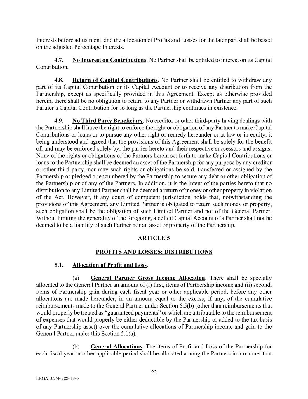 22 LEGAL02/46788613v3 Interests before adjustment, and the allocation of Profits and Losses for the later part shall be based on the adjusted Percentage Interests. 4.7. No Interest on Contributions. No Partner shall be entitled to interest on its Capital Contribution. 4.8. Return of Capital Contributions. No Partner shall be entitled to withdraw any part of its Capital Contribution or its Capital Account or to receive any distribution from the Partnership, except as specifically provided in this Agreement. Except as otherwise provided herein, there shall be no obligation to return to any Partner or withdrawn Partner any part of such Partner’s Capital Contribution for so long as the Partnership continues in existence. 4.9. No Third Party Beneficiary. No creditor or other third-party having dealings with the Partnership shall have the right to enforce the right or obligation of any Partner to make Capital Contributions or loans or to pursue any other right or remedy hereunder or at law or in equity, it being understood and agreed that the provisions of this Agreement shall be solely for the benefit of, and may be enforced solely by, the parties hereto and their respective successors and assigns. None of the rights or obligations of the Partners herein set forth to make Capital Contributions or loans to the Partnership shall be deemed an asset of the Partnership for any purpose by any creditor or other third party, nor may such rights or obligations be sold, transferred or assigned by the Partnership or pledged or encumbered by the Partnership to secure any debt or other obligation of the Partnership or of any of the Partners. In addition, it is the intent of the parties hereto that no distribution to any Limited Partner shall be deemed a return of money or other property in violation of the Act. However, if any court of competent jurisdiction holds that, notwithstanding the provisions of this Agreement, any Limited Partner is obligated to return such money or property, such obligation shall be the obligation of such Limited Partner and not of the General Partner. Without limiting the generality of the foregoing, a deficit Capital Account of a Partner shall not be deemed to be a liability of such Partner nor an asset or property of the Partnership. ARTICLE 5 PROFITS AND LOSSES; DISTRIBUTIONS 5.1. Allocation of Profit and Loss. (a) General Partner Gross Income Allocation. There shall be specially allocated to the General Partner an amount of (i) first, items of Partnership income and (ii) second, items of Partnership gain during each fiscal year or other applicable period, before any other allocations are made hereunder, in an amount equal to the excess, if any, of the cumulative reimbursements made to the General Partner under Section 6.5(b) (other than reimbursements that would properly be treated as “guaranteed payments” or which are attributable to the reimbursement of expenses that would properly be either deductible by the Partnership or added to the tax basis of any Partnership asset) over the cumulative allocations of Partnership income and gain to the General Partner under this Section 5.1(a). (b) General Allocations. The items of Profit and Loss of the Partnership for each fiscal year or other applicable period shall be allocated among the Partners in a manner that