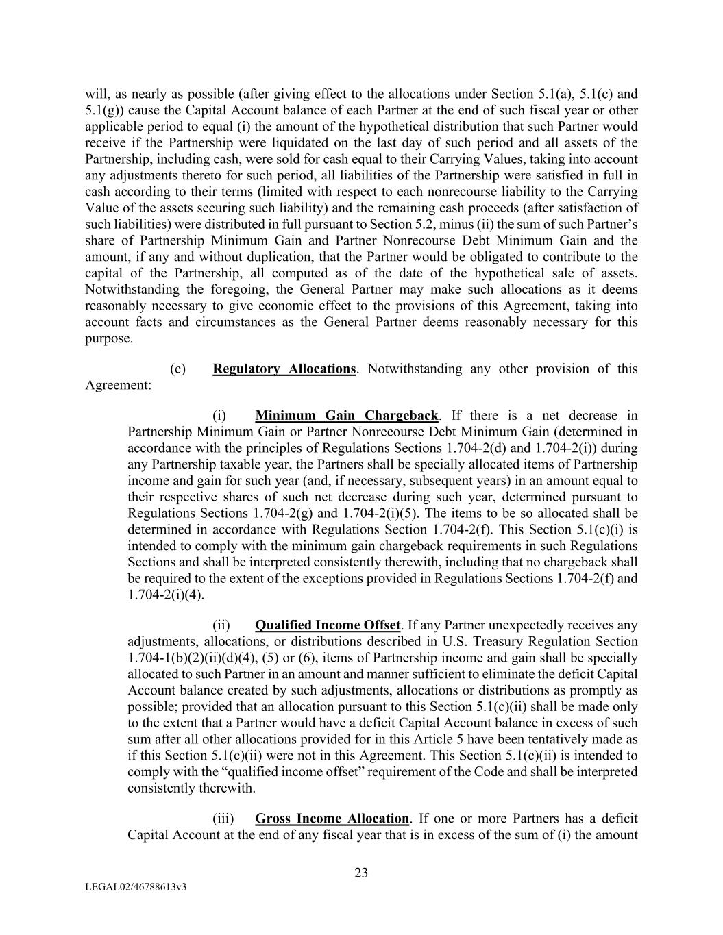 23 LEGAL02/46788613v3 will, as nearly as possible (after giving effect to the allocations under Section 5.1(a), 5.1(c) and 5.1(g)) cause the Capital Account balance of each Partner at the end of such fiscal year or other applicable period to equal (i) the amount of the hypothetical distribution that such Partner would receive if the Partnership were liquidated on the last day of such period and all assets of the Partnership, including cash, were sold for cash equal to their Carrying Values, taking into account any adjustments thereto for such period, all liabilities of the Partnership were satisfied in full in cash according to their terms (limited with respect to each nonrecourse liability to the Carrying Value of the assets securing such liability) and the remaining cash proceeds (after satisfaction of such liabilities) were distributed in full pursuant to Section 5.2, minus (ii) the sum of such Partner’s share of Partnership Minimum Gain and Partner Nonrecourse Debt Minimum Gain and the amount, if any and without duplication, that the Partner would be obligated to contribute to the capital of the Partnership, all computed as of the date of the hypothetical sale of assets. Notwithstanding the foregoing, the General Partner may make such allocations as it deems reasonably necessary to give economic effect to the provisions of this Agreement, taking into account facts and circumstances as the General Partner deems reasonably necessary for this purpose. (c) Regulatory Allocations. Notwithstanding any other provision of this Agreement: (i) Minimum Gain Chargeback. If there is a net decrease in Partnership Minimum Gain or Partner Nonrecourse Debt Minimum Gain (determined in accordance with the principles of Regulations Sections 1.704-2(d) and 1.704-2(i)) during any Partnership taxable year, the Partners shall be specially allocated items of Partnership income and gain for such year (and, if necessary, subsequent years) in an amount equal to their respective shares of such net decrease during such year, determined pursuant to Regulations Sections 1.704-2(g) and 1.704-2(i)(5). The items to be so allocated shall be determined in accordance with Regulations Section 1.704-2(f). This Section 5.1(c)(i) is intended to comply with the minimum gain chargeback requirements in such Regulations Sections and shall be interpreted consistently therewith, including that no chargeback shall be required to the extent of the exceptions provided in Regulations Sections 1.704-2(f) and 1.704-2(i)(4). (ii) Qualified Income Offset. If any Partner unexpectedly receives any adjustments, allocations, or distributions described in U.S. Treasury Regulation Section 1.704-1(b)(2)(ii)(d)(4), (5) or (6), items of Partnership income and gain shall be specially allocated to such Partner in an amount and manner sufficient to eliminate the deficit Capital Account balance created by such adjustments, allocations or distributions as promptly as possible; provided that an allocation pursuant to this Section 5.1(c)(ii) shall be made only to the extent that a Partner would have a deficit Capital Account balance in excess of such sum after all other allocations provided for in this Article 5 have been tentatively made as if this Section 5.1(c)(ii) were not in this Agreement. This Section 5.1(c)(ii) is intended to comply with the “qualified income offset” requirement of the Code and shall be interpreted consistently therewith. (iii) Gross Income Allocation. If one or more Partners has a deficit Capital Account at the end of any fiscal year that is in excess of the sum of (i) the amount