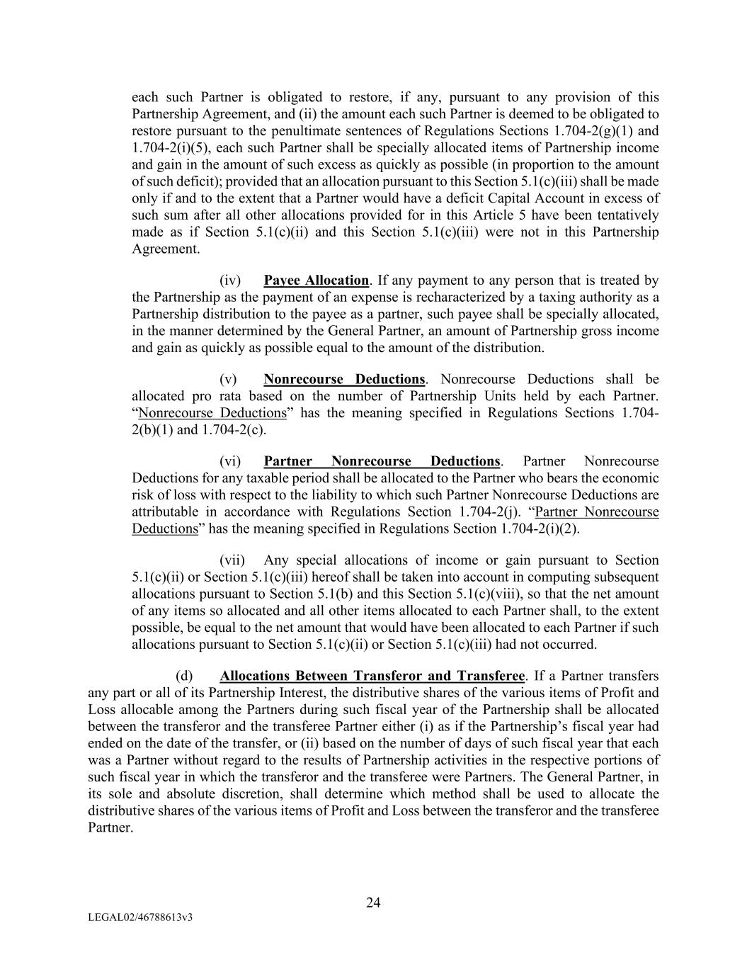 24 LEGAL02/46788613v3 each such Partner is obligated to restore, if any, pursuant to any provision of this Partnership Agreement, and (ii) the amount each such Partner is deemed to be obligated to restore pursuant to the penultimate sentences of Regulations Sections 1.704-2(g)(1) and 1.704-2(i)(5), each such Partner shall be specially allocated items of Partnership income and gain in the amount of such excess as quickly as possible (in proportion to the amount of such deficit); provided that an allocation pursuant to this Section 5.1(c)(iii) shall be made only if and to the extent that a Partner would have a deficit Capital Account in excess of such sum after all other allocations provided for in this Article 5 have been tentatively made as if Section 5.1(c)(ii) and this Section 5.1(c)(iii) were not in this Partnership Agreement. (iv) Payee Allocation. If any payment to any person that is treated by the Partnership as the payment of an expense is recharacterized by a taxing authority as a Partnership distribution to the payee as a partner, such payee shall be specially allocated, in the manner determined by the General Partner, an amount of Partnership gross income and gain as quickly as possible equal to the amount of the distribution. (v) Nonrecourse Deductions. Nonrecourse Deductions shall be allocated pro rata based on the number of Partnership Units held by each Partner. “Nonrecourse Deductions” has the meaning specified in Regulations Sections 1.704- 2(b)(1) and 1.704-2(c). (vi) Partner Nonrecourse Deductions. Partner Nonrecourse Deductions for any taxable period shall be allocated to the Partner who bears the economic risk of loss with respect to the liability to which such Partner Nonrecourse Deductions are attributable in accordance with Regulations Section 1.704-2(j). “Partner Nonrecourse Deductions” has the meaning specified in Regulations Section 1.704-2(i)(2). (vii) Any special allocations of income or gain pursuant to Section 5.1(c)(ii) or Section 5.1(c)(iii) hereof shall be taken into account in computing subsequent allocations pursuant to Section 5.1(b) and this Section 5.1(c)(viii), so that the net amount of any items so allocated and all other items allocated to each Partner shall, to the extent possible, be equal to the net amount that would have been allocated to each Partner if such allocations pursuant to Section 5.1(c)(ii) or Section 5.1(c)(iii) had not occurred. (d) Allocations Between Transferor and Transferee. If a Partner transfers any part or all of its Partnership Interest, the distributive shares of the various items of Profit and Loss allocable among the Partners during such fiscal year of the Partnership shall be allocated between the transferor and the transferee Partner either (i) as if the Partnership’s fiscal year had ended on the date of the transfer, or (ii) based on the number of days of such fiscal year that each was a Partner without regard to the results of Partnership activities in the respective portions of such fiscal year in which the transferor and the transferee were Partners. The General Partner, in its sole and absolute discretion, shall determine which method shall be used to allocate the distributive shares of the various items of Profit and Loss between the transferor and the transferee Partner.