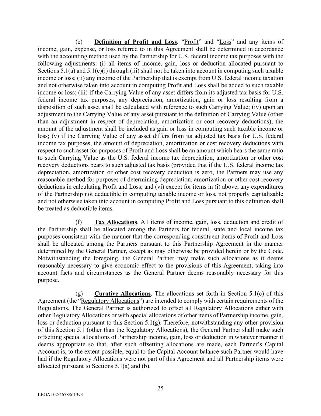 25 LEGAL02/46788613v3 (e) Definition of Profit and Loss. “Profit” and “Loss” and any items of income, gain, expense, or loss referred to in this Agreement shall be determined in accordance with the accounting method used by the Partnership for U.S. federal income tax purposes with the following adjustments: (i) all items of income, gain, loss or deduction allocated pursuant to Sections 5.1(a) and 5.1(c)(i) through (iii) shall not be taken into account in computing such taxable income or loss; (ii) any income of the Partnership that is exempt from U.S. federal income taxation and not otherwise taken into account in computing Profit and Loss shall be added to such taxable income or loss; (iii) if the Carrying Value of any asset differs from its adjusted tax basis for U.S. federal income tax purposes, any depreciation, amortization, gain or loss resulting from a disposition of such asset shall be calculated with reference to such Carrying Value; (iv) upon an adjustment to the Carrying Value of any asset pursuant to the definition of Carrying Value (other than an adjustment in respect of depreciation, amortization or cost recovery deductions), the amount of the adjustment shall be included as gain or loss in computing such taxable income or loss; (v) if the Carrying Value of any asset differs from its adjusted tax basis for U.S. federal income tax purposes, the amount of depreciation, amortization or cost recovery deductions with respect to such asset for purposes of Profit and Loss shall be an amount which bears the same ratio to such Carrying Value as the U.S. federal income tax depreciation, amortization or other cost recovery deductions bears to such adjusted tax basis (provided that if the U.S. federal income tax depreciation, amortization or other cost recovery deduction is zero, the Partners may use any reasonable method for purposes of determining depreciation, amortization or other cost recovery deductions in calculating Profit and Loss; and (vi) except for items in (i) above, any expenditures of the Partnership not deductible in computing taxable income or loss, not properly capitalizable and not otherwise taken into account in computing Profit and Loss pursuant to this definition shall be treated as deductible items. (f) Tax Allocations. All items of income, gain, loss, deduction and credit of the Partnership shall be allocated among the Partners for federal, state and local income tax purposes consistent with the manner that the corresponding constituent items of Profit and Loss shall be allocated among the Partners pursuant to this Partnership Agreement in the manner determined by the General Partner, except as may otherwise be provided herein or by the Code. Notwithstanding the foregoing, the General Partner may make such allocations as it deems reasonably necessary to give economic effect to the provisions of this Agreement, taking into account facts and circumstances as the General Partner deems reasonably necessary for this purpose. (g) Curative Allocations. The allocations set forth in Section 5.1(c) of this Agreement (the “Regulatory Allocations”) are intended to comply with certain requirements of the Regulations. The General Partner is authorized to offset all Regulatory Allocations either with other Regulatory Allocations or with special allocations of other items of Partnership income, gain, loss or deduction pursuant to this Section 5.1(g). Therefore, notwithstanding any other provision of this Section 5.1 (other than the Regulatory Allocations), the General Partner shall make such offsetting special allocations of Partnership income, gain, loss or deduction in whatever manner it deems appropriate so that, after such offsetting allocations are made, each Partner’s Capital Account is, to the extent possible, equal to the Capital Account balance such Partner would have had if the Regulatory Allocations were not part of this Agreement and all Partnership items were allocated pursuant to Sections 5.1(a) and (b).