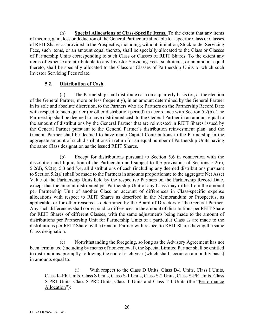 26 LEGAL02/46788613v3 (h) Special Allocations of Class-Specific Items. To the extent that any items of income, gain, loss or deduction of the General Partner are allocable to a specific Class or Classes of REIT Shares as provided in the Prospectus, including, without limitation, Stockholder Servicing Fees, such items, or an amount equal thereto, shall be specially allocated to the Class or Classes of Partnership Units corresponding to such Class or Classes of REIT Shares. To the extent any items of expense are attributable to any Investor Servicing Fees, such items, or an amount equal thereto, shall be specially allocated to the Class or Classes of Partnership Units to which such Investor Servicing Fees relate. 5.2. Distribution of Cash. (a) The Partnership shall distribute cash on a quarterly basis (or, at the election of the General Partner, more or less frequently), in an amount determined by the General Partner in its sole and absolute discretion, to the Partners who are Partners on the Partnership Record Date with respect to such quarter (or other distribution period) in accordance with Section 5.2(b). The Partnership shall be deemed to have distributed cash to the General Partner in an amount equal to the amount of distributions by the General Partner that are reinvested in REIT Shares issued by the General Partner pursuant to the General Partner’s distribution reinvestment plan, and the General Partner shall be deemed to have made Capital Contributions to the Partnership in the aggregate amount of such distributions in return for an equal number of Partnership Units having the same Class designation as the issued REIT Shares. (b) Except for distributions pursuant to Section 5.6 in connection with the dissolution and liquidation of the Partnership and subject to the provisions of Sections 5.2(c), 5.2(d), 5.2(e), 5.3 and 5.4, all distributions of cash (including any deemed distributions pursuant to Section 5.2(a)) shall be made to the Partners in amounts proportionate to the aggregate Net Asset Value of the Partnership Units held by the respective Partners on the Partnership Record Date, except that the amount distributed per Partnership Unit of any Class may differ from the amount per Partnership Unit of another Class on account of differences in Class-specific expense allocations with respect to REIT Shares as described in the Memorandum or Prospectus, as applicable, or for other reasons as determined by the Board of Directors of the General Partner. Any such differences shall correspond to differences in the amount of distributions per REIT Share for REIT Shares of different Classes, with the same adjustments being made to the amount of distributions per Partnership Unit for Partnership Units of a particular Class as are made to the distributions per REIT Share by the General Partner with respect to REIT Shares having the same Class designation. (c) Notwithstanding the foregoing, so long as the Advisory Agreement has not been terminated (including by means of non-renewal), the Special Limited Partner shall be entitled to distributions, promptly following the end of each year (which shall accrue on a monthly basis) in amounts equal to: (i) With respect to the Class D Units, Class D-1 Units, Class I Units, Class K-PR Units, Class S Units, Class S-1 Units, Class S-2 Units, Class S-PR Units, Class S-PR1 Units, Class S-PR2 Units, Class T Units and Class T-1 Units (the “Performance Allocation”):