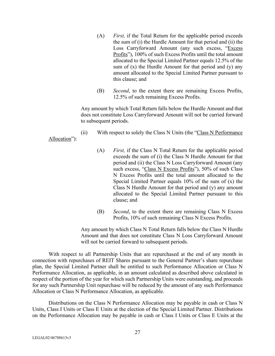 27 LEGAL02/46788613v3 (A) First, if the Total Return for the applicable period exceeds the sum of (i) the Hurdle Amount for that period and (ii) the Loss Carryforward Amount (any such excess, “Excess Profits”), 100% of such Excess Profits until the total amount allocated to the Special Limited Partner equals 12.5% of the sum of (x) the Hurdle Amount for that period and (y) any amount allocated to the Special Limited Partner pursuant to this clause; and (B) Second, to the extent there are remaining Excess Profits, 12.5% of such remaining Excess Profits. Any amount by which Total Return falls below the Hurdle Amount and that does not constitute Loss Carryforward Amount will not be carried forward to subsequent periods. (ii) With respect to solely the Class N Units (the “Class N Performance Allocation”): (A) First, if the Class N Total Return for the applicable period exceeds the sum of (i) the Class N Hurdle Amount for that period and (ii) the Class N Loss Carryforward Amount (any such excess, “Class N Excess Profits”), 50% of such Class N Excess Profits until the total amount allocated to the Special Limited Partner equals 10% of the sum of (x) the Class N Hurdle Amount for that period and (y) any amount allocated to the Special Limited Partner pursuant to this clause; and (B) Second, to the extent there are remaining Class N Excess Profits, 10% of such remaining Class N Excess Profits. Any amount by which Class N Total Return falls below the Class N Hurdle Amount and that does not constitute Class N Loss Carryforward Amount will not be carried forward to subsequent periods. With respect to all Partnership Units that are repurchased at the end of any month in connection with repurchases of REIT Shares pursuant to the General Partner’s share repurchase plan, the Special Limited Partner shall be entitled to such Performance Allocation or Class N Performance Allocation, as applicable, in an amount calculated as described above calculated in respect of the portion of the year for which such Partnership Units were outstanding, and proceeds for any such Partnership Unit repurchase will be reduced by the amount of any such Performance Allocation or Class N Performance Allocation, as applicable. Distributions on the Class N Performance Allocation may be payable in cash or Class N Units, Class I Units or Class E Units at the election of the Special Limited Partner. Distributions on the Performance Allocation may be payable in cash or Class I Units or Class E Units at the