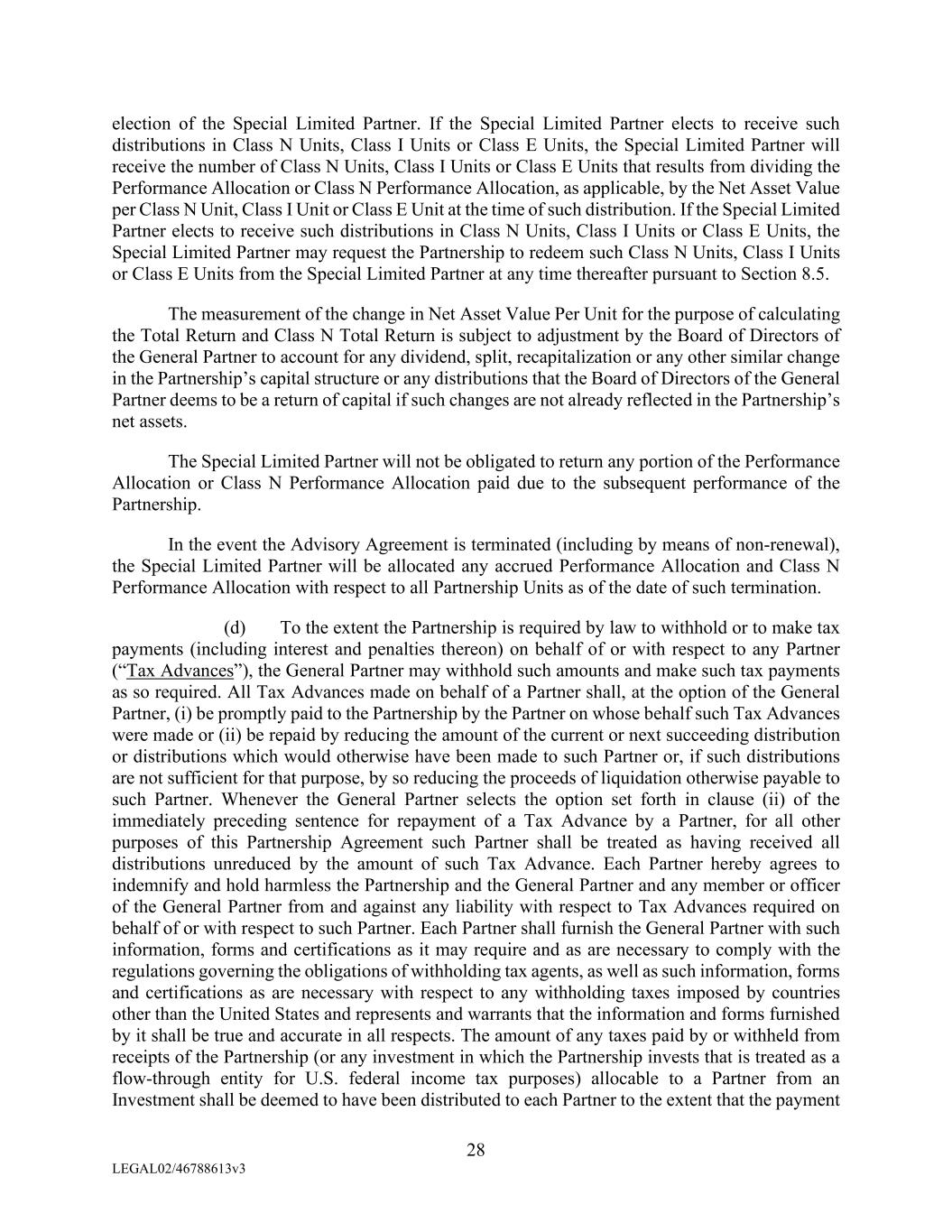 28 LEGAL02/46788613v3 election of the Special Limited Partner. If the Special Limited Partner elects to receive such distributions in Class N Units, Class I Units or Class E Units, the Special Limited Partner will receive the number of Class N Units, Class I Units or Class E Units that results from dividing the Performance Allocation or Class N Performance Allocation, as applicable, by the Net Asset Value per Class N Unit, Class I Unit or Class E Unit at the time of such distribution. If the Special Limited Partner elects to receive such distributions in Class N Units, Class I Units or Class E Units, the Special Limited Partner may request the Partnership to redeem such Class N Units, Class I Units or Class E Units from the Special Limited Partner at any time thereafter pursuant to Section 8.5. The measurement of the change in Net Asset Value Per Unit for the purpose of calculating the Total Return and Class N Total Return is subject to adjustment by the Board of Directors of the General Partner to account for any dividend, split, recapitalization or any other similar change in the Partnership’s capital structure or any distributions that the Board of Directors of the General Partner deems to be a return of capital if such changes are not already reflected in the Partnership’s net assets. The Special Limited Partner will not be obligated to return any portion of the Performance Allocation or Class N Performance Allocation paid due to the subsequent performance of the Partnership. In the event the Advisory Agreement is terminated (including by means of non-renewal), the Special Limited Partner will be allocated any accrued Performance Allocation and Class N Performance Allocation with respect to all Partnership Units as of the date of such termination. (d) To the extent the Partnership is required by law to withhold or to make tax payments (including interest and penalties thereon) on behalf of or with respect to any Partner (“Tax Advances”), the General Partner may withhold such amounts and make such tax payments as so required. All Tax Advances made on behalf of a Partner shall, at the option of the General Partner, (i) be promptly paid to the Partnership by the Partner on whose behalf such Tax Advances were made or (ii) be repaid by reducing the amount of the current or next succeeding distribution or distributions which would otherwise have been made to such Partner or, if such distributions are not sufficient for that purpose, by so reducing the proceeds of liquidation otherwise payable to such Partner. Whenever the General Partner selects the option set forth in clause (ii) of the immediately preceding sentence for repayment of a Tax Advance by a Partner, for all other purposes of this Partnership Agreement such Partner shall be treated as having received all distributions unreduced by the amount of such Tax Advance. Each Partner ▇▇▇▇▇▇ agrees to indemnify and hold harmless the Partnership and the General Partner and any member or officer of the General Partner from and against any liability with respect to Tax Advances required on behalf of or with respect to such Partner. Each Partner shall furnish the General Partner with such information, forms and certifications as it may require and as are necessary to comply with the regulations governing the obligations of withholding tax agents, as well as such information, forms and certifications as are necessary with respect to any withholding taxes imposed by countries other than the United States and represents and warrants that the information and forms furnished by it shall be true and accurate in all respects. The amount of any taxes paid by or withheld from receipts of the Partnership (or any investment in which the Partnership invests that is treated as a flow-through entity for U.S. federal income tax purposes) allocable to a Partner from an Investment shall be deemed to have been distributed to each Partner to the extent that the payment