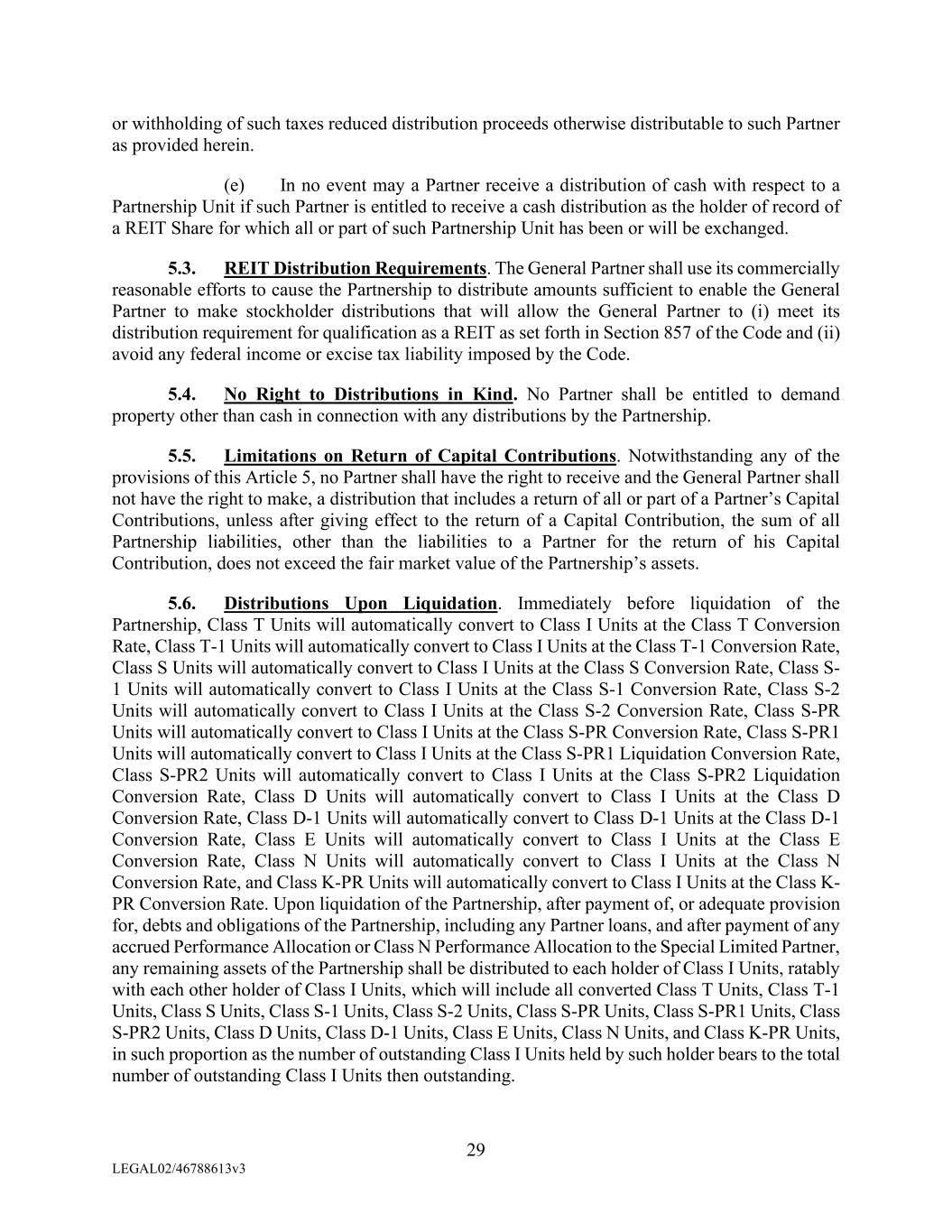 29 LEGAL02/46788613v3 or withholding of such taxes reduced distribution proceeds otherwise distributable to such Partner as provided herein. (e) In no event may a Partner receive a distribution of cash with respect to a Partnership Unit if such Partner is entitled to receive a cash distribution as the holder of record of a REIT Share for which all or part of such Partnership Unit has been or will be exchanged. 5.3. REIT Distribution Requirements. The General Partner shall use its commercially reasonable efforts to cause the Partnership to distribute amounts sufficient to enable the General Partner to make stockholder distributions that will allow the General Partner to (i) meet its distribution requirement for qualification as a REIT as set forth in Section 857 of the Code and (ii) avoid any federal income or excise tax liability imposed by the Code. 5.4. No Right to Distributions in Kind. No Partner shall be entitled to demand property other than cash in connection with any distributions by the Partnership. 5.5. Limitations on Return of Capital Contributions. Notwithstanding any of the provisions of this Article 5, no Partner shall have the right to receive and the General Partner shall not have the right to make, a distribution that includes a return of all or part of a Partner’s Capital Contributions, unless after giving effect to the return of a Capital Contribution, the sum of all Partnership liabilities, other than the liabilities to a Partner for the return of his Capital Contribution, does not exceed the fair market value of the Partnership’s assets. 5.6. Distributions Upon Liquidation. Immediately before liquidation of the Partnership, Class T Units will automatically convert to Class I Units at the Class T Conversion Rate, Class T-1 Units will automatically convert to Class I Units at the Class T-1 Conversion Rate, Class S Units will automatically convert to Class I Units at the Class S Conversion Rate, Class S- 1 Units will automatically convert to Class I Units at the Class S-1 Conversion Rate, Class S-2 Units will automatically convert to Class I Units at the Class S-2 Conversion Rate, Class S-PR Units will automatically convert to Class I Units at the Class S-PR Conversion Rate, Class S-PR1 Units will automatically convert to Class I Units at the Class S-PR1 Liquidation Conversion Rate, Class S-PR2 Units will automatically convert to Class I Units at the Class S-PR2 Liquidation Conversion Rate, Class D Units will automatically convert to Class I Units at the Class D Conversion Rate, Class D-1 Units will automatically convert to Class D-1 Units at the Class D-1 Conversion Rate, Class E Units will automatically convert to Class I Units at the Class E Conversion Rate, Class N Units will automatically convert to Class I Units at the Class N Conversion Rate, and Class K-PR Units will automatically convert to Class I Units at the Class K- PR Conversion Rate. Upon liquidation of the Partnership, after payment of, or adequate provision for, debts and obligations of the Partnership, including any Partner loans, and after payment of any accrued Performance Allocation or Class N Performance Allocation to the Special Limited Partner, any remaining assets of the Partnership shall be distributed to each holder of Class I Units, ratably with each other holder of Class I Units, which will include all converted Class T Units, Class T-1 Units, Class S Units, Class S-1 Units, Class S-2 Units, Class S-PR Units, Class S-PR1 Units, Class S-PR2 Units, Class D Units, Class D-1 Units, Class E Units, Class N Units, and Class K-PR Units, in such proportion as the number of outstanding Class I Units held by such holder bears to the total number of outstanding Class I Units then outstanding.