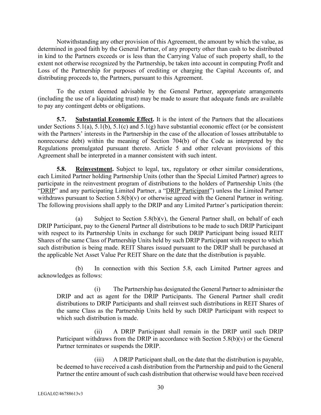 30 LEGAL02/46788613v3 Notwithstanding any other provision of this Agreement, the amount by which the value, as determined in good faith by the General Partner, of any property other than cash to be distributed in kind to the Partners exceeds or is less than the Carrying Value of such property shall, to the extent not otherwise recognized by the Partnership, be taken into account in computing Profit and Loss of the Partnership for purposes of crediting or charging the Capital Accounts of, and distributing proceeds to, the Partners, pursuant to this Agreement. To the extent deemed advisable by the General Partner, appropriate arrangements (including the use of a liquidating trust) may be made to assure that adequate funds are available to pay any contingent debts or obligations. 5.7. Substantial Economic Effect. It is the intent of the Partners that the allocations under Sections 5.1(a), 5.1(b), 5.1(c) and 5.1(g) have substantial economic effect (or be consistent with the Partners’ interests in the Partnership in the case of the allocation of losses attributable to nonrecourse debt) within the meaning of Section 704(b) of the Code as interpreted by the Regulations promulgated pursuant thereto. Article 5 and other relevant provisions of this Agreement shall be interpreted in a manner consistent with such intent. 5.8. Reinvestment. Subject to legal, tax, regulatory or other similar considerations, each Limited Partner holding Partnership Units (other than the Special Limited Partner) agrees to participate in the reinvestment program of distributions to the holders of Partnership Units (the “DRIP” and any participating Limited Partner, a “DRIP Participant”) unless the Limited Partner withdraws pursuant to Section 5.8(b)(v) or otherwise agreed with the General Partner in writing. The following provisions shall apply to the DRIP and any Limited Partner’s participation therein: (a) Subject to Section 5.8(b)(v), the General Partner shall, on behalf of each DRIP Participant, pay to the General Partner all distributions to be made to such DRIP Participant with respect to its Partnership Units in exchange for such DRIP Participant being issued REIT Shares of the same Class of Partnership Units held by such DRIP Participant with respect to which such distribution is being made. REIT Shares issued pursuant to the DRIP shall be purchased at the applicable Net Asset Value Per REIT Share on the date that the distribution is payable. (b) In connection with this Section 5.8, each Limited Partner agrees and acknowledges as follows: (i) The Partnership has designated the General Partner to administer the DRIP and act as agent for the DRIP Participants. The General Partner shall credit distributions to DRIP Participants and shall reinvest such distributions in REIT Shares of the same Class as the Partnership Units held by such DRIP Participant with respect to which such distribution is made. (ii) A DRIP Participant shall remain in the DRIP until such DRIP Participant withdraws from the DRIP in accordance with Section 5.8(b)(v) or the General Partner terminates or suspends the DRIP. (iii) A DRIP Participant shall, on the date that the distribution is payable, be deemed to have received a cash distribution from the Partnership and paid to the General Partner the entire amount of such cash distribution that otherwise would have been received