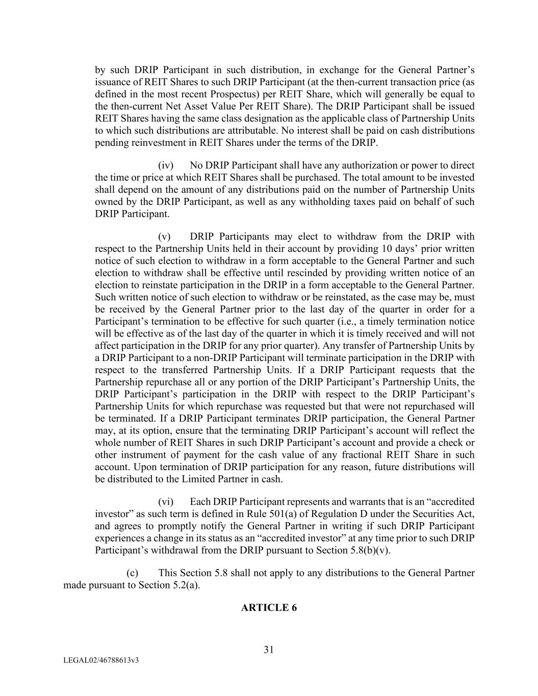 31 LEGAL02/46788613v3 by such DRIP Participant in such distribution, in exchange for the General Partner’s issuance of REIT Shares to such DRIP Participant (at the then-current transaction price (as defined in the most recent Prospectus) per REIT Share, which will generally be equal to the then-current Net Asset Value Per REIT Share). The DRIP Participant shall be issued REIT Shares having the same class designation as the applicable class of Partnership Units to which such distributions are attributable. No interest shall be paid on cash distributions pending reinvestment in REIT Shares under the terms of the DRIP. (iv) No DRIP Participant shall have any authorization or power to direct the time or price at which REIT Shares shall be purchased. The total amount to be invested shall depend on the amount of any distributions paid on the number of Partnership Units owned by the DRIP Participant, as well as any withholding taxes paid on behalf of such DRIP Participant. (v) DRIP Participants may elect to withdraw from the DRIP with respect to the Partnership Units held in their account by providing 10 days’ prior written notice of such election to withdraw in a form acceptable to the General Partner and such election to withdraw shall be effective until rescinded by providing written notice of an election to reinstate participation in the DRIP in a form acceptable to the General Partner. Such written notice of such election to withdraw or be reinstated, as the case may be, must be received by the General Partner prior to the last day of the quarter in order for a Participant’s termination to be effective for such quarter (i.e., a timely termination notice will be effective as of the last day of the quarter in which it is timely received and will not affect participation in the DRIP for any prior quarter). Any transfer of Partnership Units by a DRIP Participant to a non-DRIP Participant will terminate participation in the DRIP with respect to the transferred Partnership Units. If a DRIP Participant requests that the Partnership repurchase all or any portion of the DRIP Participant’s Partnership Units, the DRIP Participant’s participation in the DRIP with respect to the DRIP Participant’s Partnership Units for which repurchase was requested but that were not repurchased will be terminated. If a DRIP Participant terminates DRIP participation, the General Partner may, at its option, ensure that the terminating DRIP Participant’s account will reflect the whole number of REIT Shares in such DRIP Participant’s account and provide a check or other instrument of payment for the cash value of any fractional REIT Share in such account. Upon termination of DRIP participation for any reason, future distributions will be distributed to the Limited Partner in cash. (vi) Each DRIP Participant represents and warrants that is an “accredited investor” as such term is defined in Rule 501(a) of Regulation D under the Securities Act, and agrees to promptly notify the General Partner in writing if such DRIP Participant experiences a change in its status as an “accredited investor” at any time prior to such DRIP Participant’s withdrawal from the DRIP pursuant to Section 5.8(b)(v). (c) This Section 5.8 shall not apply to any distributions to the General Partner made pursuant to Section 5.2(a). ARTICLE 6