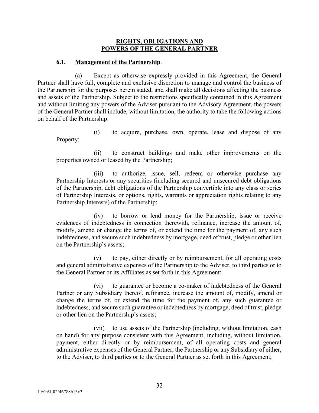 32 LEGAL02/46788613v3 RIGHTS, OBLIGATIONS AND POWERS OF THE GENERAL PARTNER 6.1. Management of the Partnership. (a) Except as otherwise expressly provided in this Agreement, the General Partner shall have full, complete and exclusive discretion to manage and control the business of the Partnership for the purposes herein stated, and shall make all decisions affecting the business and assets of the Partnership. Subject to the restrictions specifically contained in this Agreement and without limiting any powers of the Adviser pursuant to the Advisory Agreement, the powers of the General Partner shall include, without limitation, the authority to take the following actions on behalf of the Partnership: (i) to acquire, purchase, own, operate, lease and dispose of any Property; (ii) to construct buildings and make other improvements on the properties owned or leased by the Partnership; (iii) to authorize, issue, sell, redeem or otherwise purchase any Partnership Interests or any securities (including secured and unsecured debt obligations of the Partnership, debt obligations of the Partnership convertible into any class or series of Partnership Interests, or options, rights, warrants or appreciation rights relating to any Partnership Interests) of the Partnership; (iv) to borrow or lend money for the Partnership, issue or receive evidences of indebtedness in connection therewith, refinance, increase the amount of, modify, amend or change the terms of, or extend the time for the payment of, any such indebtedness, and secure such indebtedness by mortgage, deed of trust, pledge or other lien on the Partnership’s assets; (v) to pay, either directly or by reimbursement, for all operating costs and general administrative expenses of the Partnership to the Adviser, to third parties or to the General Partner or its Affiliates as set forth in this Agreement; (vi) to guarantee or become a co-maker of indebtedness of the General Partner or any Subsidiary thereof, refinance, increase the amount of, modify, amend or change the terms of, or extend the time for the payment of, any such guarantee or indebtedness, and secure such guarantee or indebtedness by mortgage, deed of trust, pledge or other lien on the Partnership’s assets; (vii) to use assets of the Partnership (including, without limitation, cash on hand) for any purpose consistent with this Agreement, including, without limitation, payment, either directly or by reimbursement, of all operating costs and general administrative expenses of the General Partner, the Partnership or any Subsidiary of either, to the Adviser, to third parties or to the General Partner as set forth in this Agreement;