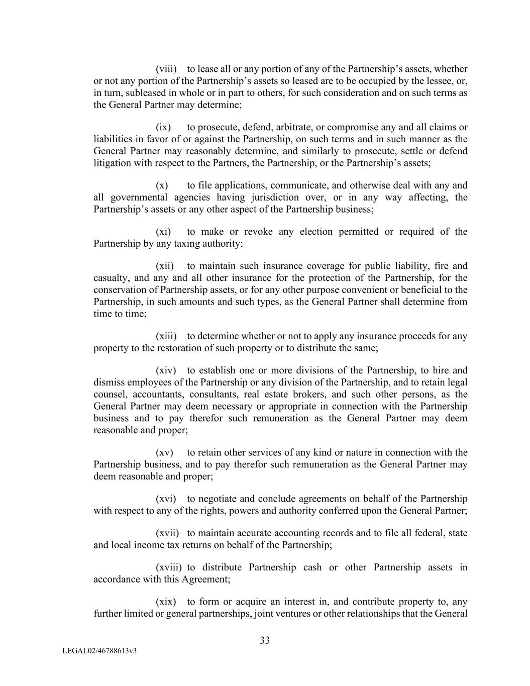 33 LEGAL02/46788613v3 (viii) to lease all or any portion of any of the Partnership’s assets, whether or not any portion of the Partnership’s assets so leased are to be occupied by the lessee, or, in turn, subleased in whole or in part to others, for such consideration and on such terms as the General Partner may determine; (ix) to prosecute, defend, arbitrate, or compromise any and all claims or liabilities in favor of or against the Partnership, on such terms and in such manner as the General Partner may reasonably determine, and similarly to prosecute, settle or defend litigation with respect to the Partners, the Partnership, or the Partnership’s assets; (x) to file applications, communicate, and otherwise deal with any and all governmental agencies having jurisdiction over, or in any way affecting, the Partnership’s assets or any other aspect of the Partnership business; (xi) to make or revoke any election permitted or required of the Partnership by any taxing authority; (xii) to maintain such insurance coverage for public liability, fire and casualty, and any and all other insurance for the protection of the Partnership, for the conservation of Partnership assets, or for any other purpose convenient or beneficial to the Partnership, in such amounts and such types, as the General Partner shall determine from time to time; (xiii) to determine whether or not to apply any insurance proceeds for any property to the restoration of such property or to distribute the same; (xiv) to establish one or more divisions of the Partnership, to hire and dismiss employees of the Partnership or any division of the Partnership, and to retain legal counsel, accountants, consultants, real estate brokers, and such other persons, as the General Partner may deem necessary or appropriate in connection with the Partnership business and to pay therefor such remuneration as the General Partner may deem reasonable and proper; (xv) to retain other services of any kind or nature in connection with the Partnership business, and to pay therefor such remuneration as the General Partner may deem reasonable and proper; (xvi) to negotiate and conclude agreements on behalf of the Partnership with respect to any of the rights, powers and authority conferred upon the General Partner; (xvii) to maintain accurate accounting records and to file all federal, state and local income tax returns on behalf of the Partnership; (xviii) to distribute Partnership cash or other Partnership assets in accordance with this Agreement; (xix) to form or acquire an interest in, and contribute property to, any further limited or general partnerships, joint ventures or other relationships that the General