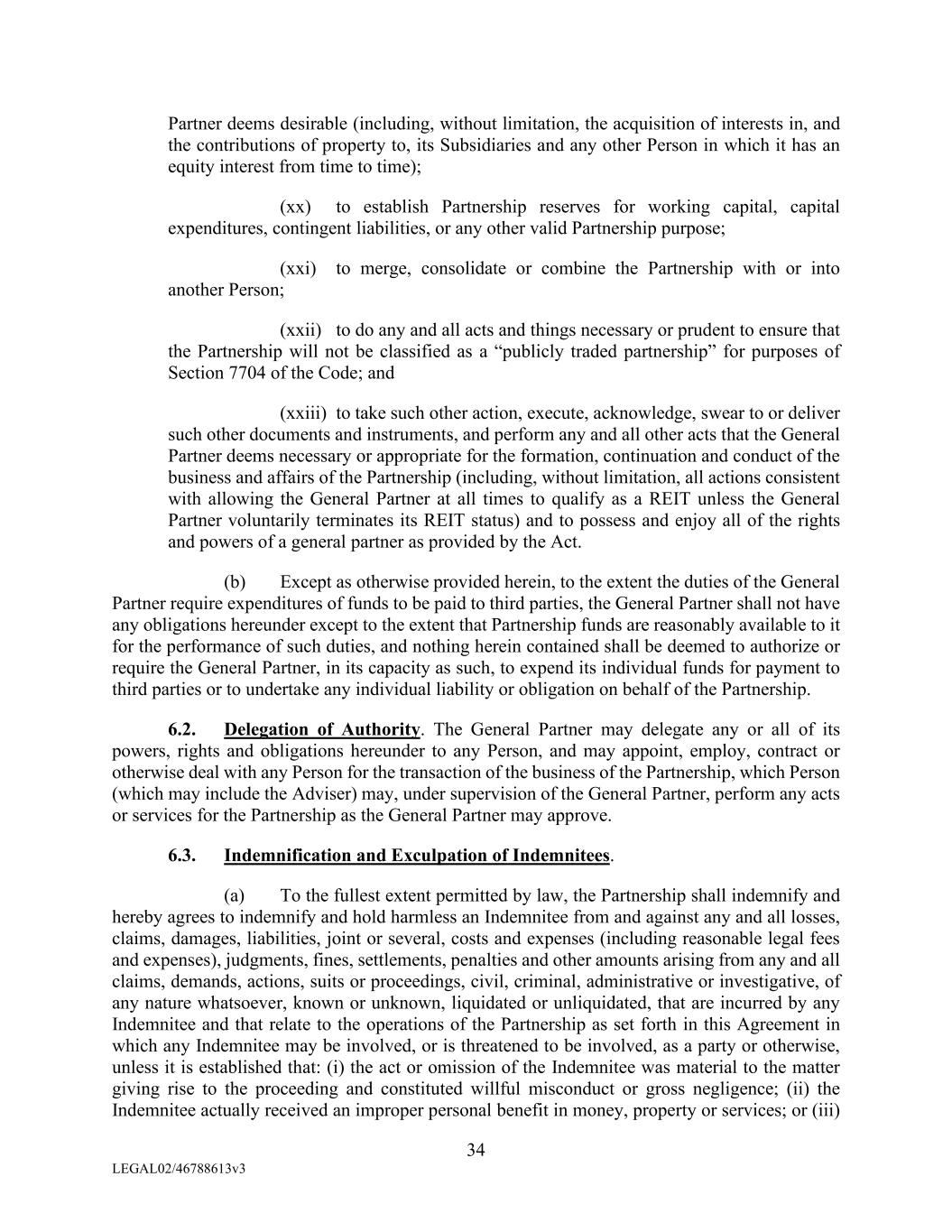 34 LEGAL02/46788613v3 Partner deems desirable (including, without limitation, the acquisition of interests in, and the contributions of property to, its Subsidiaries and any other Person in which it has an equity interest from time to time); (xx) to establish Partnership reserves for working capital, capital expenditures, contingent liabilities, or any other valid Partnership purpose; (xxi) to merge, consolidate or combine the Partnership with or into another Person; (xxii) to do any and all acts and things necessary or prudent to ensure that the Partnership will not be classified as a “publicly traded partnership” for purposes of Section 7704 of the Code; and (xxiii) to take such other action, execute, acknowledge, swear to or deliver such other documents and instruments, and perform any and all other acts that the General Partner deems necessary or appropriate for the formation, continuation and conduct of the business and affairs of the Partnership (including, without limitation, all actions consistent with allowing the General Partner at all times to qualify as a REIT unless the General Partner voluntarily terminates its REIT status) and to possess and enjoy all of the rights and powers of a general partner as provided by the Act. (b) Except as otherwise provided herein, to the extent the duties of the General Partner require expenditures of funds to be paid to third parties, the General Partner shall not have any obligations hereunder except to the extent that Partnership funds are reasonably available to it for the performance of such duties, and nothing herein contained shall be deemed to authorize or require the General Partner, in its capacity as such, to expend its individual funds for payment to third parties or to undertake any individual liability or obligation on behalf of the Partnership. 6.2. Delegation of Authority. The General Partner may delegate any or all of its powers, rights and obligations hereunder to any Person, and may appoint, employ, contract or otherwise deal with any Person for the transaction of the business of the Partnership, which Person (which may include the Adviser) may, under supervision of the General Partner, perform any acts or services for the Partnership as the General Partner may approve. 6.3. Indemnification and Exculpation of Indemnitees. (a) To the fullest extent permitted by law, the Partnership shall indemnify and hereby agrees to indemnify and hold harmless an Indemnitee from and against any and all losses, claims, damages, liabilities, joint or several, costs and expenses (including reasonable legal fees and expenses), judgments, fines, settlements, penalties and other amounts arising from any and all claims, demands, actions, suits or proceedings, civil, criminal, administrative or investigative, of any nature whatsoever, known or unknown, liquidated or unliquidated, that are incurred by any Indemnitee and that relate to the operations of the Partnership as set forth in this Agreement in which any Indemnitee may be involved, or is threatened to be involved, as a party or otherwise, unless it is established that: (i) the act or omission of the Indemnitee was material to the matter giving rise to the proceeding and constituted willful misconduct or gross negligence; (ii) the Indemnitee actually received an improper personal benefit in money, property or services; or (iii)