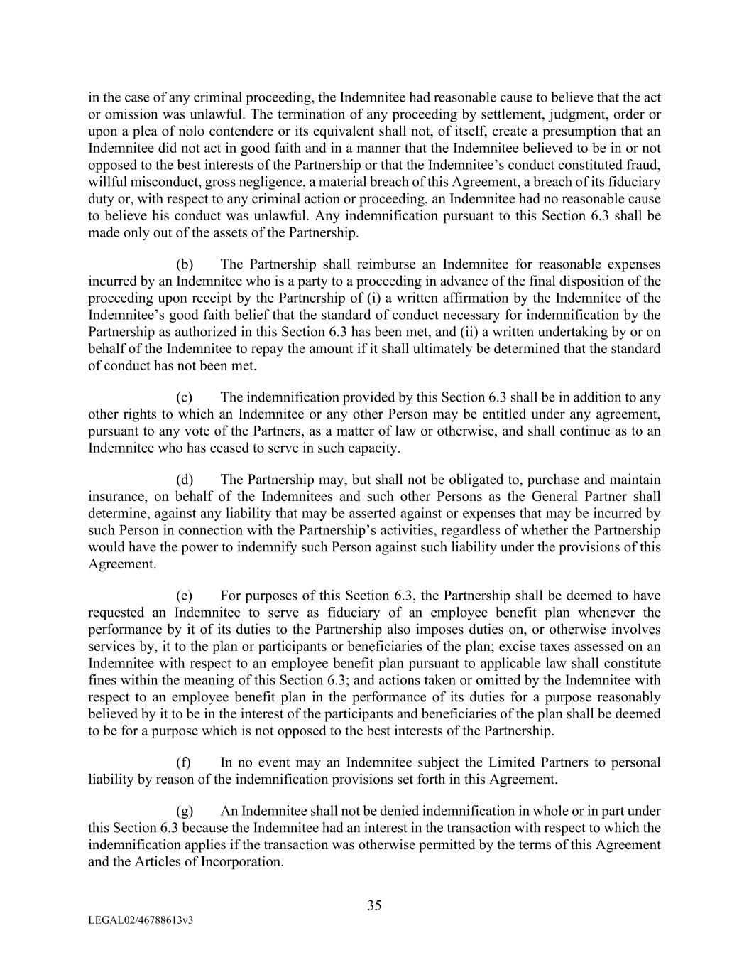 35 LEGAL02/46788613v3 in the case of any criminal proceeding, the Indemnitee had reasonable cause to believe that the act or omission was unlawful. The termination of any proceeding by settlement, judgment, order or upon a plea of nolo contendere or its equivalent shall not, of itself, create a presumption that an Indemnitee did not act in good faith and in a manner that the Indemnitee believed to be in or not opposed to the best interests of the Partnership or that the Indemnitee’s conduct constituted fraud, willful misconduct, gross negligence, a material breach of this Agreement, a breach of its fiduciary duty or, with respect to any criminal action or proceeding, an Indemnitee had no reasonable cause to believe his conduct was unlawful. Any indemnification pursuant to this Section 6.3 shall be made only out of the assets of the Partnership. (b) The Partnership shall reimburse an Indemnitee for reasonable expenses incurred by an Indemnitee who is a party to a proceeding in advance of the final disposition of the proceeding upon receipt by the Partnership of (i) a written affirmation by the Indemnitee of the Indemnitee’s good faith belief that the standard of conduct necessary for indemnification by the Partnership as authorized in this Section 6.3 has been met, and (ii) a written undertaking by or on behalf of the Indemnitee to repay the amount if it shall ultimately be determined that the standard of conduct has not been met. (c) The indemnification provided by this Section 6.3 shall be in addition to any other rights to which an Indemnitee or any other Person may be entitled under any agreement, pursuant to any vote of the Partners, as a matter of law or otherwise, and shall continue as to an Indemnitee who has ceased to serve in such capacity. (d) The Partnership may, but shall not be obligated to, purchase and maintain insurance, on behalf of the Indemnitees and such other Persons as the General Partner shall determine, against any liability that may be asserted against or expenses that may be incurred by such Person in connection with the Partnership’s activities, regardless of whether the Partnership would have the power to indemnify such Person against such liability under the provisions of this Agreement. (e) For purposes of this Section 6.3, the Partnership shall be deemed to have requested an Indemnitee to serve as fiduciary of an employee benefit plan whenever the performance by it of its duties to the Partnership also imposes duties on, or otherwise involves services by, it to the plan or participants or beneficiaries of the plan; excise taxes assessed on an Indemnitee with respect to an employee benefit plan pursuant to applicable law shall constitute fines within the meaning of this Section 6.3; and actions taken or omitted by the Indemnitee with respect to an employee benefit plan in the performance of its duties for a purpose reasonably believed by it to be in the interest of the participants and beneficiaries of the plan shall be deemed to be for a purpose which is not opposed to the best interests of the Partnership. (f) In no event may an Indemnitee subject the Limited Partners to personal liability by reason of the indemnification provisions set forth in this Agreement. (g) An Indemnitee shall not be denied indemnification in whole or in part under this Section 6.3 because the Indemnitee had an interest in the transaction with respect to which the indemnification applies if the transaction was otherwise permitted by the terms of this Agreement and the Articles of Incorporation.