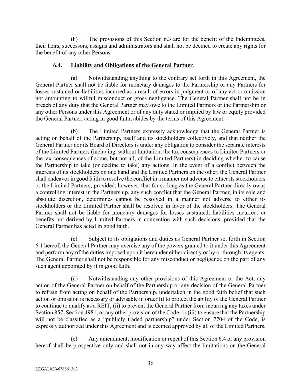 36 LEGAL02/46788613v3 (h) The provisions of this Section 6.3 are for the benefit of the Indemnitees, their heirs, successors, assigns and administrators and shall not be deemed to create any rights for the benefit of any other Persons. 6.4. Liability and Obligations of the General Partner. (a) Notwithstanding anything to the contrary set forth in this Agreement, the General Partner shall not be liable for monetary damages to the Partnership or any Partners for losses sustained or liabilities incurred as a result of errors in judgment or of any act or omission not amounting to willful misconduct or gross negligence. The General Partner shall not be in breach of any duty that the General Partner may owe to the Limited Partners or the Partnership or any other Persons under this Agreement or of any duty stated or implied by law or equity provided the General Partner, acting in good faith, abides by the terms of this Agreement. (b) The Limited Partners expressly acknowledge that the General Partner is acting on behalf of the Partnership, itself and its stockholders collectively, and that neither the General Partner nor its Board of Directors is under any obligation to consider the separate interests of the Limited Partners (including, without limitation, the tax consequences to Limited Partners or the tax consequences of some, but not all, of the Limited Partners) in deciding whether to cause the Partnership to take (or decline to take) any actions. In the event of a conflict between the interests of its stockholders on one hand and the Limited Partners on the other, the General Partner shall endeavor in good faith to resolve the conflict in a manner not adverse to either its stockholders or the Limited Partners; provided, however, that for so long as the General Partner directly owns a controlling interest in the Partnership, any such conflict that the General Partner, in its sole and absolute discretion, determines cannot be resolved in a manner not adverse to either its stockholders or the Limited Partner shall be resolved in favor of the stockholders. The General Partner shall not be liable for monetary damages for losses sustained, liabilities incurred, or benefits not derived by Limited Partners in connection with such decisions, provided that the General Partner has acted in good faith. (c) Subject to its obligations and duties as General Partner set forth in Section 6.1 hereof, the General Partner may exercise any of the powers granted to it under this Agreement and perform any of the duties imposed upon it hereunder either directly or by or through its agents. The General Partner shall not be responsible for any misconduct or negligence on the part of any such agent appointed by it in good faith. (d) Notwithstanding any other provisions of this Agreement or the Act, any action of the General Partner on behalf of the Partnership or any decision of the General Partner to refrain from acting on behalf of the Partnership, undertaken in the good faith belief that such action or omission is necessary or advisable in order (i) to protect the ability of the General Partner to continue to qualify as a REIT, (ii) to prevent the General Partner from incurring any taxes under Section 857, Section 4981, or any other provision of the Code, or (iii) to ensure that the Partnership will not be classified as a “publicly traded partnership” under Section 7704 of the Code, is expressly authorized under this Agreement and is deemed approved by all of the Limited Partners. (e) Any amendment, modification or repeal of this Section 6.4 or any provision hereof shall be prospective only and shall not in any way affect the limitations on the General