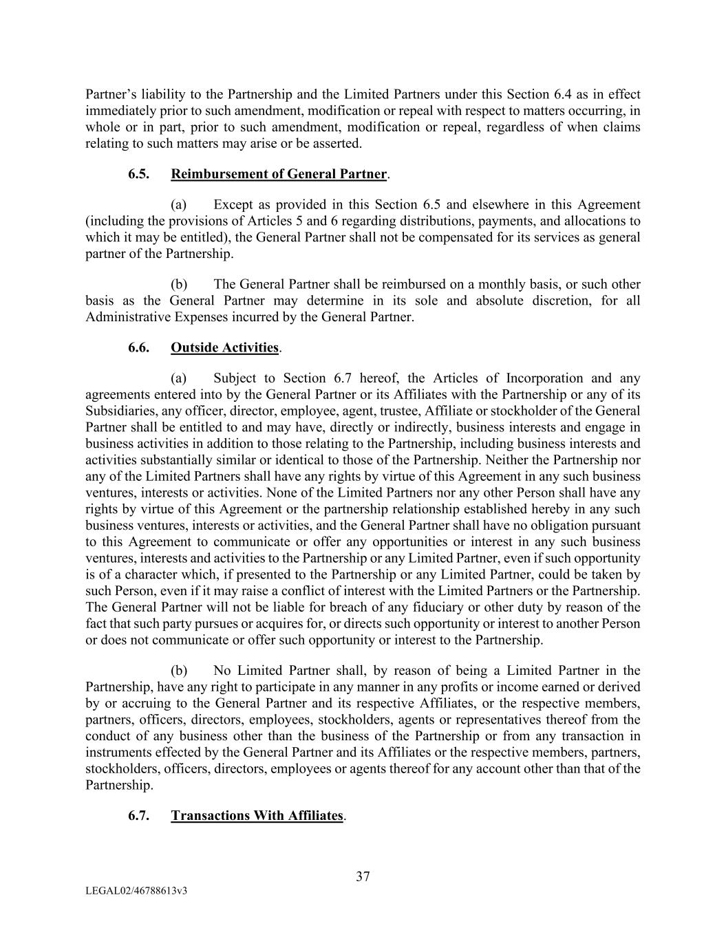 37 LEGAL02/46788613v3 Partner’s liability to the Partnership and the Limited Partners under this Section 6.4 as in effect immediately prior to such amendment, modification or repeal with respect to matters occurring, in whole or in part, prior to such amendment, modification or repeal, regardless of when claims relating to such matters may arise or be asserted. 6.5. Reimbursement of General Partner. (a) Except as provided in this Section 6.5 and elsewhere in this Agreement (including the provisions of Articles 5 and 6 regarding distributions, payments, and allocations to which it may be entitled), the General Partner shall not be compensated for its services as general partner of the Partnership. (b) The General Partner shall be reimbursed on a monthly basis, or such other basis as the General Partner may determine in its sole and absolute discretion, for all Administrative Expenses incurred by the General Partner. 6.6. Outside Activities. (a) Subject to Section 6.7 hereof, the Articles of Incorporation and any agreements entered into by the General Partner or its Affiliates with the Partnership or any of its Subsidiaries, any officer, director, employee, agent, trustee, Affiliate or stockholder of the General Partner shall be entitled to and may have, directly or indirectly, business interests and engage in business activities in addition to those relating to the Partnership, including business interests and activities substantially similar or identical to those of the Partnership. Neither the Partnership nor any of the Limited Partners shall have any rights by virtue of this Agreement in any such business ventures, interests or activities. None of the Limited Partners nor any other Person shall have any rights by virtue of this Agreement or the partnership relationship established hereby in any such business ventures, interests or activities, and the General Partner shall have no obligation pursuant to this Agreement to communicate or offer any opportunities or interest in any such business ventures, interests and activities to the Partnership or any Limited Partner, even if such opportunity is of a character which, if presented to the Partnership or any Limited Partner, could be taken by such Person, even if it may raise a conflict of interest with the Limited Partners or the Partnership. The General Partner will not be liable for breach of any fiduciary or other duty by reason of the fact that such party pursues or acquires for, or directs such opportunity or interest to another Person or does not communicate or offer such opportunity or interest to the Partnership. (b) No Limited Partner shall, by reason of being a Limited Partner in the Partnership, have any right to participate in any manner in any profits or income earned or derived by or accruing to the General Partner and its respective Affiliates, or the respective members, partners, officers, directors, employees, stockholders, agents or representatives thereof from the conduct of any business other than the business of the Partnership or from any transaction in instruments effected by the General Partner and its Affiliates or the respective members, partners, stockholders, officers, directors, employees or agents thereof for any account other than that of the Partnership. 6.7. Transactions With Affiliates.
