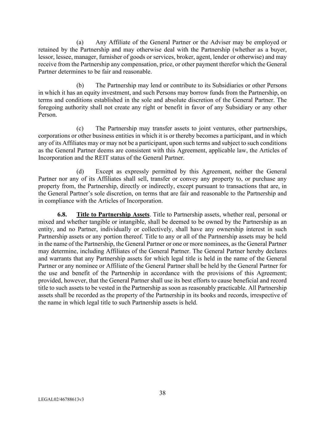 38 LEGAL02/46788613v3 (a) Any Affiliate of the General Partner or the Adviser may be employed or retained by the Partnership and may otherwise deal with the Partnership (whether as a buyer, lessor, lessee, manager, furnisher of goods or services, broker, agent, lender or otherwise) and may receive from the Partnership any compensation, price, or other payment therefor which the General Partner determines to be fair and reasonable. (b) The Partnership may lend or contribute to its Subsidiaries or other Persons in which it has an equity investment, and such Persons may borrow funds from the Partnership, on terms and conditions established in the sole and absolute discretion of the General Partner. The foregoing authority shall not create any right or benefit in favor of any Subsidiary or any other Person. (c) The Partnership may transfer assets to joint ventures, other partnerships, corporations or other business entities in which it is or thereby becomes a participant, and in which any of its Affiliates may or may not be a participant, upon such terms and subject to such conditions as the General Partner deems are consistent with this Agreement, applicable law, the Articles of Incorporation and the REIT status of the General Partner. (d) Except as expressly permitted by this Agreement, neither the General Partner nor any of its Affiliates shall sell, transfer or convey any property to, or purchase any property from, the Partnership, directly or indirectly, except pursuant to transactions that are, in the General Partner’s sole discretion, on terms that are fair and reasonable to the Partnership and in compliance with the Articles of Incorporation. 6.8. Title to Partnership Assets. Title to Partnership assets, whether real, personal or mixed and whether tangible or intangible, shall be deemed to be owned by the Partnership as an entity, and no Partner, individually or collectively, shall have any ownership interest in such Partnership assets or any portion thereof. Title to any or all of the Partnership assets may be held in the name of the Partnership, the General Partner or one or more nominees, as the General Partner may determine, including Affiliates of the General Partner. The General Partner hereby declares and warrants that any Partnership assets for which legal title is held in the name of the General Partner or any nominee or Affiliate of the General Partner shall be held by the General Partner for the use and benefit of the Partnership in accordance with the provisions of this Agreement; provided, however, that the General Partner shall use its best efforts to cause beneficial and record title to such assets to be vested in the Partnership as soon as reasonably practicable. All Partnership assets shall be recorded as the property of the Partnership in its books and records, irrespective of the name in which legal title to such Partnership assets is held.