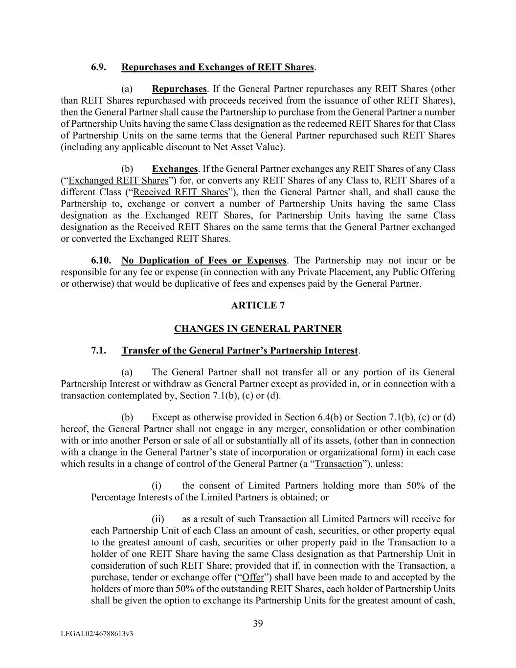 39 LEGAL02/46788613v3 6.9. Repurchases and Exchanges of REIT Shares. (a) Repurchases. If the General Partner repurchases any REIT Shares (other than REIT Shares repurchased with proceeds received from the issuance of other REIT Shares), then the General Partner shall cause the Partnership to purchase from the General Partner a number of Partnership Units having the same Class designation as the redeemed REIT Shares for that Class of Partnership Units on the same terms that the General Partner repurchased such REIT Shares (including any applicable discount to Net Asset Value). (b) Exchanges. If the General Partner exchanges any REIT Shares of any Class (“Exchanged REIT Shares”) for, or converts any REIT Shares of any Class to, REIT Shares of a different Class (“Received REIT Shares”), then the General Partner shall, and shall cause the Partnership to, exchange or convert a number of Partnership Units having the same Class designation as the Exchanged REIT Shares, for Partnership Units having the same Class designation as the Received REIT Shares on the same terms that the General Partner exchanged or converted the Exchanged REIT Shares. 6.10. No Duplication of Fees or Expenses. The Partnership may not incur or be responsible for any fee or expense (in connection with any Private Placement, any Public Offering or otherwise) that would be duplicative of fees and expenses paid by the General Partner. ARTICLE 7 CHANGES IN GENERAL PARTNER 7.1. Transfer of the General Partner’s Partnership Interest. (a) The General Partner shall not transfer all or any portion of its General Partnership Interest or withdraw as General Partner except as provided in, or in connection with a transaction contemplated by, Section 7.1(b), (c) or (d). (b) Except as otherwise provided in Section 6.4(b) or Section 7.1(b), (c) or (d) hereof, the General Partner shall not engage in any merger, consolidation or other combination with or into another Person or sale of all or substantially all of its assets, (other than in connection with a change in the General Partner’s state of incorporation or organizational form) in each case which results in a change of control of the General Partner (a “Transaction”), unless: (i) the consent of Limited Partners holding more than 50% of the Percentage Interests of the Limited Partners is obtained; or (ii) as a result of such Transaction all Limited Partners will receive for each Partnership Unit of each Class an amount of cash, securities, or other property equal to the greatest amount of cash, securities or other property paid in the Transaction to a holder of one REIT Share having the same Class designation as that Partnership Unit in consideration of such REIT Share; provided that if, in connection with the Transaction, a purchase, tender or exchange offer (“Offer”) shall have been made to and accepted by the holders of more than 50% of the outstanding REIT Shares, each holder of Partnership Units shall be given the option to exchange its Partnership Units for the greatest amount of cash,