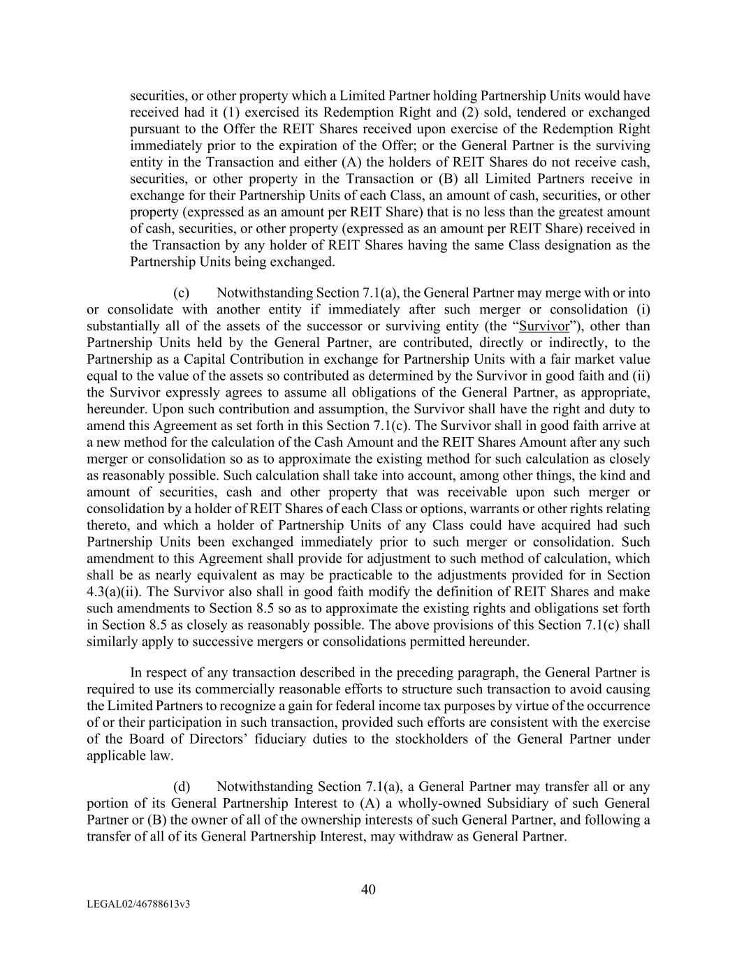 40 LEGAL02/46788613v3 securities, or other property which a Limited Partner holding Partnership Units would have received had it (1) exercised its Redemption Right and (2) sold, tendered or exchanged pursuant to the Offer the REIT Shares received upon exercise of the Redemption Right immediately prior to the expiration of the Offer; or the General Partner is the surviving entity in the Transaction and either (A) the holders of REIT Shares do not receive cash, securities, or other property in the Transaction or (B) all Limited Partners receive in exchange for their Partnership Units of each Class, an amount of cash, securities, or other property (expressed as an amount per REIT Share) that is no less than the greatest amount of cash, securities, or other property (expressed as an amount per REIT Share) received in the Transaction by any holder of REIT Shares having the same Class designation as the Partnership Units being exchanged. (c) Notwithstanding Section 7.1(a), the General Partner may merge with or into or consolidate with another entity if immediately after such merger or consolidation (i) substantially all of the assets of the successor or surviving entity (the “Survivor”), other than Partnership Units held by the General Partner, are contributed, directly or indirectly, to the Partnership as a Capital Contribution in exchange for Partnership Units with a fair market value equal to the value of the assets so contributed as determined by the Survivor in good faith and (ii) the Survivor expressly agrees to assume all obligations of the General Partner, as appropriate, hereunder. Upon such contribution and assumption, the Survivor shall have the right and duty to amend this Agreement as set forth in this Section 7.1(c). The Survivor shall in good faith arrive at a new method for the calculation of the Cash Amount and the REIT Shares Amount after any such merger or consolidation so as to approximate the existing method for such calculation as closely as reasonably possible. Such calculation shall take into account, among other things, the kind and amount of securities, cash and other property that was receivable upon such merger or consolidation by a holder of REIT Shares of each Class or options, warrants or other rights relating thereto, and which a holder of Partnership Units of any Class could have acquired had such Partnership Units been exchanged immediately prior to such merger or consolidation. Such amendment to this Agreement shall provide for adjustment to such method of calculation, which shall be as nearly equivalent as may be practicable to the adjustments provided for in Section 4.3(a)(ii). The Survivor also shall in good faith modify the definition of REIT Shares and make such amendments to Section 8.5 so as to approximate the existing rights and obligations set forth in Section 8.5 as closely as reasonably possible. The above provisions of this Section 7.1(c) shall similarly apply to successive mergers or consolidations permitted hereunder. In respect of any transaction described in the preceding paragraph, the General Partner is required to use its commercially reasonable efforts to structure such transaction to avoid causing the Limited Partners to recognize a gain for federal income tax purposes by virtue of the occurrence of or their participation in such transaction, provided such efforts are consistent with the exercise of the Board of Directors’ fiduciary duties to the stockholders of the General Partner under applicable law. (d) Notwithstanding Section 7.1(a), a General Partner may transfer all or any portion of its General Partnership Interest to (A) a wholly-owned Subsidiary of such General Partner or (B) the owner of all of the ownership interests of such General Partner, and following a transfer of all of its General Partnership Interest, may withdraw as General Partner.