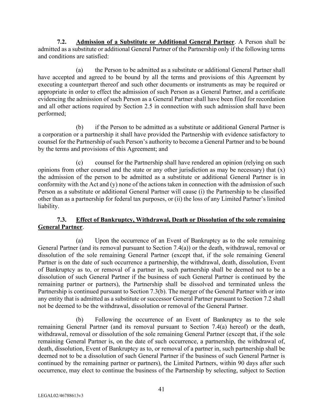 41 LEGAL02/46788613v3 7.2. Admission of a Substitute or Additional General Partner. A Person shall be admitted as a substitute or additional General Partner of the Partnership only if the following terms and conditions are satisfied: (a) the Person to be admitted as a substitute or additional General Partner shall have accepted and agreed to be bound by all the terms and provisions of this Agreement by executing a counterpart thereof and such other documents or instruments as may be required or appropriate in order to effect the admission of such Person as a General Partner, and a certificate evidencing the admission of such Person as a General Partner shall have been filed for recordation and all other actions required by Section 2.5 in connection with such admission shall have been performed; (b) if the Person to be admitted as a substitute or additional General Partner is a corporation or a partnership it shall have provided the Partnership with evidence satisfactory to counsel for the Partnership of such Person’s authority to become a General Partner and to be bound by the terms and provisions of this Agreement; and (c) counsel for the Partnership shall have rendered an opinion (relying on such opinions from other counsel and the state or any other jurisdiction as may be necessary) that (x) the admission of the person to be admitted as a substitute or additional General Partner is in conformity with the Act and (y) none of the actions taken in connection with the admission of such Person as a substitute or additional General Partner will cause (i) the Partnership to be classified other than as a partnership for federal tax purposes, or (ii) the loss of any Limited Partner’s limited liability. 7.3. Effect of Bankruptcy, Withdrawal, Death or Dissolution of the sole remaining General Partner. (a) Upon the occurrence of an Event of Bankruptcy as to the sole remaining General Partner (and its removal pursuant to Section 7.4(a)) or the death, withdrawal, removal or dissolution of the sole remaining General Partner (except that, if the sole remaining General Partner is on the date of such occurrence a partnership, the withdrawal, death, dissolution, Event of Bankruptcy as to, or removal of a partner in, such partnership shall be deemed not to be a dissolution of such General Partner if the business of such General Partner is continued by the remaining partner or partners), the Partnership shall be dissolved and terminated unless the Partnership is continued pursuant to Section 7.3(b). The merger of the General Partner with or into any entity that is admitted as a substitute or successor General Partner pursuant to Section 7.2 shall not be deemed to be the withdrawal, dissolution or removal of the General Partner. (b) Following the occurrence of an Event of Bankruptcy as to the sole remaining General Partner (and its removal pursuant to Section 7.4(a) hereof) or the death, withdrawal, removal or dissolution of the sole remaining General Partner (except that, if the sole remaining General Partner is, on the date of such occurrence, a partnership, the withdrawal of, death, dissolution, Event of Bankruptcy as to, or removal of a partner in, such partnership shall be deemed not to be a dissolution of such General Partner if the business of such General Partner is continued by the remaining partner or partners), the Limited Partners, within 90 days after such occurrence, may elect to continue the business of the Partnership by selecting, subject to Section