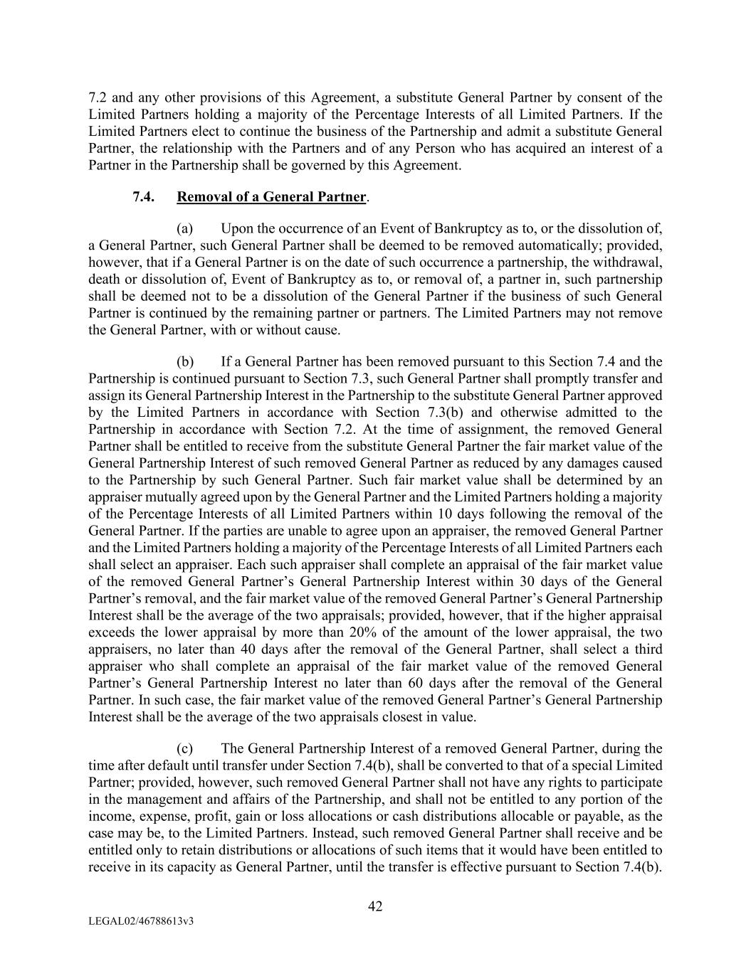 42 LEGAL02/46788613v3 7.2 and any other provisions of this Agreement, a substitute General Partner by consent of the Limited Partners holding a majority of the Percentage Interests of all Limited Partners. If the Limited Partners elect to continue the business of the Partnership and admit a substitute General Partner, the relationship with the Partners and of any Person who has acquired an interest of a Partner in the Partnership shall be governed by this Agreement. 7.4. Removal of a General Partner. (a) Upon the occurrence of an Event of Bankruptcy as to, or the dissolution of, a General Partner, such General Partner shall be deemed to be removed automatically; provided, however, that if a General Partner is on the date of such occurrence a partnership, the withdrawal, death or dissolution of, Event of Bankruptcy as to, or removal of, a partner in, such partnership shall be deemed not to be a dissolution of the General Partner if the business of such General Partner is continued by the remaining partner or partners. The Limited Partners may not remove the General Partner, with or without cause. (b) If a General Partner has been removed pursuant to this Section 7.4 and the Partnership is continued pursuant to Section 7.3, such General Partner shall promptly transfer and assign its General Partnership Interest in the Partnership to the substitute General Partner approved by the Limited Partners in accordance with Section 7.3(b) and otherwise admitted to the Partnership in accordance with Section 7.2. At the time of assignment, the removed General Partner shall be entitled to receive from the substitute General Partner the fair market value of the General Partnership Interest of such removed General Partner as reduced by any damages caused to the Partnership by such General Partner. Such fair market value shall be determined by an appraiser mutually agreed upon by the General Partner and the Limited Partners holding a majority of the Percentage Interests of all Limited Partners within 10 days following the removal of the General Partner. If the parties are unable to agree upon an appraiser, the removed General Partner and the Limited Partners holding a majority of the Percentage Interests of all Limited Partners each shall select an appraiser. Each such appraiser shall complete an appraisal of the fair market value of the removed General Partner’s General Partnership Interest within 30 days of the General Partner’s removal, and the fair market value of the removed General Partner’s General Partnership Interest shall be the average of the two appraisals; provided, however, that if the higher appraisal exceeds the lower appraisal by more than 20% of the amount of the lower appraisal, the two appraisers, no later than 40 days after the removal of the General Partner, shall select a third appraiser who shall complete an appraisal of the fair market value of the removed General Partner’s General Partnership Interest no later than 60 days after the removal of the General Partner. In such case, the fair market value of the removed General Partner’s General Partnership Interest shall be the average of the two appraisals closest in value. (c) The General Partnership Interest of a removed General Partner, during the time after default until transfer under Section 7.4(b), shall be converted to that of a special Limited Partner; provided, however, such removed General Partner shall not have any rights to participate in the management and affairs of the Partnership, and shall not be entitled to any portion of the income, expense, profit, gain or loss allocations or cash distributions allocable or payable, as the case may be, to the Limited Partners. Instead, such removed General Partner shall receive and be entitled only to retain distributions or allocations of such items that it would have been entitled to receive in its capacity as General Partner, until the transfer is effective pursuant to Section 7.4(b).