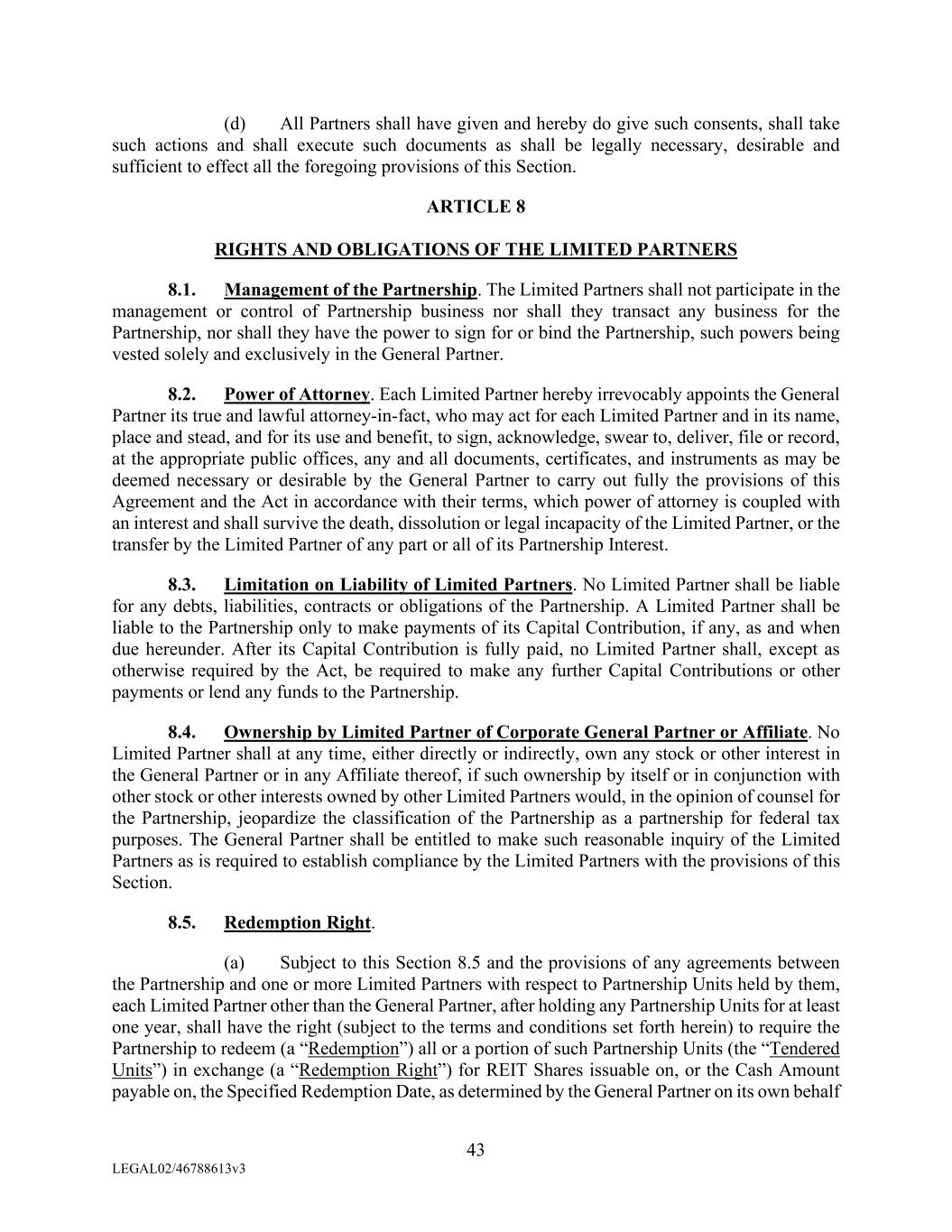43 LEGAL02/46788613v3 (d) All Partners shall have given and hereby do give such consents, shall take such actions and shall execute such documents as shall be legally necessary, desirable and sufficient to effect all the foregoing provisions of this Section. ARTICLE 8 RIGHTS AND OBLIGATIONS OF THE LIMITED PARTNERS 8.1. Management of the Partnership. The Limited Partners shall not participate in the management or control of Partnership business nor shall they transact any business for the Partnership, nor shall they have the power to sign for or bind the Partnership, such powers being vested solely and exclusively in the General Partner. 8.2. Power of Attorney. Each Limited Partner hereby irrevocably appoints the General Partner its true and lawful attorney-in-fact, who may act for each Limited Partner and in its name, place and stead, and for its use and benefit, to sign, acknowledge, swear to, deliver, file or record, at the appropriate public offices, any and all documents, certificates, and instruments as may be deemed necessary or desirable by the General Partner to carry out fully the provisions of this Agreement and the Act in accordance with their terms, which power of attorney is coupled with an interest and shall survive the death, dissolution or legal incapacity of the Limited Partner, or the transfer by the Limited Partner of any part or all of its Partnership Interest. 8.3. Limitation on Liability of Limited Partners. No Limited Partner shall be liable for any debts, liabilities, contracts or obligations of the Partnership. A Limited Partner shall be liable to the Partnership only to make payments of its Capital Contribution, if any, as and when due hereunder. After its Capital Contribution is fully paid, no Limited Partner shall, except as otherwise required by the Act, be required to make any further Capital Contributions or other payments or lend any funds to the Partnership. 8.4. Ownership by Limited Partner of Corporate General Partner or Affiliate. No Limited Partner shall at any time, either directly or indirectly, own any stock or other interest in the General Partner or in any Affiliate thereof, if such ownership by itself or in conjunction with other stock or other interests owned by other Limited Partners would, in the opinion of counsel for the Partnership, jeopardize the classification of the Partnership as a partnership for federal tax purposes. The General Partner shall be entitled to make such reasonable inquiry of the Limited Partners as is required to establish compliance by the Limited Partners with the provisions of this Section. 8.5. Redemption Right. (a) Subject to this Section 8.5 and the provisions of any agreements between the Partnership and one or more Limited Partners with respect to Partnership Units held by them, each Limited Partner other than the General Partner, after holding any Partnership Units for at least one year, shall have the right (subject to the terms and conditions set forth herein) to require the Partnership to redeem (a “Redemption”) all or a portion of such Partnership Units (the “Tendered Units”) in exchange (a “Redemption Right”) for REIT Shares issuable on, or the Cash Amount payable on, the Specified Redemption Date, as determined by the General Partner on its own behalf