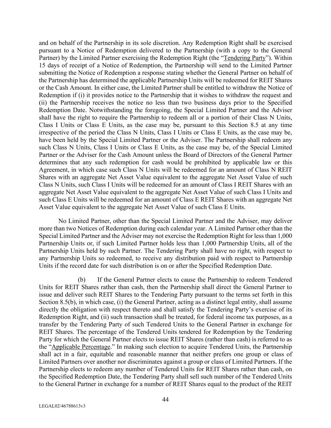 44 LEGAL02/46788613v3 and on behalf of the Partnership in its sole discretion. Any Redemption Right shall be exercised pursuant to a Notice of Redemption delivered to the Partnership (with a copy to the General Partner) by the Limited Partner exercising the Redemption Right (the “Tendering Party”). Within 15 days of receipt of a Notice of Redemption, the Partnership will send to the Limited Partner submitting the Notice of Redemption a response stating whether the General Partner on behalf of the Partnership has determined the applicable Partnership Units will be redeemed for REIT Shares or the Cash Amount. In either case, the Limited Partner shall be entitled to withdraw the Notice of Redemption if (i) it provides notice to the Partnership that it wishes to withdraw the request and (ii) the Partnership receives the notice no less than two business days prior to the Specified Redemption Date. Notwithstanding the foregoing, the Special Limited Partner and the Adviser shall have the right to require the Partnership to redeem all or a portion of their Class N Units, Class I Units or Class E Units, as the case may be, pursuant to this Section 8.5 at any time irrespective of the period the Class N Units, Class I Units or Class E Units, as the case may be, have been held by the Special Limited Partner or the Adviser. The Partnership shall redeem any such Class N Units, Class I Units or Class E Units, as the case may be, of the Special Limited Partner or the Adviser for the Cash Amount unless the Board of Directors of the General Partner determines that any such redemption for cash would be prohibited by applicable law or this Agreement, in which case such Class N Units will be redeemed for an amount of Class N REIT Shares with an aggregate Net Asset Value equivalent to the aggregate Net Asset Value of such Class N Units, such Class I Units will be redeemed for an amount of Class I REIT Shares with an aggregate Net Asset Value equivalent to the aggregate Net Asset Value of such Class I Units and such Class E Units will be redeemed for an amount of Class E REIT Shares with an aggregate Net Asset Value equivalent to the aggregate Net Asset Value of such Class E Units. No Limited Partner, other than the Special Limited Partner and the Adviser, may deliver more than two Notices of Redemption during each calendar year. A Limited Partner other than the Special Limited Partner and the Adviser may not exercise the Redemption Right for less than 1,000 Partnership Units or, if such Limited Partner holds less than 1,000 Partnership Units, all of the Partnership Units held by such Partner. The Tendering Party shall have no right, with respect to any Partnership Units so redeemed, to receive any distribution paid with respect to Partnership Units if the record date for such distribution is on or after the Specified Redemption Date. (b) If the General Partner elects to cause the Partnership to redeem Tendered Units for REIT Shares rather than cash, then the Partnership shall direct the General Partner to issue and deliver such REIT Shares to the Tendering Party pursuant to the terms set forth in this Section 8.5(b), in which case, (i) the General Partner, acting as a distinct legal entity, shall assume directly the obligation with respect thereto and shall satisfy the Tendering Party’s exercise of its Redemption Right, and (ii) such transaction shall be treated, for federal income tax purposes, as a transfer by the Tendering Party of such Tendered Units to the General Partner in exchange for REIT Shares. The percentage of the Tendered Units tendered for Redemption by the Tendering Party for which the General Partner elects to issue REIT Shares (rather than cash) is referred to as the “Applicable Percentage.” In making such election to acquire Tendered Units, the Partnership shall act in a fair, equitable and reasonable manner that neither prefers one group or class of Limited Partners over another nor discriminates against a group or class of Limited Partners. If the Partnership elects to redeem any number of Tendered Units for REIT Shares rather than cash, on the Specified Redemption Date, the Tendering Party shall sell such number of the Tendered Units to the General Partner in exchange for a number of REIT Shares equal to the product of the REIT