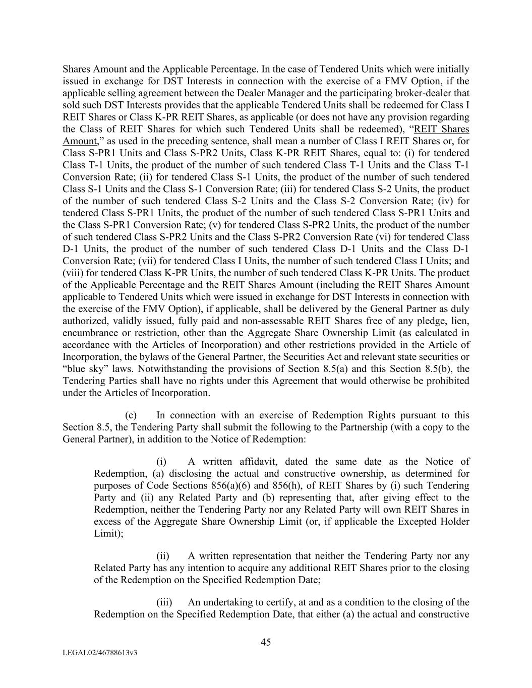45 LEGAL02/46788613v3 Shares Amount and the Applicable Percentage. In the case of Tendered Units which were initially issued in exchange for DST Interests in connection with the exercise of a FMV Option, if the applicable selling agreement between the Dealer Manager and the participating broker-dealer that sold such DST Interests provides that the applicable Tendered Units shall be redeemed for Class I REIT Shares or Class K-PR REIT Shares, as applicable (or does not have any provision regarding the Class of REIT Shares for which such Tendered Units shall be redeemed), “REIT Shares Amount,” as used in the preceding sentence, shall mean a number of Class I REIT Shares or, for Class S-PR1 Units and Class S-PR2 Units, Class K-PR REIT Shares, equal to: (i) for tendered Class T-1 Units, the product of the number of such tendered Class T-1 Units and the Class T-1 Conversion Rate; (ii) for tendered Class S-1 Units, the product of the number of such tendered Class S-1 Units and the Class S-1 Conversion Rate; (iii) for tendered Class S-2 Units, the product of the number of such tendered Class S-2 Units and the Class S-2 Conversion Rate; (iv) for tendered Class S-PR1 Units, the product of the number of such tendered Class S-PR1 Units and the Class S-PR1 Conversion Rate; (v) for tendered Class S-PR2 Units, the product of the number of such tendered Class S-PR2 Units and the Class S-PR2 Conversion Rate (vi) for tendered Class D-1 Units, the product of the number of such tendered Class D-1 Units and the Class D-1 Conversion Rate; (vii) for tendered Class I Units, the number of such tendered Class I Units; and (viii) for tendered Class K-PR Units, the number of such tendered Class K-PR Units. The product of the Applicable Percentage and the REIT Shares Amount (including the REIT Shares Amount applicable to Tendered Units which were issued in exchange for DST Interests in connection with the exercise of the FMV Option), if applicable, shall be delivered by the General Partner as duly authorized, validly issued, fully paid and non-assessable REIT Shares free of any pledge, lien, encumbrance or restriction, other than the Aggregate Share Ownership Limit (as calculated in accordance with the Articles of Incorporation) and other restrictions provided in the Article of Incorporation, the bylaws of the General Partner, the Securities Act and relevant state securities or “blue sky” laws. Notwithstanding the provisions of Section 8.5(a) and this Section 8.5(b), the Tendering Parties shall have no rights under this Agreement that would otherwise be prohibited under the Articles of Incorporation. (c) In connection with an exercise of Redemption Rights pursuant to this Section 8.5, the Tendering Party shall submit the following to the Partnership (with a copy to the General Partner), in addition to the Notice of Redemption: (i) A written affidavit, dated the same date as the Notice of Redemption, (a) disclosing the actual and constructive ownership, as determined for purposes of Code Sections 856(a)(6) and 856(h), of REIT Shares by (i) such Tendering Party and (ii) any Related Party and (b) representing that, after giving effect to the Redemption, neither the Tendering Party nor any Related Party will own REIT Shares in excess of the Aggregate Share Ownership Limit (or, if applicable the Excepted Holder Limit); (ii) A written representation that neither the Tendering Party nor any Related Party has any intention to acquire any additional REIT Shares prior to the closing of the Redemption on the Specified Redemption Date; (iii) An undertaking to certify, at and as a condition to the closing of the Redemption on the Specified Redemption Date, that either (a) the actual and constructive
