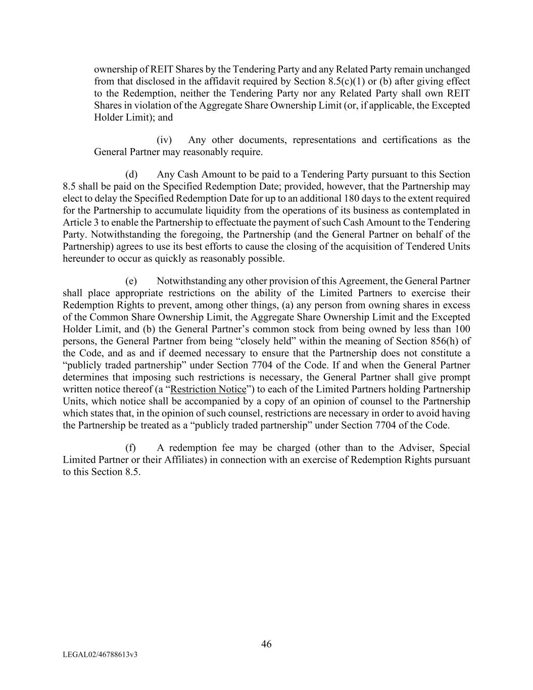 46 LEGAL02/46788613v3 ownership of REIT Shares by the Tendering Party and any Related Party remain unchanged from that disclosed in the affidavit required by Section 8.5(c)(1) or (b) after giving effect to the Redemption, neither the Tendering Party nor any Related Party shall own REIT Shares in violation of the Aggregate Share Ownership Limit (or, if applicable, the Excepted Holder Limit); and (iv) Any other documents, representations and certifications as the General Partner may reasonably require. (d) Any Cash Amount to be paid to a Tendering Party pursuant to this Section 8.5 shall be paid on the Specified Redemption Date; provided, however, that the Partnership may elect to delay the Specified Redemption Date for up to an additional 180 days to the extent required for the Partnership to accumulate liquidity from the operations of its business as contemplated in Article 3 to enable the Partnership to effectuate the payment of such Cash Amount to the Tendering Party. Notwithstanding the foregoing, the Partnership (and the General Partner on behalf of the Partnership) agrees to use its best efforts to cause the closing of the acquisition of Tendered Units hereunder to occur as quickly as reasonably possible. (e) Notwithstanding any other provision of this Agreement, the General Partner shall place appropriate restrictions on the ability of the Limited Partners to exercise their Redemption Rights to prevent, among other things, (a) any person from owning shares in excess of the Common Share Ownership Limit, the Aggregate Share Ownership Limit and the Excepted Holder Limit, and (b) the General Partner’s common stock from being owned by less than 100 persons, the General Partner from being “closely held” within the meaning of Section 856(h) of the Code, and as and if deemed necessary to ensure that the Partnership does not constitute a “publicly traded partnership” under Section 7704 of the Code. If and when the General Partner determines that imposing such restrictions is necessary, the General Partner shall give prompt written notice thereof (a “Restriction Notice”) to each of the Limited Partners holding Partnership Units, which notice shall be accompanied by a copy of an opinion of counsel to the Partnership which states that, in the opinion of such counsel, restrictions are necessary in order to avoid having the Partnership be treated as a “publicly traded partnership” under Section 7704 of the Code. (f) A redemption fee may be charged (other than to the Adviser, Special Limited Partner or their Affiliates) in connection with an exercise of Redemption Rights pursuant to this Section 8.5.