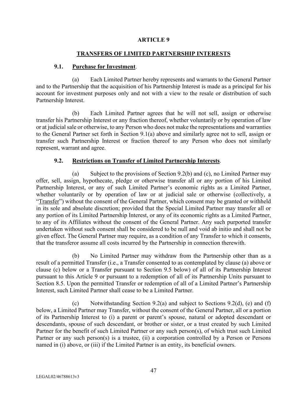 47 LEGAL02/46788613v3 ARTICLE 9 TRANSFERS OF LIMITED PARTNERSHIP INTERESTS 9.1. Purchase for Investment. (a) Each Limited Partner hereby represents and warrants to the General Partner and to the Partnership that the acquisition of his Partnership Interest is made as a principal for his account for investment purposes only and not with a view to the resale or distribution of such Partnership Interest. (b) Each Limited Partner agrees that he will not sell, assign or otherwise transfer his Partnership Interest or any fraction thereof, whether voluntarily or by operation of law or at judicial sale or otherwise, to any Person who does not make the representations and warranties to the General Partner set forth in Section 9.1(a) above and similarly agree not to sell, assign or transfer such Partnership Interest or fraction thereof to any Person who does not similarly represent, warrant and agree. 9.2. Restrictions on Transfer of Limited Partnership Interests. (a) Subject to the provisions of Section 9.2(b) and (c), no Limited Partner may offer, sell, assign, hypothecate, pledge or otherwise transfer all or any portion of his Limited Partnership Interest, or any of such Limited Partner’s economic rights as a Limited Partner, whether voluntarily or by operation of law or at judicial sale or otherwise (collectively, a “Transfer”) without the consent of the General Partner, which consent may be granted or withheld in its sole and absolute discretion; provided that the Special Limited Partner may transfer all or any portion of its Limited Partnership Interest, or any of its economic rights as a Limited Partner, to any of its Affiliates without the consent of the General Partner. Any such purported transfer undertaken without such consent shall be considered to be null and void ab initio and shall not be given effect. The General Partner may require, as a condition of any Transfer to which it consents, that the transferor assume all costs incurred by the Partnership in connection therewith. (b) No Limited Partner may withdraw from the Partnership other than as a result of a permitted Transfer (i.e., a Transfer consented to as contemplated by clause (a) above or clause (c) below or a Transfer pursuant to Section 9.5 below) of all of its Partnership Interest pursuant to this Article 9 or pursuant to a redemption of all of its Partnership Units pursuant to Section 8.5. Upon the permitted Transfer or redemption of all of a Limited Partner’s Partnership Interest, such Limited Partner shall cease to be a Limited Partner. (c) Notwithstanding Section 9.2(a) and subject to Sections 9.2(d), (e) and (f) below, a Limited Partner may Transfer, without the consent of the General Partner, all or a portion of its Partnership Interest to (i) a parent or parent’s spouse, natural or adopted descendant or descendants, spouse of such descendant, or brother or sister, or a trust created by such Limited Partner for the benefit of such Limited Partner or any such person(s), of which trust such Limited Partner or any such person(s) is a trustee, (ii) a corporation controlled by a Person or Persons named in (i) above, or (iii) if the Limited Partner is an entity, its beneficial owners.