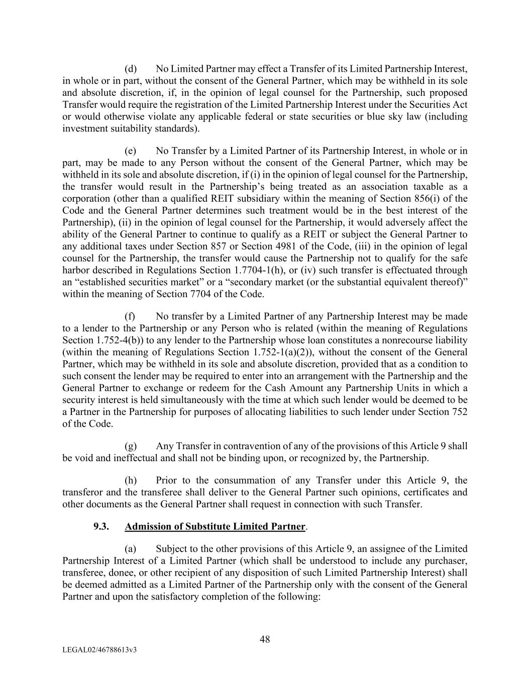 48 LEGAL02/46788613v3 (d) No Limited Partner may effect a Transfer of its Limited Partnership Interest, in whole or in part, without the consent of the General Partner, which may be withheld in its sole and absolute discretion, if, in the opinion of legal counsel for the Partnership, such proposed Transfer would require the registration of the Limited Partnership Interest under the Securities Act or would otherwise violate any applicable federal or state securities or blue sky law (including investment suitability standards). (e) No Transfer by a Limited Partner of its Partnership Interest, in whole or in part, may be made to any Person without the consent of the General Partner, which may be withheld in its sole and absolute discretion, if (i) in the opinion of legal counsel for the Partnership, the transfer would result in the Partnership’s being treated as an association taxable as a corporation (other than a qualified REIT subsidiary within the meaning of Section 856(i) of the Code and the General Partner determines such treatment would be in the best interest of the Partnership), (ii) in the opinion of legal counsel for the Partnership, it would adversely affect the ability of the General Partner to continue to qualify as a REIT or subject the General Partner to any additional taxes under Section 857 or Section 4981 of the Code, (iii) in the opinion of legal counsel for the Partnership, the transfer would cause the Partnership not to qualify for the safe harbor described in Regulations Section 1.7704-1(h), or (iv) such transfer is effectuated through an “established securities market” or a “secondary market (or the substantial equivalent thereof)” within the meaning of Section 7704 of the Code. (f) No transfer by a Limited Partner of any Partnership Interest may be made to a lender to the Partnership or any Person who is related (within the meaning of Regulations Section 1.752-4(b)) to any lender to the Partnership whose loan constitutes a nonrecourse liability (within the meaning of Regulations Section 1.752-1(a)(2)), without the consent of the General Partner, which may be withheld in its sole and absolute discretion, provided that as a condition to such consent the lender may be required to enter into an arrangement with the Partnership and the General Partner to exchange or redeem for the Cash Amount any Partnership Units in which a security interest is held simultaneously with the time at which such lender would be deemed to be a Partner in the Partnership for purposes of allocating liabilities to such lender under Section 752 of the Code. (g) Any Transfer in contravention of any of the provisions of this Article 9 shall be void and ineffectual and shall not be binding upon, or recognized by, the Partnership. (h) Prior to the consummation of any Transfer under this Article 9, the transferor and the transferee shall deliver to the General Partner such opinions, certificates and other documents as the General Partner shall request in connection with such Transfer. 9.3. Admission of Substitute Limited Partner. (a) Subject to the other provisions of this Article 9, an assignee of the Limited Partnership Interest of a Limited Partner (which shall be understood to include any purchaser, transferee, donee, or other recipient of any disposition of such Limited Partnership Interest) shall be deemed admitted as a Limited Partner of the Partnership only with the consent of the General Partner and upon the satisfactory completion of the following:
