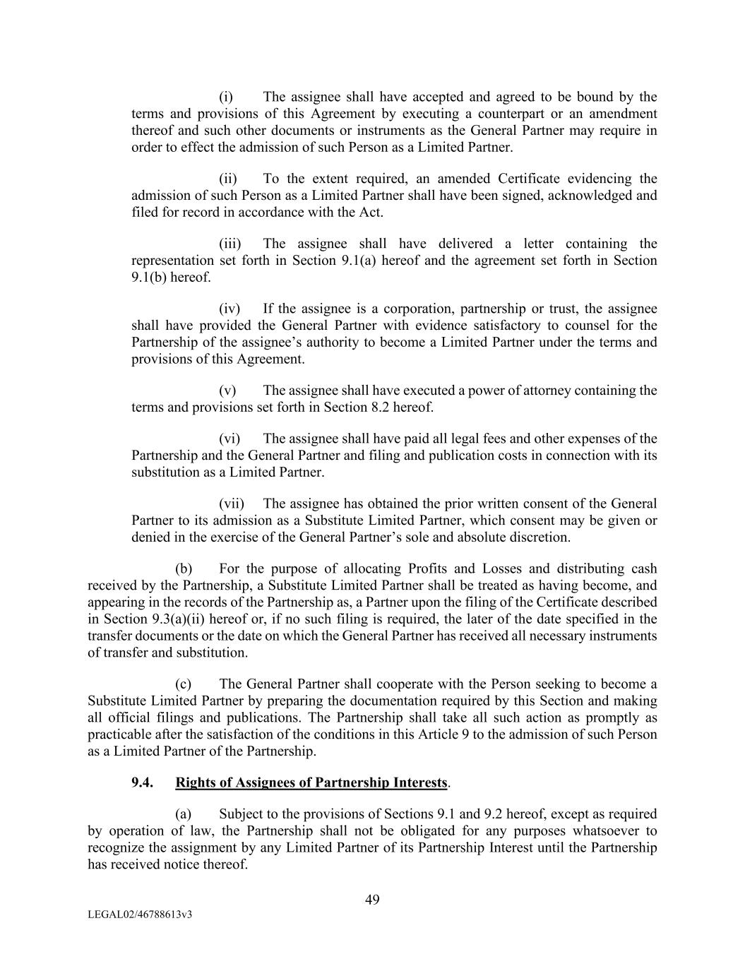 49 LEGAL02/46788613v3 (i) The assignee shall have accepted and agreed to be bound by the terms and provisions of this Agreement by executing a counterpart or an amendment thereof and such other documents or instruments as the General Partner may require in order to effect the admission of such Person as a Limited Partner. (ii) To the extent required, an amended Certificate evidencing the admission of such Person as a Limited Partner shall have been signed, acknowledged and filed for record in accordance with the Act. (iii) The assignee shall have delivered a letter containing the representation set forth in Section 9.1(a) hereof and the agreement set forth in Section 9.1(b) hereof. (iv) If the assignee is a corporation, partnership or trust, the assignee shall have provided the General Partner with evidence satisfactory to counsel for the Partnership of the assignee’s authority to become a Limited Partner under the terms and provisions of this Agreement. (v) The assignee shall have executed a power of attorney containing the terms and provisions set forth in Section 8.2 hereof. (vi) The assignee shall have paid all legal fees and other expenses of the Partnership and the General Partner and filing and publication costs in connection with its substitution as a Limited Partner. (vii) The assignee has obtained the prior written consent of the General Partner to its admission as a Substitute Limited Partner, which consent may be given or denied in the exercise of the General Partner’s sole and absolute discretion. (b) For the purpose of allocating Profits and Losses and distributing cash received by the Partnership, a Substitute Limited Partner shall be treated as having become, and appearing in the records of the Partnership as, a Partner upon the filing of the Certificate described in Section 9.3(a)(ii) hereof or, if no such filing is required, the later of the date specified in the transfer documents or the date on which the General Partner has received all necessary instruments of transfer and substitution. (c) The General Partner shall cooperate with the Person seeking to become a Substitute Limited Partner by preparing the documentation required by this Section and making all official filings and publications. The Partnership shall take all such action as promptly as practicable after the satisfaction of the conditions in this Article 9 to the admission of such Person as a Limited Partner of the Partnership. 9.4. Rights of Assignees of Partnership Interests. (a) Subject to the provisions of Sections 9.1 and 9.2 hereof, except as required by operation of law, the Partnership shall not be obligated for any purposes whatsoever to recognize the assignment by any Limited Partner of its Partnership Interest until the Partnership has received notice thereof.
